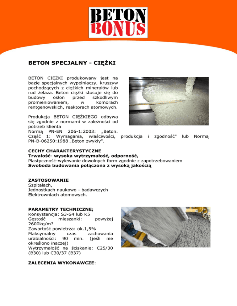 BETON SPECJALNY - CIĘŻKI BETON CIĘŻKI produkowany jest na bazie specjalnych wypełniaczy, kruszyw pochodzących z ciężkich minerałów lub rud żelaza. Beton ciężki stosuje się do budowy osłon przed szkodliwym promieniowaniem, w komorach rentgenowskich, reaktorach atomowych. Produkcja BETON CIĘŻKIEGO odbywa się zgodnie z normami w zależności od potrzeb klienta Normą PN-EN 206-1:2003: „Beton. Część 1: Wymagania, właściwości, produkcja PN-B-06250:1988 „Beton zwykły". i zgodność" lub CECHY CHARAKTERYSTYCZNE Trwałość- wysoka wytrzymałość, odporność, Plastyczność-wylewanie dowolnych form zgodnie z zapotrzebowaniem Swoboda budowania połączona z wysoką jakością ZASTOSOWANIE Szpitalach, Jednostkach naukowo - badawczych Elektrowniach atomowych. PARAMETRY TECHNICZNE; Konsystencja: S3-S4 lub K5 Gęstość mieszanki: powyżej 2600kg/m³ Zawartość powietrza: ok.1,5% Maksymalny czas zachowania urabialności: 90 min. (jeśli nie określono inaczej) Wytrzymałość na ściskanie: C25/30 (B30) lub C30/37 (B37) ZALECENIA WYKONAWCZE: Normą Beton powinien być wbudowany w przeciągu 90 minut od pierwszego kontaktu wody z cementem. Do mieszanki betonowej nie wolno dodawać wody. Zawsze należy pamiętać o właściwej pielęgnacji młodego betonu (świeżo wykonanego elementu): zabezpieczaniu go przed utratą wody (działaniem słońca i wiatru), nadmiernym nagrzaniu lub przemrożeniu. Aby otrzymać dobry beton w konstrukcji nie wystarczy jedynie ułożyć i zagęścić odpowiednią mieszankę betonową. Niezbędna jest pielęgnacja tego betonu, szczególnie na początku jego twardnienia. Niewłaściwa pielęgnacja lub jej brak będzie powodować obniżeniem jakości i trwałości betonu, a co za tym idzie i całej konstrukcji. Czynności pielęgnacyjne powinny zapewnić świeżemu betonowi ochronę przed: zbyt niską lub wysoką temperaturą otoczenia, wiatrem, zbyt niską wilgotnością, intensywnymi opadami (kiedy beton jest jeszcze plastyczny),przemarzaniem powierzchni lub całości konstrukcji betonowej.