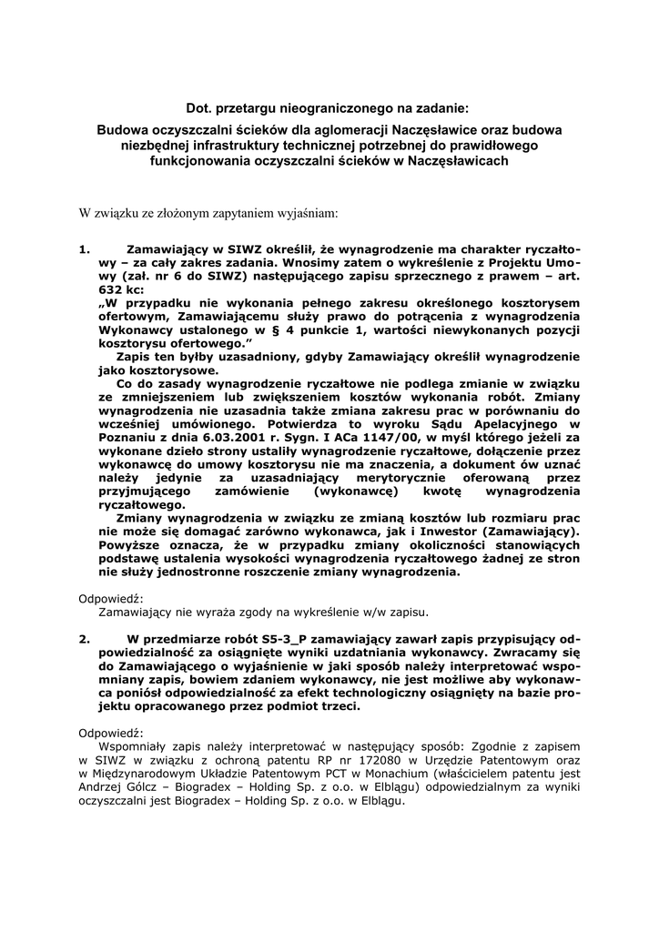 Dot. przetargu nieograniczonego na zadanie: Budowa oczyszczalni ścieków dla aglomeracji Naczęsławice oraz budowa niezbędnej infrastruktury technicznej potrzebnej do prawidłowego funkcjonowania oczyszczalni ścieków w Naczęsławicach W związku ze złożonym zapytaniem wyjaśniam: 1. Zamawiający w SIWZ określił, że wynagrodzenie ma charakter ryczałtowy – za cały zakres zadania. Wnosimy zatem o wykreślenie z Projektu Umowy (zał. nr 6 do SIWZ) następującego zapisu sprzecznego z prawem – art. 632 kc: „W przypadku nie wykonania pełnego zakresu określonego kosztorysem ofertowym, Zamawiającemu służy prawo do potrącenia z wynagrodzenia Wykonawcy ustalonego w § 4 punkcie 1, wartości niewykonanych pozycji kosztorysu ofertowego.” Zapis ten byłby uzasadniony, gdyby Zamawiający określił wynagrodzenie jako kosztorysowe. Co do zasady wynagrodzenie ryczałtowe nie podlega zmianie w związku ze zmniejszeniem lub zwiększeniem kosztów wykonania robót. Zmiany wynagrodzenia nie uzasadnia także zmiana zakresu prac w porównaniu do wcześniej umówionego. Potwierdza to wyroku Sądu Apelacyjnego w Poznaniu z dnia 6.03.2001 r. Sygn. I ACa 1147/00, w myśl którego jeżeli za wykonane dzieło strony ustaliły wynagrodzenie ryczałtowe, dołączenie przez wykonawcę do umowy kosztorysu nie ma znaczenia, a dokument ów uznać należy jedynie za uzasadniający merytorycznie oferowaną przez przyjmującego zamówienie (wykonawcę) kwotę wynagrodzenia ryczałtowego. Zmiany wynagrodzenia w związku ze zmianą kosztów lub rozmiaru prac nie może się domagać zarówno wykonawca, jak i Inwestor (Zamawiający). Powyższe oznacza, że w przypadku zmiany okoliczności stanowiących podstawę ustalenia wysokości wynagrodzenia ryczałtowego żadnej ze stron nie służy jednostronne roszczenie zmiany wynagrodzenia. Odpowiedź: Zamawiający nie wyraża zgody na wykreślenie w/w zapisu. 2. W przedmiarze robót S5-3_P zamawiający zawarł zapis przypisujący odpowiedzialność za osiągnięte wyniki uzdatniania wykonawcy. Zwracamy się do Zamawiającego o wyjaśnienie w jaki sposób należy interpretować wspomniany zapis, bowiem zdaniem wykonawcy, nie jest możliwe aby wykonawca poniósł odpowiedzialność za efekt technologiczny osiągnięty na bazie projektu opracowanego przez podmiot trzeci. Odpowiedź: Wspomniały zapis należy interpretować w następujący sposób: Zgodnie z zapisem w SIWZ w związku z ochroną patentu RP nr 172080 w Urzędzie Patentowym oraz w Międzynarodowym Układzie Patentowym PCT w Monachium (właścicielem patentu jest Andrzej Gólcz – Biogradex – Holding Sp. z o.o. w Elblągu) odpowiedzialnym za wyniki oczyszczalni jest Biogradex – Holding Sp. z o.o. w Elblągu.