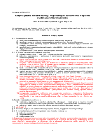 brzmienie od 2013-12-31 Rozporządzenie Ministra Rozwoju Regionalnego i Budownictwa w sprawie ewidencji gruntów i budynków z dnia 29 marca 2001 r. (Dz.U. Nr 38, poz. 454) ze zm. Na podstawie art. 26 ust. 2 ustawy z dnia 17 maja 1989 r. – Prawo geodezyjne i kartograficzne (Dz. U. z 2000 r. Nr 100, poz. 1086 i Nr 120, poz. 1268) zarządza się, co następuje: Rozdział 1. Przepisy ogólne § 1. Rozporządzenie określa: 1) sposób zakładania ewidencji gruntów i budynków, zwanej dalej "ewidencją", 2) sposób prowadzenia ewidencji oraz szczegółowe zasady wymiany danych ewidencyjnych, 3) szczegółowy zakres informacji objętych ewidencją oraz zakres informacji objętych rejestrem cen i wartości nieruchomości, 4) sposób i terminy sporządzania powiatowych, wojewódzkich i krajowych zestawień zbiorczych danych objętych ewidencją, 5) rodzaje budynków i lokali, których nie wykazuje się w ewidencji. § 2. 1. Użyte w rozporządzeniu określenia oznaczają: 1) ustawa – ustawę z dnia 17 maja 1989 r. – Prawo geodezyjne i kartograficzne, 2) jednostka organizacyjna – państwowe i samorządowe jednostki organizacyjne nieposiadające osobowości prawnej, 3) osoba – osoby fizyczne, osoby prawne oraz jednostki organizacyjne niebędące osobami prawnymi, którym ustawa przyznaje zdolność prawną, 4) budynek – obiekt budowlany, który jest budynkiem w rozumieniu przepisów rozporządzenia Rady Ministrów z dnia 30 grudnia 1999 r. w sprawie Polskiej Klasyfikacji Obiektów Budowlanych (PKOB) (Dz. U. Nr 112, poz. 1316 oraz z 2002 r. Nr 18, poz. 170),” 5) lokal – samodzielny lokal mieszkalny lub lokal o innym przeznaczeniu w rozumieniu przepisów ustawy z dnia 24 czerwca 1994 r. o własności lokali (Dz.U. z 2000 r. Nr 80, poz. 903), 6) wartość gruntu, wartość budynku i wartość lokalu – wartość katastralną nieruchomości lub jej części składowej ustaloną na zasadach określonych w ustawie z dnia 21 sierpnia 1997 r. o gospodarce nieruchomościami (Dz.U. z 2000 r. Nr 46, poz. 543), 7) baza danych ewidencyjnych – bazę danych, o której mowa w art. 4 ust. 1a pkt 2 ustawy, 8) granica działki ewidencyjnej – część obwodu działki ewidencyjnej, w postaci linii łamanej lub odcinka, wspólną dla dwóch sąsiadujących ze sobą działek ewidencyjnych lub pokrywającą się z granicą państwa – w przypadku działek ewidencyjnych przylegających do tej granicy, 9) izba – pomieszczenie w lokalu mieszkalnym, oddzielone od innych pomieszczeń stałymi ścianami sięgającymi od podłogi do sufitu, o powierzchni nie mniejszej niż 4 m2, z bezpośrednim oświetleniem dziennym w ścianie zewnętrznej budynku (oknem lub oszklonymi drzwiami); za izby uznaje się nie tylko pokoje, ale również kuchnie spełniające powyższe kryteria; za izby nie uznaje się – bez względu na wielkość powierzchni i sposób oświetlenia – przedpokojów, holi, łazienek, ubikacji, spiżarni, werand, ganków oraz schowków, 10) kondygnacja, kondygnacja nadziemna oraz kondygnacja podziemna – odpowiednio kondygnację, kondygnację nadziemną lub kondygnację podziemną, o których mowa w przepisach wydanych na podstawie art. 7 ust. 2 pkt 1 ustawy z dnia 7 lipca 1994 r. – Prawo budowlane (Dz. U. z 2013 r. poz. 1409). 2. Ilekroć w rozporządzeniu jest mowa o: 1) właścicielu, użytkowniku wieczystym, użytkowniku, władającym – należy przez to rozumieć również odpowiednio współwłaściciela, współużytkownika wieczystego, współużytkownika, współwładającego, 2) staroście – należy przez to rozumieć również prezydenta miasta na prawach powiatu. § 3. uchyla się § 3; § 4. Ewidencja obejmuje całe terytorium Rzeczypospolitej Polskiej, z wyjątkiem morza terytorialnego. § 5. 1. Jednostkami powierzchniowymi podziału kraju dla celów ewidencji są: 1) jednostka ewidencyjna, 2) obręb ewidencyjny, 3) działka ewidencyjna. 2. Dopuszcza się stosowanie pomocniczej jednostki podziału kraju dla celów ewidencji, obejmującej część obrębu ewidencyjnego prezentowanego pod względem kartograficznym na jednym arkuszu mapy ewidencyjnej, zwanej dalej „arkuszem ewidencyjnym”, w przypadku gdy w ewidencji prowadzonej przed wejściem w życie rozporządzenia taka jednostka powierzchniowa była stosowana. 1 § 6. 1. Jednostkę ewidencyjną stanowi obszar gruntów położonych w granicach administracyjnych gminy, a w przypadku gdy w skład gminy wchodzi miejscowość o statusie miasta – również w granicach administracyjnych miasta. 2. W miastach, w których utworzone zostały dzielnice, jako jednostki pomocnicze gminy, jednostką ewidencyjną może być obszar dzielnicy lub kilku sąsiadujących ze sobą dzielnic. 3. Jednostkę ewidencyjną określa nazwa własna oraz identyfikator krajowego rejestru urzędowego podziału terytorialnego kraju, prowadzonego na podstawie przepisów o statystyce publicznej. § 7. 1. Jednostka ewidencyjna dzieli się na obręby ewidencyjne, zwane dalej „obrębami”. 2. Przy ustalaniu granic obrębów uwzględnia się przebieg ich granic ustalony na podstawie przepisów obowiązujących przed wejściem w życie rozporządzenia oraz przebieg granic innych jednostek podziału terytorialnego państwa, w szczególności rejonów statystycznych, obwodów spisowych, sołectw, dzielnic i osiedli, ustalony na podstawie przepisów odrębnych. 3. Na obszarach wiejskich obręb powinien obejmować obszar wsi oraz przyległe do tej jednostki osadniczej i z nią związane obiekty fizjograficzne. W szczególnych przypadkach odrębnym obrębem może być część obszaru wsi w granicach sołectwa lub obszar wyodrębnionej organizacyjnie części Państwowego Gospodarstwa Leśnego Lasy Państwowe. 4. Na obszarach miast obręb może obejmować całe miasto lub jego wydzieloną część, w szczególności w granicach dzielnicy, osiedla, zespołu urbanistycznego lub obiektu fizjograficznego. 5. Na odcinkach wybrzeża morskiego granice obrębów po
