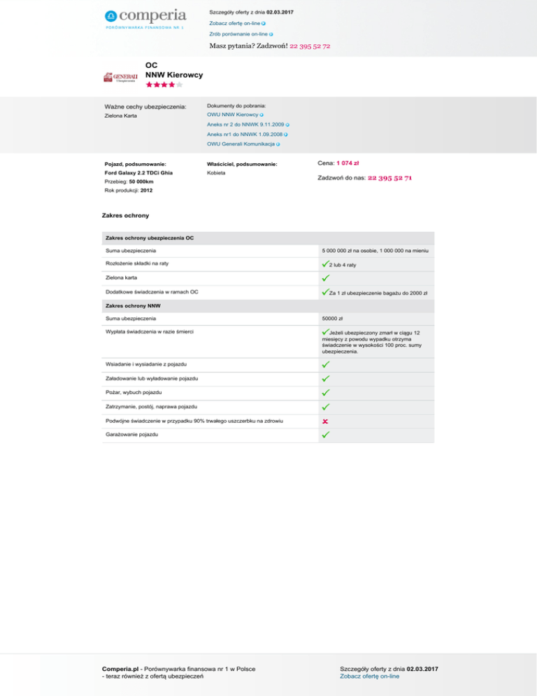 Szczegóły oferty z dnia 02.03.2017 Zobacz ofertę on-line Zrób porównanie on-line Masz pytania? Zadzwoń! 22 395 52 72 OC NNW Kierowcy Ważne cechy ubezpieczenia: Dokumenty do pobrania: Zielona Karta OWU NNW Kierowcy Aneks nr 2 do NNWK 9.11.2009 Aneks nr1 do NNWK 1.09.2008 OWU Generali Komunikacja Pojazd, podsumowanie: Właściciel, podsumowanie: Ford Galaxy 2.2 TDCi Ghia Kobieta Przebieg: 50 000km Cena: 1 074 zł Zadzwoń do nas: 22 395 52 71 Rok produkcji: 2012 Zakres ochrony Zakres ochrony ubezpieczenia OC Suma ubezpieczenia Rozłożenie składki na raty 5 000 000 zł na osobie, 1 000 000 na mieniu 2 lub 4 raty Zielona karta Dodatkowe świadczenia w ramach OC Za 1 zł ubezpieczenie bagażu do 2000 zł Zakres ochrony NNW Suma ubezpieczenia 50000 zł Wypłata świadczenia w razie śmierci Jeżeli ubezpieczony zmarł w ciągu 12 miesięcy z powodu wypadku otrzyma świadczenie w wysokości 100 proc. sumy ubezpieczenia. Wsiadanie i wysiadanie z pojazdu Załadowanie lub wyładowanie pojazdu Pożar, wybuch pojazdu Zatrzymanie, postój, naprawa pojazdu Podwójne świadczenie w przypadku 90% trwałego uszczerbku na zdrowiu Garażowanie pojazdu Comperia.pl - Porównywarka finansowa nr 1 w Polsce - teraz również z ofertą ubezpieczeń Powered by TCPDF (www.tcpdf.org) Szczegóły oferty z dnia 02.03.2017 Zobacz ofertę on-line