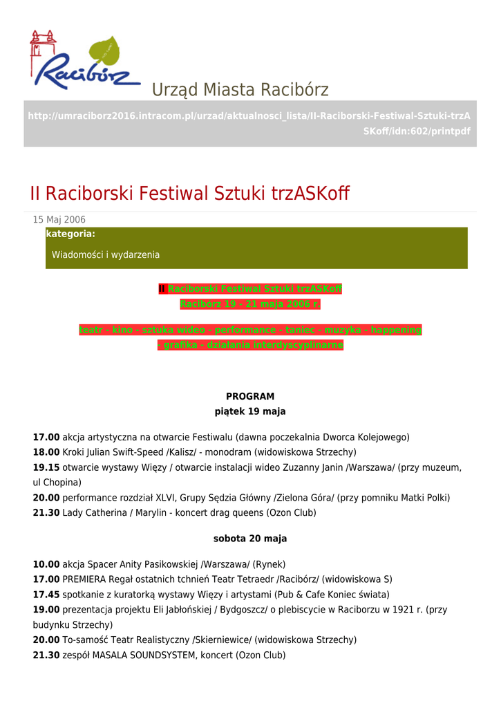 Urząd Miasta Racibórz http://umraciborz2016.intracom.pl/urzad/aktualnosci_lista/II-Raciborski-Festiwal-Sztuki-trzA SKoff/idn:602/printpdf II Raciborski Festiwal Sztuki trzASKoff 15 Maj 2006 kategoria: Wiadomości i wydarzenia II Raciborski Festiwal Sztuki trzASKoff Racibórz 19 - 21 maja 2006 r. teatr - kino - sztuka wideo - performance - taniec - muzyka - happening - grafika - działania interdyscyplinarne PROGRAM piątek 19 maja 17.00 akcja artystyczna na otwarcie Festiwalu (dawna poczekalnia Dworca Kolejowego) 18.00 Kroki Julian Swift-Speed /Kalisz/ - monodram (widowiskowa Strzechy) 19.15 otwarcie wystawy Więzy / otwarcie instalacji wideo Zuzanny Janin /Warszawa/ (przy muzeum, ul Chopina) 20.00 performance rozdział XLVI, Grupy Sędzia Główny /Zielona Góra/ (przy pomniku Matki Polki) 21.30 Lady Catherina / Marylin - koncert drag queens (Ozon Club) sobota 20 maja 10.00 akcja Spacer Anity Pasikowskiej /Warszawa/ (Rynek) 17.00 PREMIERA Regał ostatnich tchnień Teatr Tetraedr /Racibórz/ (widowiskowa S) 17.45 spotkanie z kuratorką wystawy Więzy i artystami (Pub & Cafe Koniec świata) 19.00 prezentacja projektu Eli Jabłońskiej / Bydgoszcz/ o plebiscycie w Raciborzu w 1921 r. (przy budynku Strzechy) 20.00 To-samość Teatr Realistyczny /Skierniewice/ (widowiskowa Strzechy) 21.30 zespół MASALA SOUNDSYSTEM, koncert (Ozon Club) niedziela 21 maja 17.00 Trylogia drobiowa Teatr Realistyczny /Skierniewice/ (widowiskowa Strzechy) 18.00 Ogólnopolski Konkurs Młodego Filmu Offowego i Sztuki Wideo, pokazy finałowe (kameralna Strzechy) 20.00 Niedoistnienie Sylwia Hanff /Warszawa/, spektakl tańca butoh (kameralna S) 20.30 rozmowa o tańcu butoh / spotkanie z teatrami występującymi na festiwalu (Pub & Cafe Koniec świata) 21.00 werdykt Jury konkursu filmowego / zamknięcie Festiwalu (kameralna Strzechy) Więzy - projekt-wystawa w przestrzeni miejskiej (Racibórz - Stare Miasto i okolice) kuratorka: Agnieszka Rayzacher /Warszawa/ partner: lokal_30 /Warszawa/ "To, co kogoś krępuje, co komuś ciąży, dokucza" lub "to, co wiąże, łączy, jednoczy; związek, powiązanie, spójnia" - tak znaczenie słowa "więzy" wyjaśnia Słownik Języka Polskiego. Dualizm ten trafia jednocześnie istotę pojęcia. Więzy to bezpieczeństwo, bliskość i błogość. Ale więzy to również zagrożenie, ograniczenie, opresja. Granica między tymi dwoma stanami, może okazać się bardzo płynna. A zatem więzy, dotyczą paradoksalnie sytuacji znajdującej się "pomiędzy" i wymykającej się prostej i jednoznacznej definicji. Stąd pokusa, aby za pomocą języka sztuki zaprezentować wielorakie możliwości interpretacji tego pojęcia. Dla uczestników projektu - artystów oraz kuratorki - Racibórz jest miejscem nieznanym. Pomysł rozpoczęcia dyskusji na temat więzów może zatem zdawać się dość ryzykowny. Gdy myślimy o nich w kontekście danego miejsca pojawiają się klisze w postaci przywiązania do ziemi, miejsca, miasta. Cóż na ten temat mogą wiedzieć przybysze "z zewnątrz"? Wędrowiec, obcy, flâneur, wjeżdżając do miasta ocenia. Rozgląda się, lustruje. Jego sytuacja pozwala mu dostrzec rzeczy wypierane lub niezauważane przez mieszkańców. Być może już po kilku dniach jest w stanie dostrzec sieć połączeń wiążących mieszkańców z ich miastem lub przeciwnie - dziwną obcość, która sprawia, że traktują je w sposób użytkowy. artyści: Anita Pasikowska, akcja Spacer, miejsce: Rynek - sobota - początek godz. 10.00 Grupa Performerska Sędzia Główny, performance, miejsce: przy pomniku Matki Polki - piątek - godz. 20.00 Elżbieta Jabłońska, akcja powtórzenia plebiscytu po II powstaniu śląskim w 1921 r. miejsce: przy budynku Strzechy i Stare Miasto - piątek i sobota Zuzanna Janin, Pomiędzy - projekcja wideo na ścianie kamienicy, miejsce: wnęka miedzy muzeum a kamienicą na ul. Chopina - piątek, sobota, niedziela miejsca wydarzeń: Dom Kultury Strzecha, Racibórz, ul. Londzina 34 Pub & Cafe Koniec świata, Racibórz, ul. Londzina 34 klub muzyczny OzonClub, Racibórz, ul. Reymonta 14 poczekalnia Dworca PKP, wejście z peronu I, Racibórz, pl. Dworcowy ceny biletów: karnety na cały festiwal: ulgowy 29 zł, normalny 49 zł spektakle teatralne: ulgowy 4 zł, normalny 7 zł Masala Soundsystem: ulgowy 8 zł, normalny 12 zł Drag-Queen: ulgowy 7 zł, normalny 10 zł Bilety i karnety dostępne od 12 maja w OzonClub i Pub Cafe Koniec świata oraz w trakcie Festiwalu pozostałych informacji szukaj tu: www.raciborz.com.pl www.ask.org.pl patronaty medialne: DZIENNIK INTERNETOWY raciborz.com.pl serwis kultury niezależnej INDEPENDENT.PL TVP 3 KATOWICE magazyn FLUID magazyn EXIT nowa sztuka w Polsce radio 90 FM radio Park FM radio internetowe MITTENDRIN sponsorzy: METRO UNDERGROUND SOLARIUM Laguna BANK SPÓŁDZIELCZY w Raciborzu BP - SERWIS GS "SAMOPOMOC CHŁOPSKA" w Raciborzu projekt "trzASKoff i okolice" dofinansowany przez URZĄD MIASTA RACIBORZA oraz STAROSTWO POWIATOWE w RACIBORZU organizator: Raciborskie Stowarzyszenie Kulturalne ASK /[email protected]/ partnerzy: lokal_30 Warszawa Stowarzyszenie Artystów i Pozdróżników Grupa Rosynant Racibórz klub muzyczny OzonClub Racibórz Pub Cafe Koniec Świata Racibórz