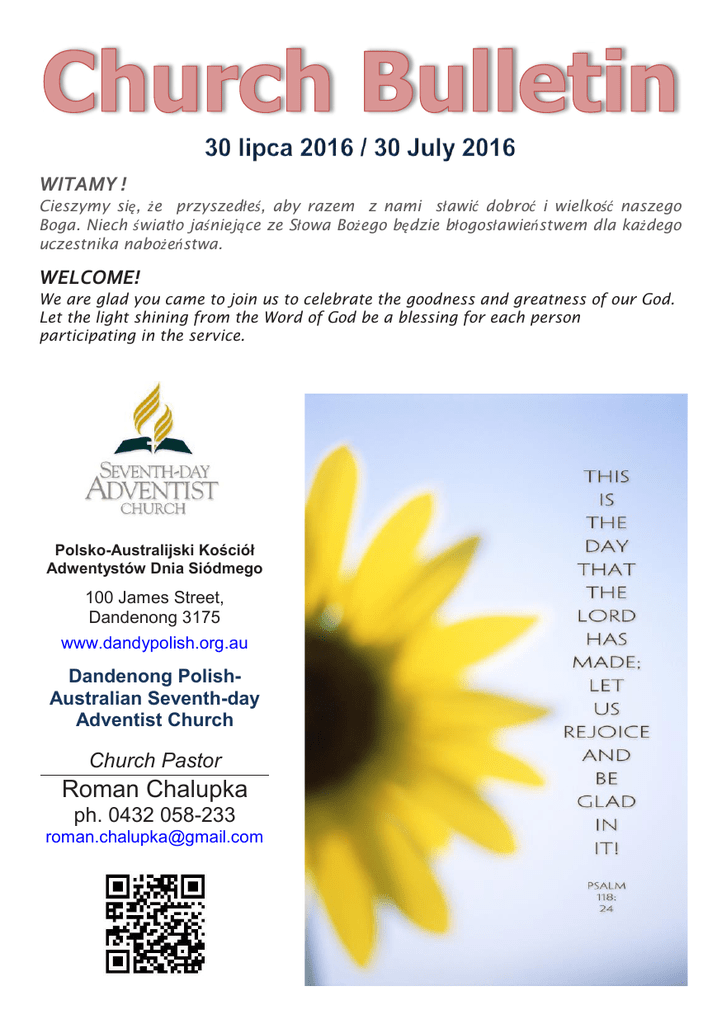 WITAMY ! Cieszymy się, że przyszedłeś, aby razem z nami sławić dobroć i wielkość naszego Boga. Niech światło jaśniejące ze Słowa Bożego będzie błogosławieństwem dla każdego uczestnika nabożeństwa. WELCOME! We are glad you came to join us to celebrate the goodness and greatness of our God. Let the light shining from the Word of God be a blessing for each person participating in the service. Polsko-Australijski Kościół Adwentystów Dnia Siódmego 100 James Street, Dandenong 3175 www.dandypolish.org.au Dandenong PolishAustralian Seventh-day Adventist Church Church Pastor Roman Chalupka ph. 0432 058-233 [email protected] program zachody słońca / sunset times Dzisiaj / tonight 17: 31 9:30 Studium Biblijne w grupach Piątek za tydzień / next Friday 17:36 10:30 Apel Misyjny 11:00 Kazanie pr Paweł Ustupski Tytuł kazania: ” Świat ich nie był godzien” Hebr. 11:38-40 Dary: Dzisiaj: Edukacja/Camping Ministry. Za tydzień: Coroczna ofiara na Globalną Misję Dyżury 30 lipca Prowadzenie Szk. Sob: Tadeusz Kania Za tydzień: Andrzej Tomasiuk Zebranie nauczycieli 29/07/16 – Andrzej Tomasiuk Koordynator Nabożeństwa: Ivanka Millen Za tydzień: Alan Kfoury Tłumaczenie kazania: - Jacek Patryarcha Za tydzień: Michał Wawruszak Informacje dla Zboru • POTRZEBNI WOLONTARIUSZE. W dalszym ciągu poszukujemy ochotników do współpracy z sąsiednim Kościółem Baptystów w obsłudze kuchni serwującej w niedzielne wieczory obiady dla dla bezdomnych, samotnych matek, uzależnionych od narkotyków i innych zmarginesowanych członków lokalnej społeczności oraz na oferowaniu im przyjaźni i poparcia. Więcej informacji i zgłoszenia - H. Wawruszak. • BIBLIE DLA VANUATU. Dziękujemy wszystkim ofiarodawcom za Biblie i dary przeznaczone do wysłania na Vanuatu. Wasz dar przyniesie wiele radości braciomi i siostrom mieszkającym na tej wyspie. • ARNION. Słowo arnion znaczy mała owieczka/baranek i jest ekskluzywnie używane przez apostoła Jana. Kanał UKHopeTV wyprodukował dziewięcioczęściowy serial pokazujący Baranka jako centralną postać Księgi Objawienia św. Jana. Ten interesujący film można obejrzeć on-line po tym adresem: http://www.victorianadventist.tv/arnion . • RELEASE - KONFERENCJA DLA KOBIET. Jeszcze jest czas aby zapisać się na Women’s RELEASE Conference! Wszystkie detale są na witrynie http://vic.adventist.org.au/wm-spiritual-retreat . Jest to wspaniała okazja aby razem z kobietami z całej Australii spędzić czas i uczyć się od niezwykłych mówców takich jak Raquel Arrais, Brendan Pratt and Trafford Fischer. • RECITAL SKRZYPCOWY. 13 sierpnia, o godz. 19 w naszym kościele Linda Gilbert australijska skrzypaczka, studentka Państwowego Konserwatorium im. Czajkowskiego w Moskwie wykona najbardziej lubiane klasyczne kompozycje Mozarta, Ravela jak również arcydzieła Henryka Wieniawskiego. Akompaniuje pianista Krzysztof Malek. Po koncercie będą zbrane dary, które pomogą artystce w jej studiach na czwartym roku Konserwatorium. • PR MARK WILSON. Pastor Mark Wilson, znany ewangelista z Queensland będzie gościł w zborze Oakleigh. Zapraszamy na spotkanie z nim 13 sierpnia br, o godz 14:30 (pr P. Ustupski). • PO ZDROWIE INACZEJ. Kolejne spotkanie w tej serii będzie miało miejsce w drugi wtorek sierpnia (9/08/16) o 18:30. Mówcą będzie Wayne Guszich, tytuł prelekcji: Naturalne terapie – ciąg dalszy. Zapraszamy. • SEMINARIA “TAJEMNICE PROROCTW”. Jest to kontynuacja programu ”Chrismas in July”. Seminaria będą prowadzone w soboty o godz 16:00 po angielsku oraz w środy o godz. 18:00 po polsku. Pierwsze seminarium już w przyszłą sobotę 6 sierpnia a następnie to samo seminarium po polsku w środę 10 sierpnia. Serdecznie zapraszamy. programme 9:30 Bible Study in small groups 10:45 Mission Appeal 11:00 Divine Service pr Paweł Ustupski Sermon’s title: “Of whom the World was not worthy“ Hebrew 11:38-40 Offering: Today: Education/Camping ministry. Next week: Annual Sacrifice (Global Mission) Duty Roster July 30th Sabbath School Leading: Tadeusz Kania Next week: Andrzej Tomasiuk Teacher’s meeting 29/07/16 – Andrzej Tomasiuk Worship Coordinator: Ivanka Millen Next week: Alan Kfoury Sermon translation: Jacek Patryarcha Next week: Michał Wawruszak Church announcements • VOLUNTEERS NEEDED. We are still looking for volunteers willing to help the neighbouring Baptist Church in running the kitchen, which serves meals every Sunday night to homeless, single mothers, drug dependant and other marginalized groups in local community. Please contact Henry Wawruszak for more information. • BIBLES FOR VANUATU. We would like to thank all who donated Bibles or money for this project. Your gift will bring much joy to our brothers/sisters in Vanuatu. • ARNION – THE LAMB IN REVELATION. Arnion – seeing the Lamb at the centre of Revelation. If you would like to see the video series featured in July’s edition of Adventist World, you can find the UK Hope version on our Victorian Adventist TV site. An interesting nine part series. Go to http://www.victorianadventist.tv/arnion . • WOMEN’S RELEASE CONFERENCE. There’s still time to register for the AUC Women’s RELEASE Conference! For more details and registration forms please use the link: http://vic.adventist.org.au/wm-spiritual-retreat or simply search Women’s AUC Release Conference in Google. This is an incredible opportunity to spend time with other women from all over Australia and to learn from some incredible speakers including: Raquel Arrais, Brendan Pratt and Trafford Fischer. If you would like a registration form emailed to you or more information please contact Shonet at [email protected] or on 9264 7720. Register today and tell your friends! • LINDA GILBERT IN RECITAL. Fundraising concert. Associate Artist: Krzysztof Malek, piano. Moscow-based Australian violinist Linda Gilbert presents a recital of best-loved violin classics from Mozart to Ra