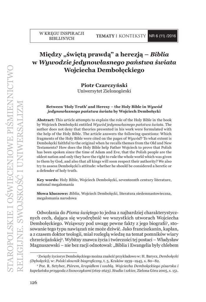 STAROPOLSKIE I OŚWIECENIOWE PIŚMIENNICTWO RELIGIJNE. SWOJSKOŚĆ I UNIWERSALIZM W KRĘGU INSPIRACJI BIBLIJNYCH TEMATY I KONTEKSTY NR 6 (11) /2016 Między „świętą prawdą” a herezją – Biblia w Wywodzie jedynowłasnego państwa świata Wojciecha Dembołęckiego Piotr Czarczyński Uniwersytet Zielonogórski Between ‘Holy Truth’ and Heresy – the Holy Bible in Wywód jedynowłasnego państwa świata by Wojciech Dembołęcki Abstract: This article attempts to explain the role of the Holy Bible in the book by Wojciech Dembołęcki entitled Wywód jedynowłasnego państwa świata. The author does not deny that theories presented in his work were formulated with the help of the Holy Bible. The article answers the following questions: Which fragments of the Holy Bible were cited on the pages of Wywód? To what extent is Dembołęcki faithful to the original when he recalls themes from the Old and New Testaments? How does the Holy Bible help Father Wojciech to prove that Polish has been spoken since the time of Adam and Eve, that the Polish people are the oldest nation and only they have the right to rule the whole world which was given to them by God, and also that all kings will soon respect their authority? We also try to assess Dembołęcki’s attitude: whether he should be considered a heretic or a defender of holy truth. Key words: Holy Bible, Wojciech Dembołęcki, seventeenth century literature, national megalomania Słowa kluczowe: Biblia, Wojciech Dembołęcki, literatura siedemnastowieczna, megalomania narodowa Odwołania do Pisma świętego to jedna z najbardziej charakterystycznych cech, dająca się wyodrębnić we wszystkich utworach Wojciecha Dembołęckiego. Wziąwszy pod uwagę pewne fakty z jego biografii1, stosowanie tego typu nawiązań nie może dziwić. Jako franciszkanin, kapłan, a z czasem doktor teologii, miał rozległą wiedzę na temat pomników wiary chrześcijańskiej2. Wybitny znawca życia i twórczości tej postaci – Władysław Magnuszewski – nie bez racji odnotował: „Biblia i Ewangelia były chlebem 1 Zwięzły życiorys Dembołęckiego można znaleźć przykładowo w: H. Barycz, Dembołęcki (Dębołęcki), w: Polski słownik biograficzny, t. 5, Kraków 1939–1945, s. 80–82. 2 Por. R. Sztyber, Piórem, kropidłem i szablą. Wojciecha Dembołęckiego pisarska i kapelańska przygoda z lisowczykami (1619-1623). Studia i szkice, Zielona Góra 2005, s. 151. 126 Między „świętą prawdą” a herezją – „Biblia” w „Wywodzie jedynowłasnego…” codziennym Dembołęckiego”3. Świetna znajomość natchnionych ksiąg bardzo mu pomogła w udoskonaleniu warsztatu pisarskiego. Ponieważ dla duchownego nie stanowiły one żadnej tajemnicy, często używał ich jako narzędzia wspierającego tezy eksponowane na kartach swoich dzieł. Najpełniej uwidoczniło się to w Wywodzie jedynowłasnego państwa świata (1633), w którym Słowo Boże odegrało kluczową rolę, będąc jednym z trzech narzędzi służących do budowania obrazu dziejów. Informuje nas o tym drugi rozdział Perspektywy – wstępu metodologicznego, poprzedzającego właściwą treść traktatu. Czytamy tam: wybierając tedy kwiecie pierwotnej szczytyckiej istoryjej (która sama tylko prawie ma jedyny zapach prawdy ś.) między tak gęstem cierniem rozmaitych fałszów, nie widzę inszych do tego instrumentów, jeno Bibliją Ś., głos pospolity a etymon, to jest wied abo wiadomość imion (290–291)4. Rzeczywiście, czytelnicy osobliwej „książeczki” odsyłani są do Starego i Nowego Testamentu niezwykle często. Cytaty biblijne pojawiają się niemal na każdej stronie, mało kiedy jednak odpowiadają swej oryginalnej formie. Zazwyczaj autor nieznacznie, ale jakże znacząco (!) je modyfikuje, aby najpełniej wpisywały się w naczelne przesłanie utworu. Mimo zapewnień autora, że objaśnia święte zwoje „według litery, po istorycku”5 (292) oraz że ich wykładnia „nie jest przeciwko Doktorom Świętym i duchownemu ich wykładowi” (292), okazuje się, iż Dembołęcki potraktował biblijne relacje z właściwym sobie dystansem: reinterpretował wersety, naciągał lub pomijał fakty niewygodne dla swoich teorii6. „Nie interesowały [go – przyp. P.Cz.] detale kanonu, gdy kolidowały z tokiem myśli laudacyjnego przedsięwzięcia”7. Odwołując się do Biblii, niemal zawsze balansował na cienkiej linii między prawdą a herezją. Poprzyjmy to przykładami. Znamienne, iż już pierwsza perykopa pojawiająca się w tekście Wywodu pochodzi z… drugiej, pseudoepigraficznej Księgi Ezdrasza (odnotowywanej też jako czwarta8) wyłączonej z kanonu usankcjono3 W. Magnuszewski, Wokół kozaka Płachty, w: Z zagadnień historii literatury, red. L. Ludorowski, Zielona Góra 1976, s. 69. 4 Wszystkie fragmenty Wywodu jedynowłasnego państwa świata cytowane w tym artykule pochodzą z: W. Dembołęcki, Wywód jedynowłasnego państwa świata, w: R. Sztyber, „Skądże to zbłaźnienie świata?” Wojciecha Dembołęckiego „Wywód jedynowłasnego państwa świata” (studium monograficzne i edycja krytyczna dzieła), Zielona Góra 2012. W nawiasach podaję strony, na których znajduje się cytowany fragment. 5 Termin „istoryja” stworzył Dembołęcki w opozycji do „historyi”. Ten pierwszy oznacza „istą rzecz”, czyli prawdę, podczas gdy „historyjaństwo” to nic innego jak bajdurzenie, zmyślanie. Zob. R. Sztyber, „Skądże to zbłaźnienie świata?”…, s. 290, przyp. 125, 126. 6 Takie podejście do Biblii zaświadczają już Przewagi elearów polskich napisane przez Dembołęckiego dziesięć lat wcześniej, o czym szeroko pisze Radosław Sztyber. Zob. tenże, Piórem, kropidłem i szablą…, s. 151–181. 7 R. Sztyber, „Skądże to zbłaźnienie świata”…, s. 122. 8 Właśnie tak dokumentuje ją Dembołęcki. 127 Piotr Czarczyński wanego na soborze trydenckim9. Cytując – w nieco odmiennej formie – rozdział 2, w