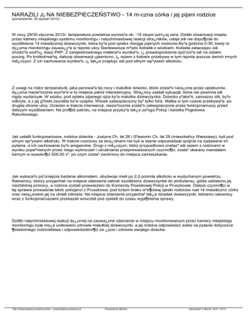 NARAZILI J¡ NA NIEBEZPIECZEÑSTWO - 14 m-czna córka i jej pijani rodzice (poniedzia³ek, 30 styczeñ 2012) - W nocy 29/30 stycznia 2012r. temperatura powietrza wynosi³a ok. -15 stopni poni¿ej zera. Dziêki obserwacji miasta przez kamery miejskiego systemu monitoringu i natychmiastowej reakcji stra¿ników, udaje siê nie dopu¶ciæ do wyziêbienia 14 miesiêcznej dziewczynki, która by³a pod opiek± dwojga pijanych rodziców.By³a godzina 0:30, kiedy to dy¿urna monitoringu zauwa¿y³a w rejonie ulicy Sienkiewicza m³od± kobietê z wózkiem. Kobieta zataczaj±c siê chodzi³a wzd³u¿ stacji PKP. Z zarejestrowanego materia³u wynika³o, i¿ prawdopodobnie spó¼ni³a siê na ostatni poci±g. Po krótkotrwa³ej, dalszej obserwacji ujawniono, i¿ razem z kobiet± przebywa w tym rejonie jeszcze dwóch innych mê¿czyzn. Z ich zachowania wynika³o, i¿ tak¿e znajduj± siê pod silnym wp³ywem alkoholu. Z uwagi na nisk± temperaturê, jaka panowa³a tej nocy i malutkie dziecko, które zosta³o nara¿one przez opiekunów, dy¿urna niezw³ocznie wys³a³a w to miejsce patrol interwencyjny. Stra¿nicy zastali sytuacjê, która nie powinna siê nigdy wydarzyæ. W wózku, pod opiek± pijanego ojca by³a malutka dziewczynka. Dziecko p³aka³o, zanosz±c siê, by³o odkryte, a z jej g³ówki zsuniêta by³a czapka. Wózek zabezpieczony by³ tylko foli±. Matka w tym czasie przebywa³a po drugiej stronie ulicy. Dziecko w trakcie interwencji, niezw³ocznie zosta³o zabezpieczone przez funkcjonariuszy przed dalszym wyziêbieniem. Na pro¶bê patrolu, na miejsce przyby³a tak¿e za³oga Policji i karetka Pogotowia Ratunkowego. Jak ustalili funkcjonariusze, rodzice dziecka - Justyna Ch. lat 26 i S³awomir Ch. lat 29 (mieszkañcy Warszawy), byli pod silnym wp³ywem alkoholu. W trakcie rozmowy ze stra¿nikami nie byli w stanie odpowiadaæ spójnie na zadawane im pytania, a ich zachowanie by³o aroganckie. Drugi z mê¿czyzn, który przypadkowo znalaz³ siê razem z rodzicami w wyniku pope³nianych przez niego wykroczeñ i utrudniania przeprowadzanych czynno¶ci, zosta³ ukarany mandatem karnym w wysoko¶ci 500,00 z³. po czym zosta³ zwolniony do miejsca zamieszkania. Jak wykaza³o pó¼niejsze badanie alkomatem, obydwoje mieli po 2,5 promila alkoholu w wydychanym powietrzu. Ratownicy, którzy przyjechali na miejsce zdarzenia zabrali wyziêbion± dziewczynkê do ambulansu, gdzie udzielono jej niezbêdnej pomocy, a rodzice zostali przewiezieni do Komendy Powiatowej Policji w Pruszkowie. Dalsze czynno¶ci w tej sprawie prowadziæ bêd± policjanci z Pruszkowa, pod k±tem braku w³a¶ciwej opieki rodziców nad 14 miesiêczn± córk± oraz nara¿eniem jej na utratê zdrowia. Na miejsce zdarzenia przyjecha³ tak¿e dziadek dziewczynki, któremu ratownicy wraz z funkcjonariuszami przekazali wnuczkê pod opiekê do czasu wyja¶nienia sprawy. Dziêki natychmiastowej reakcji dy¿urnej na zauwa¿one zdarzenie w miejscu monitorowanym przez kamery miejskiego monitoringu byæ mo¿e uratowano zdrowie malutkiej dziewczynki, a jej rodzice odpowiedz± sobie na pytanie dotycz±ce ¶wiadomego rodzicielstwa i odpowiedzialno¶ci za ¿ycie i zdrowie swojego dziecka. http://strazmiejska.pruszkow.pl/sm - strazmiejska.pruszkow.pl Powered by Mambo Generated: 2 March, 2017, 19:13
