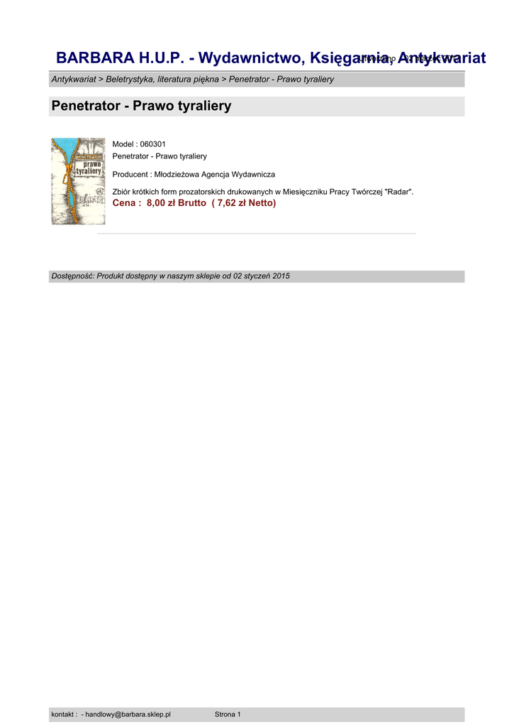 Utworzono Antykwariat : 02 marzec 2017 BARBARA H.U.P. - Wydawnictwo, Księgarnia, Antykwariat > Beletrystyka, literatura piękna > Penetrator - Prawo tyraliery Penetrator - Prawo tyraliery Model : 060301 Penetrator - Prawo tyraliery Producent : Młodzieżowa Agencja Wydawnicza Zbiór krótkich form prozatorskich drukowanych w Miesięczniku Pracy Twórczej "Radar". Cena : 8,00 zł Brutto ( 7,62 zł Netto) Dostępność: Produkt dostępny w naszym sklepie od 02 styczeń 2015 kontakt : - [email protected] Strona 1