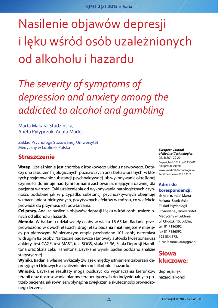 EJMT 2(7) 2015 • Varia Nasilenie objawów depresji i lęku wśród osób uzależnionych od alkoholu i hazardu The severity of symptoms of depression and anxiety among the addicted to alcohol and gambling Marta Makara-Studzińska, Aneta Pyłypczuk, Agata Madej Zakład Psychologii Stosowanej, Uniwersytet Medyczny w Lublinie, Polska European Journal of Medical Technologies 2015; 2(7): 20-29 Streszczenie Wstęp. Uzależnienie jest chorobą ośrodkowego układu nerwowego. Dotyczy ona zaburzeń fizjologicznych, poznawczych oraz behawioralnych, w których przyjmowanie substancji psychoaktywnej lub wykonywanie określonej czynności dominuje nad tymi formami zachowania, mającymi dawniej dla pacjenta wartość. Cykl uzależnienia od wykonywania patologicznych czynności, podobnie jak w przypadku substancji psychoaktywnych obejmuje wzmacnianie subiektywnych, pozytywnych efektów w mózgu, co w efekcie prowadzi do przymusu ich powtarzania. Cel pracy. Analiza nasilenia objawów depresji i lęku wśród osób uzależnionych od alkoholu i hazardu. Metoda. W badaniu udział wzięły osoby w wieku 18-65 lat. Badanie przeprowadzono w dwóch etapach: drugi etap badania miał miejsce 9 miesięcy po pierwszym. W pierwszym etapie przebadano 101 osób, natomiast w drugim 82 osoby. Narzędzie badawcze stanowiły autorski kwestionariusz ankiety, test CAGE, test MAST, test SOGS, skala SF-36, Skala Depresji Hamiltona oraz Skala Lęku Hamiltona. Uzyskane wyniki badań poddano analizie statystycznej. Wyniki. Badania własne wykazały związek między istnieniem zaburzeń depresyjnych i lękowych a uzależnieniem od alkoholu i hazardu. Wnioski. Uzyskane rezultaty mogą posłużyć do wyznaczania kierunków terapii oraz dostosowania planów terapeutycznych do indywidualnych potrzeb pacjenta, jak również wpłynąć na zwiększenie skuteczności prowadzonego leczenia. 20 Copyright © 2015 by ISASDMT All rights reserved www. medical-technologies.eu Published online 13.11.2015 Adres do korespondencji: dr hab. n. med. Marta Makara -Studzińska Zakład Psychologii Stosowanej, Uniwersytet Medyczny w Lublinie, ul. Chodźki 15, Lublin, tel. 81 7186592, fax 81 7186592, 695 534 572, e-mail: [email protected] Słowa kluczowe: depresja, lęk, hazard, alkohol Copyright © 2015 by ISASDMT EJMT 2(7) 2015 • Varia Abstract Introduction. Addiction is a disease of the central nervous system. It involves physiological, cognitive and behavioral disorders, in which the intake of a psychoactive substance or performance of a specific action dominates these forms of behavior that previously had value for the patient. The cycle of addiction to the exercise of pathological activities, similarly as in the case of psychoactive substances, involves reinforcing subjective positive effects in the brain, which in turn leads to the compulsion to repeat them. Aim of the study. Analysis of symptoms of depression and anxiety among people addicted to alcohol and gambling. Method. The study involved people aged 18-65. The study was conducted in two stages: the second phase of the study took place nine months after the first. In the first step, 101 people were surveyed, while in the other – 82. The research tools were as follows: an original questionnaire, the CAGE test, the MAST test, the SOGS test, the scale of the SF-36, Hamilton Depression Scale and Hamilton Anxiety Scale. The obtained results were subject to statistical analysis. Results. Our study showed a relationship between the existence of depression and anxiety and addiction to alcohol and gambling. Key words: Conclusions. The results obtained can be used to determine the directions of therapy and to adapt treatment plans to the individual needs of the pa- depression, anxiety, tient, as well as the impact of increasing the effectiveness of the performed gambling, alcohol treatment. Wstęp Materiał Uzależnienie to kompleks zjawisk fizjologicznych, behawioralnych i poznawczych, wśród których przyjmowanie substancji lub podejmowanie wybranej aktywności dominuje nad innymi zachowaniami, które wcześniej miały dla pacjenta większa wartość. Uzależnienie jest chorobą przewlekłą, która nieleczona postępuje. Wywiera wpływ na wszystkie obszary funkcjonowania człowieka: zdrowie fizyczne i psychiczne, życie emocjonalne, rodzinne, zawodowe, towarzyskie – nie tylko w okresie czynnego uzależnienia, ale również w okresie abstynencji. W badaniach przeprowadzonych od lipca 2011 roku do maja 2012 roku uczestniczyły trzy grupy: pierwszą stanowili chorzy z rozpoznaniem uzależnienia od alkoholu, drugą – osoby uzależnione od hazardu patologicznego, trzecią zaś osoby uzależnione od alkoholu i hazardu. Ogółem zbadano 101 osób. Do badań zaproszono osoby będące pacjentami Całodobowego Oddziału Terapii Uzależnienia od Alkoholu, osoby będące absolwentami tego oddziału oraz członków grup samopomocowych AH (Anonimowi Hazardziści) z Lublina, Łukowa i Zamościa. W początkowej fazie badania przeprowadzono rozmowę indywidualnie z osobą uzależnioną, którą informowano o celu badania i proszono o wyrażenie zgody na udział w nim. Ponieważ badanie przeprowadzone było dwuetapowo, po uzyskaniu zgody osoba uzależniona proszona była o podanie numeru telefonu. Cel pracy Celem pracy była analiza nasilenia objawów depresji i lęku wśród osób uzależnionych od alkoholu i hazardu. 21 Copyright © 2015 by ISASDMT EJMT 2(7) 2015 • Varia Każdy z uczestników badania zapewniony został o poufności uzyskanych danych. Wypełnienie ankiety było dobrowolne, ankietowani mogli w każdej chwili odmówić udziału w badaniu. Osoby kwalifikowane do badania wyraziły zgodę na udział w badaniu, miały 18-65 lat, nie miały uszkodzeń ośrodkowego układu nerwowego (OUN). Przeprowadzono testy przesiewowe określające nasilenie problemów związanych z piciem alkoholu i hazardem. Z analizy wynika, że w badanych grupach występowało uzależnienie od alkoholu (powyżej 5 pkt w