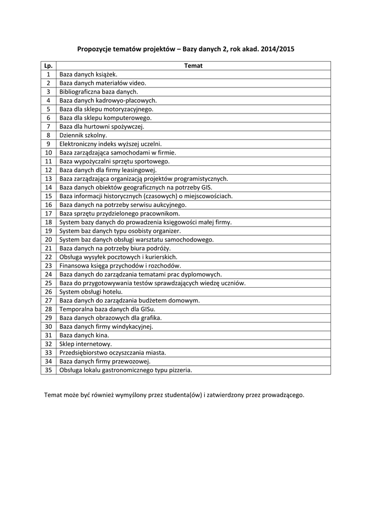 Propozycje tematów projektów – Bazy danych 2, rok akad. 2014/2015 Lp. 1 2 3 4 5 6 7 8 9 10 11 12 13 14 15 16 17 18 19 20 21 22 23 24 25 26 27 28 29 30 31 32 33 34 35 Temat Baza danych książek. Baza danych materiałów video. Bibliograficzna baza danych. Baza danych kadrowyo-płacowych. Baza dla sklepu motoryzacyjnego. Baza dla sklepu komputerowego. Baza dla hurtowni spożywczej. Dziennik szkolny. Elektroniczny indeks wyższej uczelni. Baza zarządzająca samochodami w firmie. Baza wypożyczalni sprzętu sportowego. Baza danych dla firmy leasingowej. Baza zarządzająca organizacją projektów programistycznych. Baza danych obiektów geograficznych na potrzeby GIS. Baza informacji historycznych (czasowych) o miejscowościach. Baza danych na potrzeby serwisu aukcyjnego. Baza sprzętu przydzielonego pracownikom. System bazy danych do prowadzenia księgowości małej firmy. System baz danych typu osobisty organizer. System baz danych obsługi warsztatu samochodowego. Baza danych na potrzeby biura podróży. Obsługa wysyłek pocztowych i kurierskich. Finansowa księga przychodów i rozchodów. Baza danych do zarządzania tematami prac dyplomowych. Baza do przygotowywania testów sprawdzających wiedzę uczniów. System obsługi hotelu. Baza danych do zarządzania budżetem domowym. Temporalna baza danych dla GISu. Baza danych obrazowych dla grafika. Baza danych firmy windykacyjnej. Baza danych kina. Sklep internetowy. Przedsiębiorstwo oczyszczania miasta. Baza danych firmy przewozowej. Obsługa lokalu gastronomicznego typu pizzeria. Temat może być również wymyślony przez studenta(ów) i zatwierdzony przez prowadzącego.