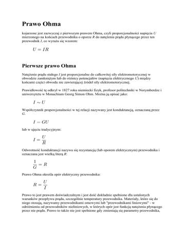 Prawo Ohma kojarzone jest zazwyczaj z pierwszym prawem Ohma, czyli proporcjonalności napięcia U mierzonego na końcach przewodnika o oporze R do natężenia prądu płynącego przez ten przewodnik I, co wyraża się wzorem: Pierwsze prawo Ohma Natężenie prądu stałego I jest proporcjonalne do całkowitej siły elektromotorycznej w obwodzie zamkniętym lub do różnicy potencjałów (napięcia elektrycznego U) między końcami części obwodu nie zawierającej źródeł siły elektromotorycznej. Prawidłowość tę odkrył w 1827 roku niemiecki fizyk, profesor politechniki w Norymberdze i uniwersytetu w Monachium Georg Simon Ohm. Można ją opisać jako: Współczynnik proporcjonalności w tej relacji nazywany jest konduktancją, oznaczaną przez G. lub w ujęciu tradycyjnym: Odwrotność konduktancji nazywa się rezystancją (lub oporem elektrycznym) przewodnika i oznaczana jest wielką literą R: Prawo Ohma określa opór elektryczny przewodnika: Prawo to jest prawem doświadczalnym i jest dość dokładnie spełnione dla ustalonych warunków przepływu prądu, szczególnie temperatury przewodnika. Materiały, które się do niego stosują, nazywamy przewodnikami omowymi lub "przewodnikami liniowymi" - w odróżnieniu od przewodników nieliniowych, w których opór jest funkcją natężenia płynącego przez nie prądu. Prawo to także nie jest spełnione gdy zmieniają się parametry przewodnika, szczególnie temperatura. Ze wszystkich materiałów przewodzących prawo Ohma najdokładniej jest spełnione w przypadku metali. Różniczkowy opór elektryczny Dla przewodników nie spełniających prawa Ohma oprócz wyżej wymienionego prawa, zwanego tu prawem statycznym, określa się też dynamiczne (różniczkowe) prawo Ohma: • różniczkowe prawo Ohma, w postaci: Jeśli odbiornik spełnia pierwsze prawo Ohma, to jego opór statyczny jest równy oporowi dynamicznemu. Różniczkowe prawo Ohma Obecnie różniczkowe prawo Ohma w ośrodkach ciągłych wyraża się w postaci wektorowej: gdzie J – gęstość prądu, σ – przewodność właściwa, która w ogólnym przypadku jest tensorem, a w ośrodkach izotropowych jest stałą, σ – gęstość siły Lorentza (siła Lorentza działająca na jednostkowy ładunek). W polu elektromagnetycznym w przewodniku na nośniki prądu działa siła Lorentza o gęstości: , gdzie: – wektor indukcji pola magnetycznego, – wektor natężenia pola elektrycznego. Ponieważ prędkość nośników jest mała w porównaniu z prędkością termiczną nośników prądu, którego średnia prędkość jest równa zero a nie jego wartość bezwzględna, zatem różniczkowe prawo Ohma, przyjmuje postać: Drugie prawo Ohma Opór odcinka przewodnika o stałym przekroju poprzecznym jest proporcjonalny do długości tego odcinka i odwrotnie proporcjonalny do pola powierzchni przekroju Prawo to można wyprowadzić z pierwszego prawa Ohma. Niech odcinek przewodnika o długości l ma ustalone pole powierzchni przekroju poprzecznego, wynoszące S. Jeśli do końców tego odcinka przyłożone zostanie napięcie U, to pole elektryczne wewnątrz przewodnika wyniesie: Korzystając z definicji gęstości prądu, jako ilorazu natężenia prądu przez pole przekroju przewodnika w którym płynie prąd, dostajemy: . Korzystając z definicji różniczkowego prawa Ohma: Korzystając z pierwszego prawa Ohma, oraz jeśli oznaczymy opór elektryczny właściwy jako: otrzymujemy drugie prawa Ohma. Bibliografia • • • David J. Grffiths, Podstawy elektrodynamiki, PWN Warszawa 2006. Jadwiga Salach,Barbara Sagnowska,Jerzy M. Kreiner, Fizyka II z astronomią, Warszawa 1996. http://pl.wikipedia.org/wiki/Prawo_Ohma