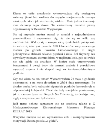 Kierat to takie urządzenie wykorzystujące siłę pociągową zwierząt (koni lub wołów) do napędu stacjonarnych maszyn rolniczych takich jak sieczkarnia, wialnia... Mnie jednak interesuje inna definicja tego słowa. To ekstremalny maraton pieszy organizowany w Beskidzie Wyspowym. Na tej imprezie można stanąć w szranki z najtrudniejszym przeciwnikiem i zapewniam cię, że nie są to wilki czy niedźwiedzie. Walczy się z samym sobą i jakkolwiek patetycznie to zabrzmi, taka jest prawda. 100 kilometrów nieprzerwanego marszu po górach Powiatu Limanowskiego to ciągłe pokonywanie słabości własnej psychiki i ciała. Ból fizyczny, lęk wywołany nocnymi ciemnościami w mglistym lesie, gdy człowiek nie wie gdzie się znajduje. W końcu stałe utrzymywanie koncentracji i uwagi żeby nie zasnąć, znaleźć i prawidłowo wytyczyć azymut i nie skręcić nogi na kamienno-błotnistym podłożu. Czy coś wiem na ten temat? Wystartowałem 24 maja o godzinie osiemnastej, a na metę dotarłem o 23:34 dnia następnego. Po drodze trzeba było odnaleźć piętnaście punktów kontrolnych w odpowiedniej kolejności. Choć nie były specjalnie poukrywane, jak to czasem bywa na Biegach Na Orientację, to dodając noc, mgłę i zmęczenie, nie było łatwo. Jeśli masz ochotę zapraszam cię na osobistą relacje z X Międzynarodowego Ekstremalnego Maratonu Pieszego KIERAT 2013. Wszystko zaczęło się od wyznaczenia celu i zaimpregnowania motywacji. Reszta poszła „z górki”. Jubileuszowa edycja jak przyznał sędzia główny Andrzej Sochoń była bardziej wymagająca niż poprzednie. Pozwól, że zacytuję komunikat z oficjalnej strony Kieratu: Na trudność tej trasy złożyły się: nieco większa niż zazwyczaj suma przewyższeń, rekordowe ilości błota na sukcesywnie zwilżanej deszczem trasie i związana z tym zmniejszona przyczepność obuwia do podłoża, gęsta mgła spowijająca szczególnie górne partie Ćwilina oraz odcinek specjalny w postaci Linii Obowiązkowego Przejścia Percią Borkowskiego pod Luboniem Wielkim. Od siebie dodam tylko, że najszybszy zawodnik Maciej Więcek dotarł na metę godzinę później niż zwycięzca z roku 2012 Maciej Dubaj. Przed startem tego nie wiedziałem i moim marzeniem było ukończyć maraton, ale najlepiej w czasie poniżej dwudziestu czterech godzin. Jak dowiedziałem się po zawodach, takie czasy osiąga tylko elita zwana szybkimi turystami lub biegaczami. Do czasu wystrzału startera jednak zwiedzałem i odprężałem się w Limanowej. Bazylika Matki Boskie Bolesnej w Limanowej. Jedna z kopii figur Matki Boskiej na tyłach Bazyliki. Sala sportowa zapełnia się zawodnikami. Atmosfera jak z czasów obozów wędrownych. Przekrój wiekowy niesamowity. Widać siwe włosy, ale i mleko pod nosem. Fantastycznie, przyjaźnie, nieskrępowanie. Brakuje mi trochę własnej ekipy. Czuję wsparcie z odległości, jednak to nie to samo co na miejscu. Czasem czuję się napięcie jak w poczekalni u ginekologa. Ci, którzy jak ja startują po raz pierwszy, dostają dobre rady od starych wyjadaczy. Przejdziesz tylko musisz pokonać wszystkie kryzysy. To ile ich ma być? Pierwszy na 30 kilometrze i później… i jak zacznie padać, i zrobi się ciemno, i będzie mgła… Słyszałem, że pierworódki podobne historie o porodach wysłuchują od swoich bardziej doświadczonych koleżanek. Czas na start. Pozytywne emocje i szczęście niepojęte. Przede mną przygoda życia. Takie emocje mi towarzyszyły. Wszystkiego byłem ciekaw. Poznałem fajnych kompanów i od razu robiło mi się raźniej, że w nocy nie zostanę sam w górskich lasach poza szlakiem. No i przyjaźnie nastawiony znajomy może zrobić mi zdjęcie. To tuż przed rozpoczęciem maratonu. Numer startowy 341 dobrze wróżył. Gdybym zakończył z takim wynikiem, na pewno bym zaliczył wszystkie punkty kontrolne i do mety dotarłbym w wyznaczonym limicie czasu. Pierwsze trzy PK nie sprawiły trudności. Mimo, że mgła otuliła nas to wszyscy dobrze radzili sobie z przeciwnościami. Do tego momentu nie było chyba żadnej rezygnacji. Humory dopisywały, choć niektórzy zaczęli odczuwać trudy pierwszych osiemnastu kilometrów. No i przewyższenie w drodze na szczyt Łopienia Środkowego (855) dało się we znaki. Punkt czwarty to nie przelewki. Ciemna noc i gęsta mgła powodowały, że czołówka oświetlała czasem tylko kilka centymetrów przed stopami. Tam śliskie błoto, luźne kamienie i głębokie kałuże. Następny punkt dość prosty nawigacyjnie jakby się wydawało. Powinniśmy trafić żółtym szlakiem. Jednak jeden mały błąd, chwila rozkojarzenia i szlak trafił szlag. Wylądowaliśmy na zakazanej drodze krajowej. Całe szczęście, że był chodnik prawie i po tym prawie chodniku dotarliśmy na punkt piąty. Niech zaświadczy o tym zdjęcie, choć powiało chłodem, czy też zmęczeniem do uwiecznienia mego wizerunku. Poprosiłem więc Wojtka, zgodził się chętnie. Na szóstym punkcie zdjęcie zrobiłem sam. Droga bardzo gładko szła pod górkę. Napisałbym, że po prawej stronie minęliśmy szczyt Adamczykowa (611). Jednak to nieprofesjonalne i musisz wiedzieć, że chociaż to prawda to górkę zostawiliśmy od zachodu, a szlak ładnie trawersował. Przed nami raj obiecany. PK7, a na nim golonka, piwo dziewczyny i kościół. Tu w górach nie ma żartów i rozwiązłości. Jak spodobasz się jakiejś dziewczynie to kościół jest w każdej wiosce. Na zapowiedzi się daje po spojrzeniu dłuższym niż piętnaście sekund. I nikt ci nie uwierzy, że zmęczony byłeś po pod górkę miałeś. Wyznaczamy trasę do naszego popasu. Darek i Piotrek tak wyznaczyli azymut, że na skuśkę, przez łąki, krzakory prawie pionowo w dół wpadliśmy na wyznaczony mostek. Po drodze zadziwił nas tylko ogromny stos drewna. Na nizinach tak ogromnych nie widziałem. Z daleka nawet myślałem, że to siano. Za mostkiem miało być prosto. To znaczy łatwo i szybko po jedzenie, i