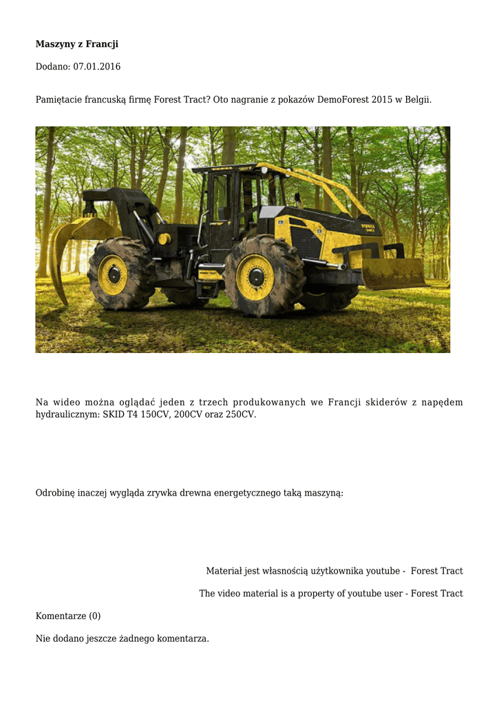 Maszyny z Francji Dodano: 07.01.2016 Pamiętacie francuską firmę Forest Tract? Oto nagranie z pokazów DemoForest 2015 w Belgii. Na wideo można oglądać jeden z trzech produkowanych we Francji skiderów z napędem hydraulicznym: SKID T4 150CV, 200CV oraz 250CV. Odrobinę inaczej wygląda zrywka drewna energetycznego taką maszyną: Materiał jest własnością użytkownika youtube - Forest Tract The video material is a property of youtube user - Forest Tract Komentarze (0) Nie dodano jeszcze żadnego komentarza.
