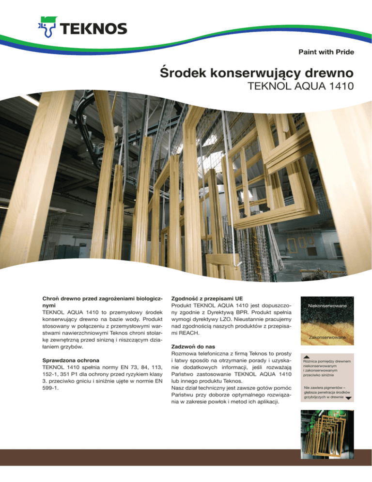 Środek konserwujący drewno TEKNOL AQUA 1410 Chroń drewno przed zagrożeniami biologicznymi TEKNOL AQUA 1410 to przemysłowy środek konserwujący drewno na bazie wody. Produkt stosowany w połączeniu z przemysłowymi warstwami nawierzchniowymi Teknos chroni stolarkę zewnętrzną przed sinizną i niszczącym działaniem grzybów. Sprawdzona ochrona TEKNOL 1410 spełnia normy EN 73, 84, 113, 152-1, 351 P1 dla ochrony przed ryzykiem klasy 3. przeciwko gniciu i siniźnie ujęte w normie EN 599-1. Zgodność z przepisami UE Produkt TEKNOL AQUA 1410 jest dopuszczony zgodnie z Dyrektywą BPR. Produkt spełnia wymogi dyrektywy LZO. Nieustannie pracujemy nad zgodnością naszych produktów z przepisami REACH. Zadzwoń do nas Rozmowa telefoniczna z firmą Teknos to prosty i łatwy sposób na otrzymanie porady i uzyskanie dodatkowych informacji, jeśli rozważają Państwo zastosowanie TEKNOL AQUA 1410 lub innego produktu Teknos. Nasz dział techniczny jest zawsze gotów pomóc Państwu przy doborze optymalnego rozwiązania w zakresie powłok i metod ich aplikacji. Niekonserwowane Zakonserwowane Różnica pomiędzy drewnem niekonserwowanym i zakonserwowanym przeciwko siniźnie Nie zawiera pigmentów – głębsza penetracja środków grzybójczych w drewnie Cechy i korzyści Cechy Korzyści Zoptymalizowana mieszanka środków grzybobójczych Aktywna ochrona przeciwko siniźnie i grzybom rozkładającym drewno – przedłużenie trwałości konserwowanego drewna Szybkie schnięcie Szybsza obróbka, mniejszy nakład pracy Niska lepkość Głębsza penetracja środków grzybójczych w drewnie Zmniejszenie różnic w absorpcji podczas gruntowania Lepsze wyrównanie kolorów transparentnych TEKNOL AQUA 1410* Zawartość Środki grzybobójcze, żywica syntetyczna, woda Opakowanie 20, 120, 1000 l Zalecane systemy powłok Miękkie gatunki drewna 3-powłokowy Transparentny / Kryjący Wszystkie gatunki drewna 4-powłokowy Transparentny / Kryjący Środek konserwujący drewno* TEKNOL AQUA 1410 TEKNOL AQUA 1410 Podkład AQUAPRIMER 2900 AQUAPRIMER 2900 AQUAPRIMER 3130 Warstwa pośrednia Warstwa nawierzchniowa AQUAFILLER 6500 AQUATOP 2600 AQUATOP 2600 * Produkt biobójczy - należy stosować z zachowaniem szczególnych środków ostrożności. Przed użyciem należy przeczytać etykietę i ulotkę informacyjną. www.teknos.com B093 2014-12 PL T Teknos Sp. z o.o. ul. Księcia Ziemowita 59 03-885 Warszawa Polska Tel. +48 22 678 70 04 [email protected] Teknos Oy Takkatie 3, P.O.Box 107 FI–00371 HELSINKI Finlandia Tel. +358 9 506 091 [email protected]
