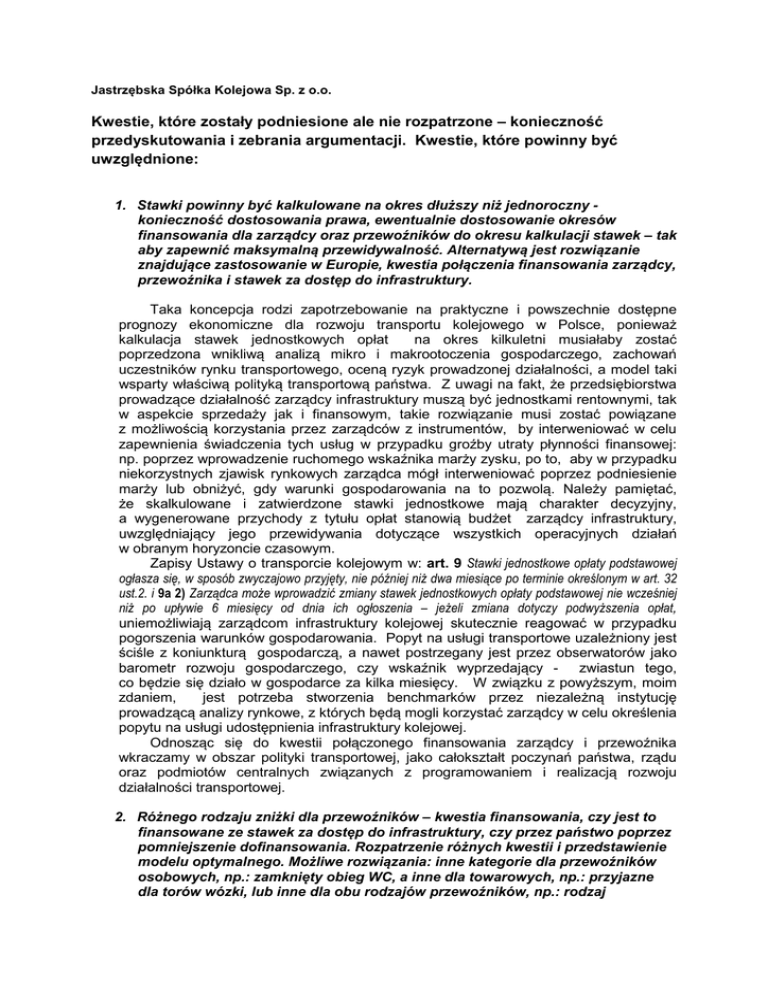 Jastrzębska Spółka Kolejowa Sp. z o.o. Kwestie, które zostały podniesione ale nie rozpatrzone – konieczność przedyskutowania i zebrania argumentacji. Kwestie, które powinny być uwzględnione: 1. Stawki powinny być kalkulowane na okres dłuższy niż jednoroczny konieczność dostosowania prawa, ewentualnie dostosowanie okresów finansowania dla zarządcy oraz przewoźników do okresu kalkulacji stawek – tak aby zapewnić maksymalną przewidywalność. Alternatywą jest rozwiązanie znajdujące zastosowanie w Europie, kwestia połączenia finansowania zarządcy, przewoźnika i stawek za dostęp do infrastruktury. Taka koncepcja rodzi zapotrzebowanie na praktyczne i powszechnie dostępne prognozy ekonomiczne dla rozwoju transportu kolejowego w Polsce, ponieważ kalkulacja stawek jednostkowych opłat na okres kilkuletni musiałaby zostać poprzedzona wnikliwą analizą mikro i makrootoczenia gospodarczego, zachowań uczestników rynku transportowego, oceną ryzyk prowadzonej działalności, a model taki wsparty właściwą polityką transportową państwa. Z uwagi na fakt, że przedsiębiorstwa prowadzące działalność zarządcy infrastruktury muszą być jednostkami rentownymi, tak w aspekcie sprzedaży jak i finansowym, takie rozwiązanie musi zostać powiązane z możliwością korzystania przez zarządców z instrumentów, by interweniować w celu zapewnienia świadczenia tych usług w przypadku groźby utraty płynności finansowej: np. poprzez wprowadzenie ruchomego wskaźnika marży zysku, po to, aby w przypadku niekorzystnych zjawisk rynkowych zarządca mógł interweniować poprzez podniesienie marży lub obniżyć, gdy warunki gospodarowania na to pozwolą. Należy pamiętać, że skalkulowane i zatwierdzone stawki jednostkowe mają charakter decyzyjny, a wygenerowane przychody z tytułu opłat stanowią budżet zarządcy infrastruktury, uwzględniający jego przewidywania dotyczące wszystkich operacyjnych działań w obranym horyzoncie czasowym. Zapisy Ustawy o transporcie kolejowym w: art. 9 Stawki jednostkowe opłaty podstawowej ogłasza się, w sposób zwyczajowo przyjęty, nie później niż dwa miesiące po terminie określonym w art. 32 ust.2. i 9a 2) Zarządca może wprowadzić zmiany stawek jednostkowych opłaty podstawowej nie wcześniej niż po upływie 6 miesięcy od dnia ich ogłoszenia – jeżeli zmiana dotyczy podwyższenia opłat, uniemożliwiają zarządcom infrastruktury kolejowej skutecznie reagować w przypadku pogorszenia warunków gospodarowania. Popyt na usługi transportowe uzależniony jest ściśle z koniunkturą gospodarczą, a nawet postrzegany jest przez obserwatorów jako barometr rozwoju gospodarczego, czy wskaźnik wyprzedający - zwiastun tego, co będzie się działo w gospodarce za kilka miesięcy. W związku z powyższym, moim zdaniem, jest potrzeba stworzenia benchmarków przez niezależną instytucję prowadzącą analizy rynkowe, z których będą mogli korzystać zarządcy w celu określenia popytu na usługi udostępnienia infrastruktury kolejowej. Odnosząc się do kwestii połączonego finansowania zarządcy i przewoźnika wkraczamy w obszar polityki transportowej, jako całokształt poczynań państwa, rządu oraz podmiotów centralnych związanych z programowaniem i realizacją rozwoju działalności transportowej. 2. Różnego rodzaju zniżki dla przewoźników – kwestia finansowania, czy jest to finansowane ze stawek za dostęp do infrastruktury, czy przez państwo poprzez pomniejszenie dofinansowania. Rozpatrzenie różnych kwestii i przedstawienie modelu optymalnego. Możliwe rozwiązania: inne kategorie dla przewoźników osobowych, np.: zamknięty obieg WC, a inne dla towarowych, np.: przyjazne dla torów wózki, lub inne dla obu rodzajów przewoźników, np.: rodzaj hamulców, poziomu emisji spalin. Rozwiązanie systemowe, rozpatrzenie „za” lub „przeciw” i rekomendacja. Finansowanie zniżek dla przewoźników może dotyczyć zarządców w przypadku wypracowania nadwyżki finansowej ze sprzedaży usług i powinien mieć wymiar marketingowy. Natomiast zniżki w celu np. pobudzenia ruchliwości komunikacyjnej, aktywizacji gospodarczej na jakimś obszarze mają charakter społeczno-gospodarczy powinny być finansowane przez państwo. Trudno o przedstawienie modelu optymalnego przez zarządcę infrastruktury kolejowej będącego przedmiotem polityki transportowej państwa, który nie korzysta z finansowania działalności operacyjnej i nie korzysta z dotacji na remonty, utrzymanie i rozwój infrastruktury kolejowej pochodzących z budżetu państwa, funduszy unijnych, czy środków kapitałowych pochodzących z Funduszu Kolejowego. 3. Uwzględnienie, bądź nie, kosztów sieci trakcyjnej w stawkach za dostęp do infrastruktury – ich nieuwzględnieniem są zainteresowani przewoźnicy nie korzystający z trakcji. Przedstawienie argumentacji za propozycją, np.: przedstawienie jak to jest uregulowane w innych krajach. Prezentacja ma być początkiem do dalszej dyskusji i wypracowania stanowiska. Urządzenia sieci trakcyjnej udostępniane są przewoźnikom kolejowym w ramach usługi podstawowej minimalnego dostępu do infrastruktury bez względu na tytuł własności posiadany przez zarządcę infrastruktury kolejowej. Postulat przewoźników niekorzystających z sieci trakcyjnej na liniach wyposażonych w takowe urządzenia rodzi potrzebę przemodelowania schematu cennikowego poprzez uproszczenie publikowania stawek jednostkowych dla wszystkich rodzajów trakcji i kalkulacji jednej stawki dla trakcji elektrycznej wynikającej z kosztów amortyzacji i utrzymania oraz pracy eksploatacyjnej przyjętej tylko dla trakcji elektrycznej. Stawka jednostkowa za korzystanie z urządzeń sieci trakcyjnej mogłaby przyjąć formę wskaźnikową, będącą elementem opłaty podstawowej. 4. Różne stawki dla pociągów pasażerskich ze względu na rodzaj wykonywanych przewozów, np.: inne stawki dla przewoźników aglomer
