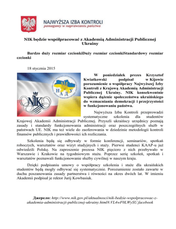 NIK będzie współpracować z Akademią Administracji Publicznej Ukrainy Bardzo duży rozmiar czcionkiDuży rozmiar czcionkiStandardowy rozmiar czcionki 18 stycznia 2015 W poniedziałek prezes Krzysztof Kwiatkowski podpisał w Kijowie porozumienie o współpracy Najwyższej Izby Kontroli z Krajową Akademią Administracji Publicznej Ukrainy. NIK konsekwentnie wspiera dążenie społeczeństwa ukraińskiego do wzmacniania demokracji i przejrzystości w funkcjonowaniu państwa. Najwyższa Izba Kontroli przeprowadzi systematyczne szkolenia dla studentów Krajowej Akademii Administracji Publicznej. Przyszli ukraińscy urzędnicy poznają zasady i standardy funkcjonowania administracji oraz poszczególnych służb w państwach UE. NIK ma też wiele do zaoferowania w dziedzinie metodologii kontroli finansów publicznych i prawidłowości ich rozliczania. Szkolenia będą się odbywały w formie konferencji, seminariów, spotkań roboczych, warsztatów oraz wizyt studyjnych i staży. Pierwsi studenci KAAP-u już odwiedzili Polskę. Na zaproszenie prezesa NIK pięcioro z nich przebywało w Warszawie i Krakowie na tygodniowym stażu. Poprzez serię szkoleń, spotkań i warsztatów poznawali funkcjonowanie służby cywilnej w naszym kraju. Dzięki podpisaniu umowy o współpracy szkolenia i staże dla ukraińskich studentów będą mogły odbywać się systematycznie. Porozumienie zostało zawarte w duchu poszanowania zasady partnerstwa i równości na okres dwóch lat. W imieniu Akademii podpisał je rektor Jurij Kowbasiuk. Джерело: http://www.nik.gov.pl/aktualnosci/nik-bedzie-wspolpracowac-zakademia-administracji-publicznej-ukrainy.html#.VL4wF0LWySU.facebook