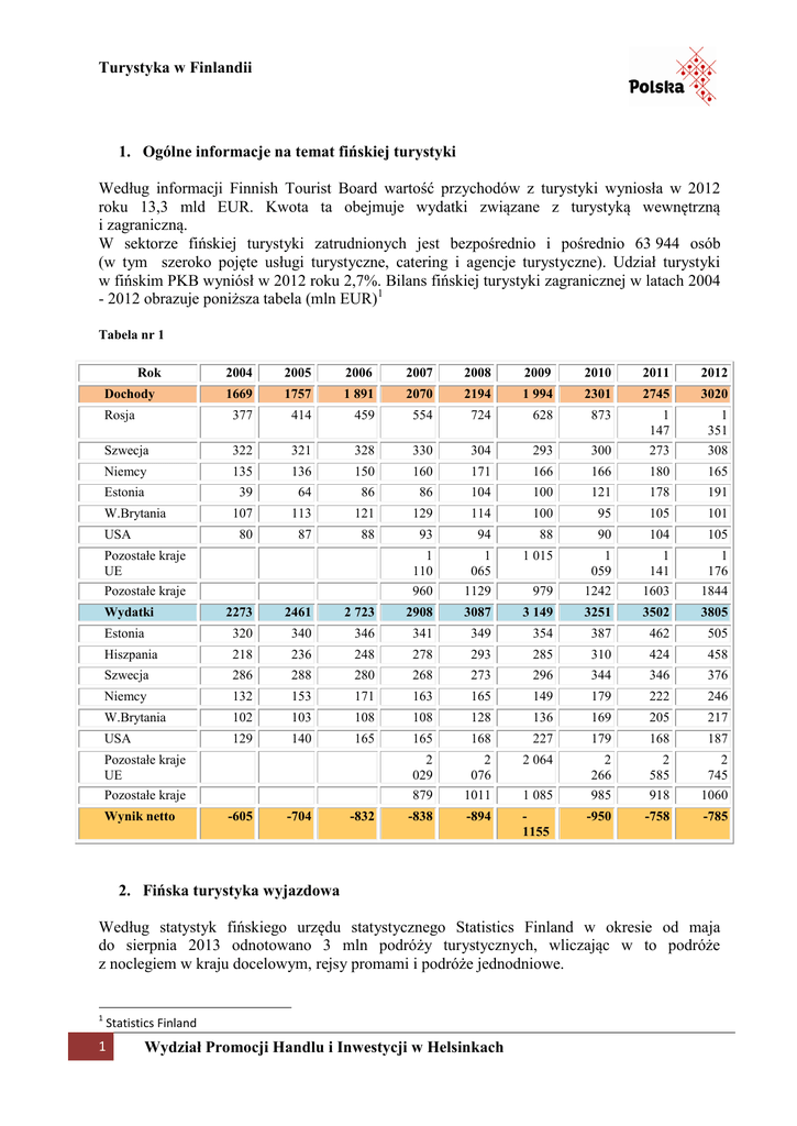 Turystyka w Finlandii 1. Ogólne informacje na temat fińskiej turystyki Według informacji Finnish Tourist Board wartość przychodów z turystyki wyniosła w 2012 roku 13,3 mld EUR. Kwota ta obejmuje wydatki związane z turystyką wewnętrzną i zagraniczną. W sektorze fińskiej turystyki zatrudnionych jest bezpośrednio i pośrednio 63 944 osób (w tym szeroko pojęte usługi turystyczne, catering i agencje turystyczne). Udział turystyki w fińskim PKB wyniósł w 2012 roku 2,7%. Bilans fińskiej turystyki zagranicznej w latach 2004 - 2012 obrazuje poniższa tabela (mln EUR)1 Tabela nr 1 Rok 2004 2005 2006 2007 2008 2009 2010 2011 2012 1669 1757 1 891 2070 2194 1 994 2301 2745 3020 Rosja 377 414 459 554 724 628 873 1 147 1 351 Szwecja 322 321 328 330 304 293 300 273 308 Niemcy 135 136 150 160 171 166 166 180 165 Estonia 39 64 86 86 104 100 121 178 191 107 113 121 129 114 100 95 105 101 80 87 88 93 94 88 90 104 105 Pozostałe kraje UE 1 110 1 065 1 015 1 059 1 141 1 176 Pozostałe kraje 960 1129 979 1242 1603 1844 Dochody W.Brytania USA Wydatki 2273 2461 2 723 2908 3087 3 149 3251 3502 3805 Estonia 320 340 346 341 349 354 387 462 505 Hiszpania 218 236 248 278 293 285 310 424 458 Szwecja 286 288 280 268 273 296 344 346 376 Niemcy 132 153 171 163 165 149 179 222 246 W.Brytania 102 103 108 108 128 136 169 205 217 USA 129 140 165 165 168 227 179 168 187 Pozostałe kraje UE 2 029 2 076 2 064 2 266 2 585 2 745 Pozostałe kraje 879 1011 1 085 985 918 1060 -838 -894 1155 -950 -758 -785 Wynik netto -605 -704 -832 2. Fińska turystyka wyjazdowa Według statystyk fińskiego urzędu statystycznego Statistics Finland w okresie od maja do sierpnia 2013 odnotowano 3 mln podróży turystycznych, wliczając w to podróże z noclegiem w kraju docelowym, rejsy promami i podróże jednodniowe. 1 Statistics Finland 1 Wydział Promocji Handlu i Inwestycji w Helsinkach Turystyka w Finlandii Największym zainteresowaniem wśród Finów cieszyły się wyjazdy do takich krajów jak Estonia, Hiszpania, Szwecja, Niemcy i Wielka Brytania. Przykładowo w lecie 2013 r. Estonię odwiedziło wraz z noclegiem 654 000 Finów, a do Szwecji w tym samym okresie czasu udało się 293 000 osób. Ilość podróży Finów w okresie maj – sierpień 2013 r. obrazuje tabela nr 2. Tabela nr 2 Podróże maj – sierpień 2013 Kraj docelowy Ilość podróży Podróży łącznie Udział (%) 2 310 000 100 419 000 18 66 000 3 293 000 13 60 000 3 Rosja i kraje bałtyckie 823 000 36 Rosja 131 000 6 Estonia 654 000 28 Europa Wschodnia i Zachodnia 464 000 20 Wielka Brytania 56 000 2 Francja 94 000 4 Niemcy 145 000 6 Europa Południowa i kraje wschodniej części Morza Śródziemnego 516 000 22 Hiszpania (bez Wysp Kanaryjskich) 154 000 7 Włochy 103 000 4 Grecja 106 000 5 Turcja 64 000 3 Ameryka, Afryka, Azja i Oceania 88 000 4 Kraje skandynawskie Norwegia Szwecja Dania W 2013 r. Finowie odbyli 0,5 mln podróży służbowych i konferencyjnych (w tym podróże z noclegiem, rejsy i podróże jednodniowe). Liczba służbowych podróży zagranicznych zmniejszyła się o 14% w porównaniu z rokiem 2012. 2 Wydział Promocji Handlu i Inwestycji w Helsinkach Turystyka w Finlandii 3. Finowie w polskiej turystyce przyjazdowej na tle pozostałych krajów skandynawskich Noclegi udzielone turystom z krajów skandynawskich Tabela nr 3 Liczba ludności (mln)2 Kraj 2010 2011 2012 Finlandia 5,5 117 983 132 933 128 704 Szwecja 9,48 228 458 234 622 263 735 Dania 5,58 190 706 197 002 204 571 Norwegia 4,98 256 809 262 145 344 083 Liczba turystów z krajów skandynawskich W ciągu dziewięciu miesięcy 2013 roku było, według szacunków, 56,7 mln przyjazdów cudzoziemców, o 9,4% więcej niż w tym samym okresie poprzedniego roku. Liczbę przyjazdów turystów w tym czasie oceniamy na 12,1 mln (o 8% więcej) Tabela nr 4 Kraj 2 3 Liczba ludności (mln) Finlandia 5,5 61 400 / 85 0003 Szwecja 9,48 180 000 Dania 5,58 88 900 Norwegia 4,98 132 700 Źródło: eurostat 61 400 wg GUS, 85 000 wg Statistics Finland 3 2012 Wydział Promocji Handlu i Inwestycji w Helsinkach Turystyka w Finlandii 4. Preferecje i profil turysty fińskiego Z badania ankietowego przeprowadzonego wśród fińskich turystów przez brytyjską agencję turystyki VisitBritain4 wynika, że wśród Finów największą popularnością cieszyły się następujące formy spędzania wolnego czasu: 1) korzystanie z usług gastronomicznych, 2) kupowanie ubrań/akcesoriów, 3) kupowanie pamiątek, 4) odwiedziny w pubach, 5) zwiedzanie znanych miejsc/budynków, 6) odwiedzanie parków i ogrodów, 7) zwiedzanie muzeów i galerii, 8) wycieczki na łonie natury, 9) wizyty w teatrach, operach, koncerty, 10) wizyty w klubach nocnych. Według badań VisitBritain Finowie odwiedzający Wielką Brytanię zaliczają się do turystów zamożnych, dobrze wykształconych i pochodzących z dużych ośrodków miejskich. Finowie są miłośnikami aktywności na świeżym powietrzu, a jako podróżnicy są niezależni i ciekawi nowych wrażeń. Ważny jest dla nich dostęp do internetu oraz profesjonalna obsługa, zazwyczaj w języku angielskim. Opracowanie: WPHI Helsinki, 16.01.2014 4 http://www.visitbritain.org/ 4 Wydział Promocji Handlu i Inwestycji w Helsinkach
