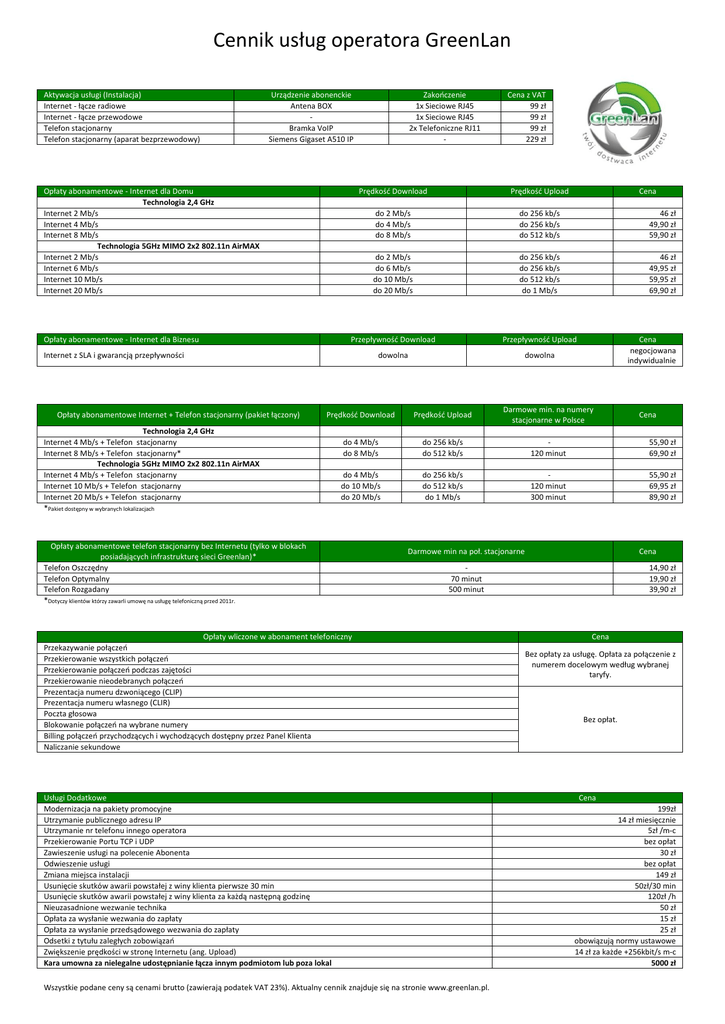 Cennik usług operatora GreenLan Aktywacja usługi (Instalacja) Internet - łącze radiowe Internet - łącze przewodowe Telefon stacjonarny Telefon stacjonarny (aparat bezprzewodowy) Urządzenie abonenckie Antena BOX Bramka VoIP Siemens Gigaset A510 IP Opłaty abonamentowe - Internet dla Domu Technologia 2,4 GHz Internet 2 Mb/s Internet 4 Mb/s Internet 8 Mb/s Technologia 5GHz MIMO 2x2 802.11n AirMAX Internet 2 Mb/s Internet 6 Mb/s Internet 10 Mb/s Internet 20 Mb/s Opłaty abonamentowe - Internet dla Biznesu Cena z VAT 99 zł 99 zł 99 zł 229 zł Prędkość Download Prędkość Upload do 2 Mb/s do 4 Mb/s do 8 Mb/s do 256 kb/s do 256 kb/s do 512 kb/s 46 zł 49,90 zł 59,90 zł do 2 Mb/s do 6 Mb/s do 10 Mb/s do 20 Mb/s do 256 kb/s do 256 kb/s do 512 kb/s do 1 Mb/s 46 zł 49,95 zł 59,95 zł 69,90 zł Przepływność Download Przepływność Upload dowolna dowolna Internet z SLA i gwarancją przepływności Opłaty abonamentowe Internet + Telefon stacjonarny (pakiet łączony) Zakończenie 1x Sieciowe RJ45 1x Sieciowe RJ45 2x Telefoniczne RJ11 - Cena Cena negocjowana indywidualnie Prędkość Download Prędkość Upload Darmowe min. na numery stacjonarne w Polsce do 4 Mb/s do 8 Mb/s do 256 kb/s do 512 kb/s 120 minut 55,90 zł 69,90 zł do 4 Mb/s do 10 Mb/s do 20 Mb/s do 256 kb/s do 512 kb/s do 1 Mb/s 120 minut 300 minut 55,90 zł 69,95 zł 89,90 zł Technologia 2,4 GHz Internet 4 Mb/s + Telefon stacjonarny Internet 8 Mb/s + Telefon stacjonarny* Technologia 5GHz MIMO 2x2 802.11n AirMAX Internet 4 Mb/s + Telefon stacjonarny Internet 10 Mb/s + Telefon stacjonarny Internet 20 Mb/s + Telefon stacjonarny *Pakiet dostępny w wybranych lokalizacjach Opłaty abonamentowe telefon stacjonarny bez Internetu (tylko w blokach posiadających infrastrukturę sieci Greenlan)* Telefon Oszczędny Telefon Optymalny Telefon Rozgadany *Dotyczy klientów którzy zawarli umowę na usługę telefoniczną przed 2011r. Darmowe min na poł. stacjonarne Cena 70 minut 500 minut Opłaty wliczone w abonament telefoniczny Przekazywanie połączeń Przekierowanie wszystkich połączeń Przekierowanie połączeń podczas zajętości Przekierowanie nieodebranych połączeń Prezentacja numeru dzwoniącego (CLIP) Prezentacja numeru własnego (CLIR) Poczta głosowa Blokowanie połączeń na wybrane numery Billing połączeń przychodzących i wychodzących dostępny przez Panel Klienta Naliczanie sekundowe Usługi Dodatkowe Modernizacja na pakiety promocyjne Utrzymanie publicznego adresu IP Utrzymanie nr telefonu innego operatora Przekierowanie Portu TCP i UDP Zawieszenie usługi na polecenie Abonenta Odwieszenie usługi Zmiana miejsca instalacji Usunięcie skutków awarii powstałej z winy klienta pierwsze 30 min Usunięcie skutków awarii powstałej z winy klienta za każdą następną godzinę Nieuzasadnione wezwanie technika Opłata za wysłanie wezwania do zapłaty Opłata za wysłanie przedsądowego wezwania do zapłaty Odsetki z tytułu zaległych zobowiązań Zwiększenie prędkości w stronę Internetu (ang. Upload) Kara umowna za nielegalne udostępnianie łącza innym podmiotom lub poza lokal Wszystkie podane ceny są cenami brutto (zawierają podatek VAT 23%). Aktualny cennik znajduje się na stronie www.greenlan.pl. Cena 14,90 zł 19,90 zł 39,90 zł Cena Bez opłaty za usługę. Opłata za połączenie z numerem docelowym według wybranej taryfy. Bez opłat. Cena 199zł 14 zł miesięcznie 5zł /m-c bez opłat 30 zł bez opłat 149 zł 50zł/30 min 120zł /h 50 zł 15 zł 25 zł obowiązują normy ustawowe 14 zł za każde +256kbit/s m-c 5000 zł Stawki za połączenia telefoniczne Połączenia wewnątrz sieci GreenLan Połączenia lokalne i między strefowe Połączenia do sieci komórkowych (za wyłączeniem sieci Play i Cyfrowy Polsat) Połączenia do sieci komórkowych (do sieci Play i Cyfrowy Polsat) Połączenia stacjonarne do Unii Europejskiej i USA Połączenia komórkowe Cały Świat Połączenia na nr 8xx 0 800 0 801 1 0 801 2 0 801 7 0 801 8 0 801 3 0 801 9 Cena 0,00 zł/min. 0,09 zł/min. 0,38 zł/min. 0,88 zł/min. od 0,11 zł/min. od 1,10 zł/min. Stawki za połączenia telefoniczne na nr specjalne Okres taryfikacyjny Sposób naliczania Ta, Tb bez opłat Cena Bez opłat Ta, Tb jednokrotnie 0,36zł Ta Tb T1 T2 T3,T4 za każde rozpoczęte 3 min połączenia za każde rozpoczęte 6 min połączenia 0,36zł 0,49zł 0,49zł 0,37zł 0,24zł Ta, Tb Za każdą rozpoczętą minutę połączenia 0 804 2 Ta Tb Ta, Tb 00800 Ta, Tb 118913 Ta, Tb za każde rozpoczęte 3 min połączenia za każde rozpoczęte 6 min połączenia za każdą rozpoczętą 1 minutę połączenia za każdą minutę połączenia, naliczanie sekundowe jednokrotnie 0 801 4 0 801 0 0 801 5 0 801 6 0 804 1 za minutę połączenia 0,36zł 0,36zł 0,36zł 0,14zł 1,43zł Okresy taryfikacyjne: T1 - w godzinach od 8:00 do 18:00 w dni robocze T2 - w godzinach od 8:00 do 18:00 w soboty, niedziele i dni świąteczne T3 - w godzinach od 18:00 do 8:00 w dni robocze T4 - w godzinach od 18:00 do 8:00 w soboty, niedziele i dni świąteczne Ta - w godzinach od 8:00 do 22:00 we wszystkie dni tygodnia Tb - w godzinach od 22:00 do 8:00 we wszystkie dni tygodnia Cennik urządzeń dostępowych Router 802.11 b/g/n 150Mb/s Router 802.11 b/g/n 300Mb/s Router Ubiquiti AirRouter Router AirLive G.Duo Karta Sieciowa PCI Fast Ethernet Swich 5 port Swich 8 port Kabel UTP kat.5e (skrętka) Kabel RF5 Końcówka RP-SMA Cena Wymiana urządzeń uszkodzonych z winy użytkownika (rzeczywisty koszt urządzeń) Ubiquiti Bullet2 Ubiquiti Bullet2 HP Ubiquiti Nano Station2 Loco Ubiquiti Nano Station M5 Ubiquiti Nano Station M5 Loco Ubiquiti Nano Bridge M5 MikroTik Karta PCI WiFi Bramka VoIP Grandstream HT502 Bramka VoIP Linksys PAP2T Bramka VoIP Linksys SPA-2102 Antena Panel 2,4GHz 8dBi Antena Panel 2,4GHz 14dBi Antena Panel 2,4GHz 19dBi Antena Grid 2,4GHz 19dBi Antena Grid 2,4GHz 24dBi Antena Panel 5GHz 18dBi Antena Panel 5GHz 23dBi Cena Wszystkie podane ceny są cenami brutto 