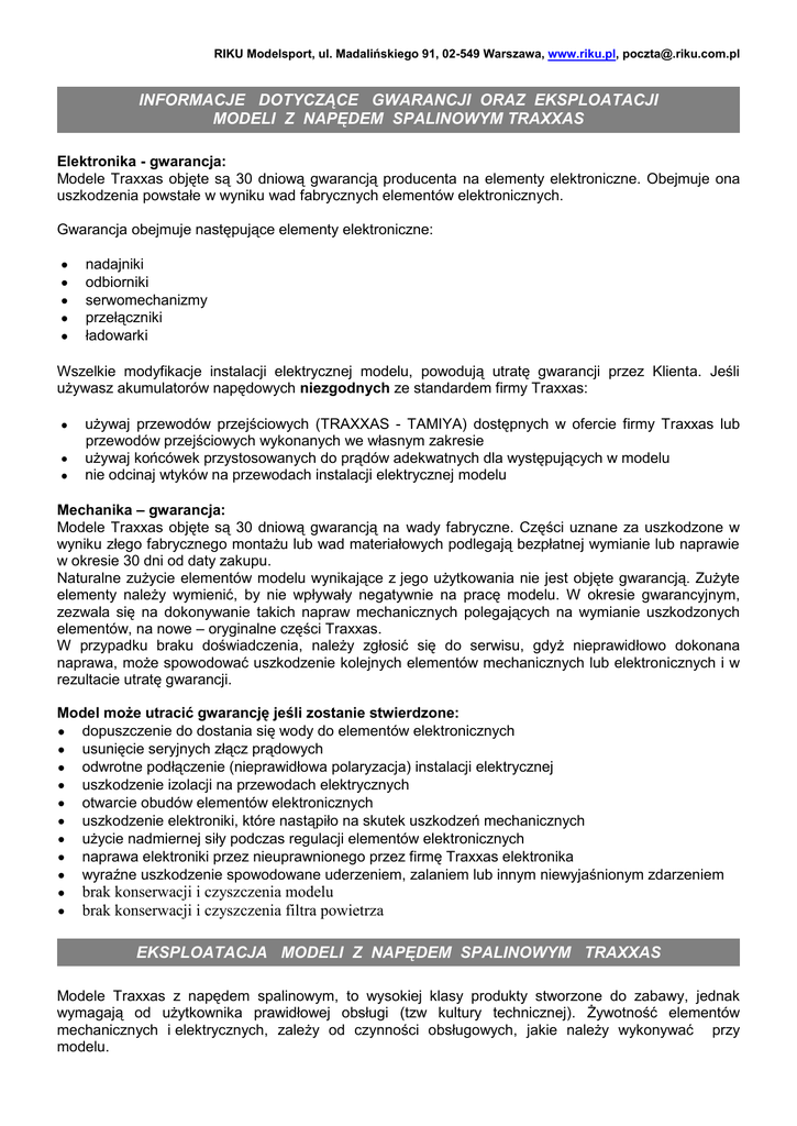 RIKU Modelsport, ul. Madalińskiego 91, 02-549 Warszawa, www.riku.pl, [email protected] INFORMACJE DOTYCZĄCE GWARANCJI ORAZ EKSPLOATACJI MODELI Z NAPĘDEM SPALINOWYM TRAXXAS Elektronika - gwarancja: Modele Traxxas objęte są 30 dniową gwarancją producenta na elementy elektroniczne. Obejmuje ona uszkodzenia powstałe w wyniku wad fabrycznych elementów elektronicznych. Gwarancja obejmuje następujące elementy elektroniczne: nadajniki odbiorniki serwomechanizmy przełączniki ładowarki Wszelkie modyfikacje instalacji elektrycznej modelu, powodują utratę gwarancji przez Klienta. Jeśli używasz akumulatorów napędowych niezgodnych ze standardem firmy Traxxas: używaj przewodów przejściowych (TRAXXAS - TAMIYA) dostępnych w ofercie firmy Traxxas lub przewodów przejściowych wykonanych we własnym zakresie używaj końcówek przystosowanych do prądów adekwatnych dla występujących w modelu nie odcinaj wtyków na przewodach instalacji elektrycznej modelu Mechanika – gwarancja: Modele Traxxas objęte są 30 dniową gwarancją na wady fabryczne. Części uznane za uszkodzone w wyniku złego fabrycznego montażu lub wad materiałowych podlegają bezpłatnej wymianie lub naprawie w okresie 30 dni od daty zakupu. Naturalne zużycie elementów modelu wynikające z jego użytkowania nie jest objęte gwarancją. Zużyte elementy należy wymienić, by nie wpływały negatywnie na pracę modelu. W okresie gwarancyjnym, zezwala się na dokonywanie takich napraw mechanicznych polegających na wymianie uszkodzonych elementów, na nowe – oryginalne części Traxxas. W przypadku braku doświadczenia, należy zgłosić się do serwisu, gdyż nieprawidłowo dokonana naprawa, może spowodować uszkodzenie kolejnych elementów mechanicznych lub elektronicznych i w rezultacie utratę gwarancji. Model może utracić gwarancję jeśli zostanie stwierdzone: dopuszczenie do dostania się wody do elementów elektronicznych usunięcie seryjnych złącz prądowych odwrotne podłączenie (nieprawidłowa polaryzacja) instalacji elektrycznej uszkodzenie izolacji na przewodach elektrycznych otwarcie obudów elementów elektronicznych uszkodzenie elektroniki, które nastąpiło na skutek uszkodzeń mechanicznych użycie nadmiernej siły podczas regulacji elementów elektronicznych naprawa elektroniki przez nieuprawnionego przez firmę Traxxas elektronika wyraźne uszkodzenie spowodowane uderzeniem, zalaniem lub innym niewyjaśnionym zdarzeniem brak konserwacji i czyszczenia modelu brak konserwacji i czyszczenia filtra powietrza EKSPLOATACJA MODELI Z NAPĘDEM SPALINOWYM TRAXXAS Modele Traxxas z napędem spalinowym, to wysokiej klasy produkty stworzone do zabawy, jednak wymagają od użytkownika prawidłowej obsługi (tzw kultury technicznej). Żywotność elementów mechanicznych i elektrycznych, zależy od czynności obsługowych, jakie należy wykonywać przy modelu. RIKU Modelsport, ul. Madalińskiego 91, 02-549 Warszawa, www.riku.pl, [email protected] Pojęcie "wodoszczelna elektronika". Używane przez firmę Traxxas pojęcie "wodoszczelna elektronika" oznacza, że Traxxas w modelach z napędem spalinowym, zapewnia wodoszczelność następujących elementów: pojemnika na odbiornik (nie dotyczy odbiornika) serwomechanizmów Równocześnie, nie oznacza to, że te elementy są całkowicie odporne na działanie wilgoci i wody. Należy pamiętać, że nieumiejętne użytkowanie i brak należytej staranności w zachowaniu czystości wszystkich elementów, może doprowadzić do ich zniszczenia. W szczególności należy pamiętać, aby po zakończeniu użytkowania modelu, starannie osuszyć i oczyścić wszystkie elementy modelu. Zniszczone na skutek braku kultury technicznej elementy, nie podlegają gwarancji. Modele Traxxas z napędem spalinowym, nie są modelami wodoodpornymi. Elementy modeli zostały przystosowane do jazdy w wilgotnych warunkach, jednak 100% zanurzenie modelu w wodzie spowoduje jego uszkodzenie. Również jazda w bardzo mokrych warunkach (w czasie deszczu, po kałużach i mokrej nawierzchni), wymaga dodatkowej uwagi poświęconej modelowi. Przed jazdą modelem w mokrych warunkach należy: sprawdzić szczelność pojemników na elektronikę dokonać kontroli, czy pokrywy są dobrze przykręcone i czy nie wypadły z nich uszczelnienia sprawdź, czy filtr powietrza silnika spalinowego jest zabezpieczony przed bezpośrednim wpływem wilgoci Silnik napędowy jest odporny na rozpryski wody, jednak nie jest wodoodporny. Podczas jazdy w mokrych, warunkach żywotność silników spalinowych maleje. Jeśli silnik ulegnie mocnemu zamoczeniu, przerwij jazdę, natychmiast usuń wodę z silnika i doprowadź go do stanu suchego. Jeśli silnik ulegnie poważnemu zamoczeniu i z tej przyczyny zostanie uszkodzony, spowoduje to utratę gwarancji. KONSERWACJA MODELI Z NAPĘDEM ELEKTRYCZNYM TRAXXAS Konserwacja modelu po jeździe w mokrych warunkach: odłącz zasilanie modelu oczyść obudowy elektroniki z kropel wody i pyłu oczyść silnik i jeśli to możliwe przedmuchaj sprężonym powietrzem lub specyfikiem do czyszczenia silników przejrzyj elementy mechaniczne modelu i oczyść je starannie z błota i osusz sprężonym powietrzem bezwzględnie zdemontuj filtr powietrza, wyczyść go używając odpowiednich środków chemicznych: benzyny oraz oleju do nasączania filtrów powietrza dbaj o czystość elementów modelu - przedłuży to jego żywotność