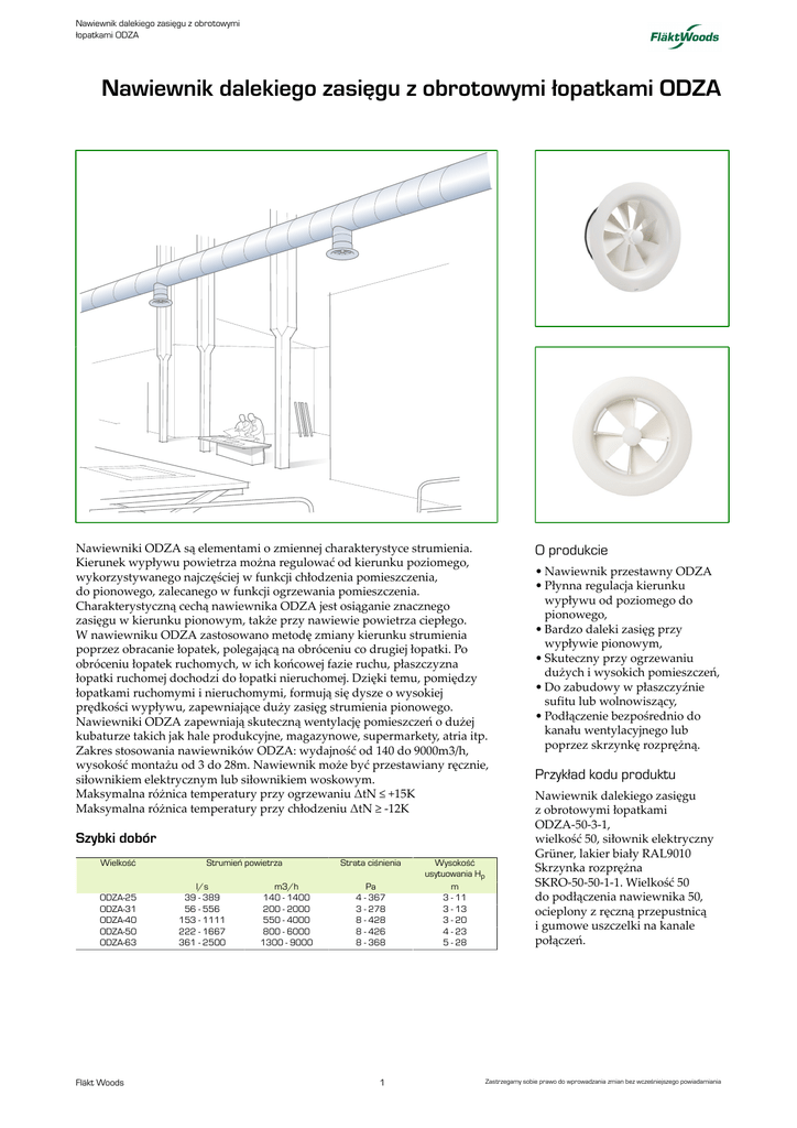 Nawiewnik dalekiego zasięgu z obrotowymi łopatkami ODZA Nawiewnik dalekiego zasięgu z obrotowymi łopatkami ODZA Nawiewniki ODZA są elementami o zmiennej charakterystyce strumienia. Kierunek wypływu powietrza można regulować od kierunku poziomego, wykorzystywanego najczęściej w funkcji chłodzenia pomieszczenia, do pionowego, zalecanego w funkcji ogrzewania pomieszczenia. Charakterystyczną cechą nawiewnika ODZA jest osiąganie znacznego zasięgu w kierunku pionowym, także przy nawiewie powietrza ciepłego. W nawiewniku ODZA zastosowano metodę zmiany kierunku strumienia poprzez obracanie łopatek, polegającą na obróceniu co drugiej łopatki. Po obróceniu łopatek ruchomych, w ich końcowej fazie ruchu, płaszczyzna łopatki ruchomej dochodzi do łopatki nieruchomej. Dzięki temu, pomiędzy łopatkami ruchomymi i nieruchomymi, formują się dysze o wysokiej prędkości wypływu, zapewniające duży zasięg strumienia pionowego. Nawiewniki ODZA zapewniają skuteczną wentylację pomieszczeń o dużej kubaturze takich jak hale produkcyjne, magazynowe, supermarkety, atria itp. Zakres stosowania nawiewników ODZA: wydajność od 140 do 9000m3/h, wysokość montażu od 3 do 28m. Nawiewnik może być przestawiany ręcznie, siłownikiem elektrycznym lub siłownikiem woskowym. Maksymalna różnica temperatury przy ogrzewaniu ΔtN ≤ +15K Maksymalna różnica temperatury przy chłodzeniu ΔtN ≥ -12K Szybki dobór Wielkość ODZA-25 ODZA-31 ODZA-40 ODZA-50 ODZA-63 Fläkt Woods Strumień powietrza l/s 39 - 389 56 - 556 153 - 1111 222 - 1667 361 - 2500 m3/h 140 - 1400 200 - 2000 550 - 4000 800 - 6000 1300 - 9000 Strata ciśnienia Pa 4 - 367 3 - 278 8 - 428 8 - 426 8 - 368 1 Wysokość usytuowania Hp m 3 - 11 3 - 13 3 - 20 4 - 23 5 - 28 O produkcie • Nawiewnik przestawny ODZA • Płynna regulacja kierunku wypływu od poziomego do pionowego, • Bardzo daleki zasięg przy wypływie pionowym, • Skuteczny przy ogrzewaniu dużych i wysokich pomieszczeń, • Do zabudowy w płaszczyźnie sufitu lub wolnowiszący, • Podłączenie bezpośrednio do kanału wentylacyjnego lub poprzez skrzynkę rozprężną. Przykład kodu produktu Nawiewnik dalekiego zasięgu z obrotowymi łopatkami ODZA-50-3-1, wielkość 50, siłownik elektryczny Grüner, lakier biały RAL9010 Skrzynka rozprężna SKRO-50-50-1-1. Wielkość 50 do podłączenia nawiewnika 50, ocieplony z ręczną przepustnicą i gumowe uszczelki na kanale połączeń. Zastrzegamy sobie prawo do wprowadzania zmian bez wcześniejszego powiadamiania Nawiewnik dalekiego zasięgu z obrotowymi łopatkami ODZA Zasięg strumienia, przepływ powietrza, strata ciśnienia, poziom ciśnienia ODZA-25 – zasięg strumieniaakustycznego pionowego – funkcja ogrzewania ODZA-25 –zasięg strumienia poziomego – funkcja chłodzenia ODZA-25 – przepływ powietrza, strata ciśnienia, parametry akustyczne Na wykresie podano poziom ciśnienia akustycznego LA10 [dB(A)] dla pomieszczenia o powierzchni pochłaniania 10m2 i tłumieniu 4dB. Fläkt Woods 2 Zastrzegamy sobie prawo do wprowadzania zmian bez wcześniejszego powiadamiania Nawiewnik dalekiego zasięgu z obrotowymi łopatkami ODZA Zasięg strumienia, przepływ powietrza, strata ciśnienia, poziom ciśnienia ODZA-31 – zasięg strumieniaakustycznego pionowego – funkcja ogrzewania ODZA-31 – zasięg strumienia poziomego – funkcja chłodzenia ODZA-31 – przepływ powietrza, strata ciśnienia, parametry akustyczne Na wykresie podano poziom ciśnienia akustycznego LA10 [dB(A)] dla pomieszczenia o powierzchni pochłaniania 10m2 i tłumieniu 4dB. Fläkt Woods 3 Zastrzegamy sobie prawo do wprowadzania zmian bez wcześniejszego powiadamiania Nawiewnik dalekiego zasięgu z obrotowymi łopatkami ODZA Zasięg strumienia, przepływ powietrza, strata ciśnienia, poziom ciśnienia ODZA-40 – zasięg strumieniaakustycznego pionowego – funkcja ogrzewania ODZA-40 – zasięg strumienia poziomego – funkcja chłodzenia ODZA-40 – przepływ powietrza, strata ciśnienia, parametry akustyczne Na wykresie podano poziom ciśnienia akustycznego LA10 [dB(A)] dla pomieszczenia o powierzchni pochłaniania 10m2 i tłumieniu 4dB. Fläkt Woods 4 Zastrzegamy sobie prawo do wprowadzania zmian bez wcześniejszego powiadamiania Nawiewnik dalekiego zasięgu z obrotowymi łopatkami ODZA Zasięg strumienia, przepływ powietrza, strata ciśnienia, poziom ciśnienia ODZA-50 – zasięg strumieniaakustycznego pionowego – funkcja ogrzewania ODZA-50 – zasięg strumienia poziomego – funkcja chłodzenia ODZA-50 – przepływ powietrza, strata ciśnienia, parametry akustyczne Na wykresie podano poziom ciśnienia akustycznego LA10 [dB(A)] dla pomieszczenia o powierzchni pochłaniania 10m2 i tłumieniu 4dB. Fläkt Woods 5 Zastrzegamy sobie prawo do wprowadzania zmian bez wcześniejszego powiadamiania Nawiewnik dalekiego zasięgu z obrotowymi łopatkami ODZA Zasięg strumienia, przepływ powietrza, strata ciśnienia, poziom ciśnienia ODZA-63 – zasięg strumieniaakustycznego pionowego – funkcja ogrzewania ODZA-63 – zasięg strumienia poziomego – funkcja chłodzenia ODZA-63 – przepływ powietrza, strata ciśnienia, parametry akustyczne Na wykresie podano poziom ciśnienia akustycznego LA10 [dB(A)] dla pomieszczenia o powierzchni pochłaniania 10m2 i tłumieniu 4dB. Fläkt Woods 6 Zastrzegamy sobie prawo do wprowadzania zmian bez wcześniejszego powiadamiania Nawiewnik dalekiego zasięgu z obrotowymi łopatkami ODZA Maksymalny jednostkowy strumień powietrza wentylacyjnego, rozstaw nawiewników Maksymalny jednostkowy strumień powietrza wentylacyjnego * Przy założeniu średniej aktywności ok. 2 met i clo 0,5-0,6 (pomieszczenia spełniające to założenie: hale sprzedaży, przemysł lekki, magazyny, atria, sale widowiskowo-sportowe). Rozstaw nawiewników Fläkt Woods 7 Zastrzegamy sobie prawo do wprowadzania zmian bez wcześniejszego powiadamiania Nawiewnik dalekiego zasięgu z obrotowymi łopatkami ODZA Przykład d