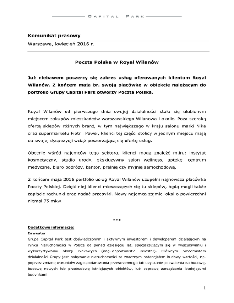 Komunikat prasowy Warszawa, kwiecień 2016 r. INFORMACJA PRASOWA Poczta Polska w Royal Wilanów Już niebawem poszerzy się zakres usług oferowanych klientom Royal Wilanów. Z końcem maja br. swoją placówkę w obiekcie należącym do portfolio Grupy Capital Park otworzy Poczta Polska. Royal Wilanów od pierwszego dnia swojej działalności stało się ulubionym miejscem zakupów mieszkańców warszawskiego Wilanowa i okolic. Poza szeroką ofertą sklepów różnych branż, w tym największego w kraju salonu marki Nike oraz supermarketu Piotr i Paweł, klienci tej części stolicy w jednym miejscu mają do swojej dyspozycji wciąż poszerzającą się ofertę usług. Obecnie wśród najemców tego sektora, klienci mogą znaleźć m.in.: instytut kosmetyczny, studio urody, ekskluzywny salon wellness, aptekę, centrum medyczne, biuro podróży, kantor, pralnię czy myjnię samochodową. Z końcem maja 2016 portfolio usług Royal Wilanów uzupełni najnowsza placówka Poczty Polskiej. Dzięki niej klienci mieszczących się tu sklepów, będą mogli także zapłacić rachunki oraz nadać przesyłki. Nowy najemca zajmie lokal o powierzchni niemal 75 mkw. *** Dodatkowe informacje: Inwestor Grupa Capital Park jest doświadczonym i aktywnym inwestorem i deweloperem działającym na rynku nieruchomości w Polsce od ponad dziesięciu lat, specjalizującym się w wyszukiwaniu i wykorzystywaniu okazji rynkowych (ang. opportunistic investor). Głównym przedmiotem działalności Grupy jest nabywanie nieruchomości ze znacznym potencjałem budowy wartości, np. poprzez zmianę warunków zagospodarowania przestrzennego lub uzyskanie pozwolenia na budowę, budowę nowych lub przebudowę istniejących obiektów, lub poprawę zarządzania istniejącymi budynkami. 1 Capital Park osiąga dochody z najmu oraz ze sprzedaży nieruchomości lub produktów inwestycyjnych opartych na nieruchomościach. Grupa aktywnie poszukuje możliwości zakupu nowych projektów nieruchomościowych oraz nowych źródeł dochodów i wzrostu wartości w obszarach rynku charakteryzujących się dużym potencjałem rozwoju. Od rozpoczęcia działalności w 2003 roku Grupa przeprowadziła ok. 100 transakcji inwestycyjnych i zarządza portfelem nieruchomości obejmującym 75 projektów o łącznej powierzchni wynajmu brutto ok. 250 tys. mkw., zlokalizowanych w 37 miastach. Spośród tych projektów 39 nieruchomości handlowych typu high-street znajduje się w strukturze nowo utworzonego, innowacyjnego na polskim rynku Real Estate Income Assets FIZ AN, którym Grupa aktywnie zarządza i w którym posiada 15-proc. udział. Na dzień 31 grudnia 2014 r. bieżąca wartość portfela nieruchomości zarządzanych przez Grupę wynosiła 1,6 mld zł. Na dzień 31 grudnia 2014 r. 79% bieżącej wartości portfela Grupy stanowiły nieruchomości w Warszawie, czyli na największym i jednym z najbardziej perspektywicznych rynków nieruchomości komercyjnych w Polsce. Biuro prasowe Capital Park Joanna Cybulska tel. 0 48 22 642 24 16, + 48 609 71 63 05 email: [email protected] Marcin Markowski tel. 0 48 22 642 24 16, + 48 609 71 61 13 email: [email protected] 2