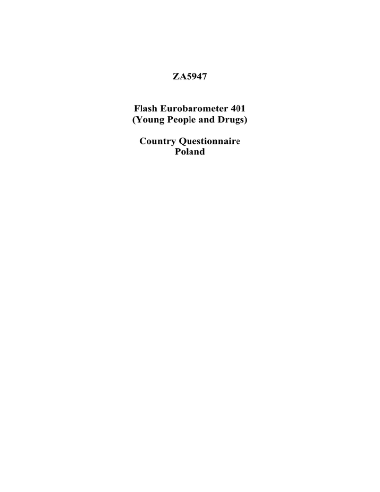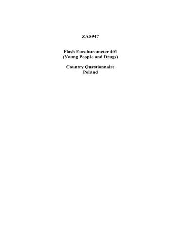 ZA5947 Flash Eurobarometer 401 (Young People and Drugs) Country Questionnaire Poland FL401 - Youth Attitudes on Drugs - PL Ile ma Pan(i) lat? D1 (ZAPISZ – JEŚLI „ODMOWA” KOD „99”) D2 Płeć respondenta mężczyzna kobieta 1 2 ROTUJ KOLEJNOŚĆ POZYCJI OD 1 DO 10 Q1 Jeśli chciał(a)by Pan(i) uzyskać informacje na temat nielegalnych narkotyków i ogólnie ich używania, do kogo by się Pan(i) zwrócił(a)? Proszę wybrać do trzech odpowiedzi. (ODCZYTAJ ‐ MAKSYMALNIE TRZY ODPOWIEDZI) Przyjaciel, dobry znajomy Rodzice lub krewni Ktoś w szkole lub w pracy Lekarz, pielęgniarka lub inny specjalista w zakresie ochrony zdrowia Pracownik socjalny lub do spraw pracy z młodzieżą Wyspecjalizowany terapeuta lub ośrodek do spraw narkotyków Policja Telefoniczna linia pomocy Internet (strony lub czaty) Mass media (gazety, czasopisma, telewizja, radio) Inne (NIE ODCZYTUJ) Nie chce mieć więcej informacji (NIE ODCZYTUJ) To zależy (NIE ODCZYTUJ) Żadne z powyższych (NIE ODCZYTUJ) Nie wiem/brak odpowiedzi (NIE ODCZYTUJ) 1, 2, 3, 4, 5, 6, 7, 8, 9, 10, 11, 12, 13, 14, 15, NEW ROTUJ KOLEJNOŚĆ POZYCJI OD 1 DO 7 Q2 Czy w ciągu ostatniego roku otrzymał(a) Pan(i) informacje w któryś z następujących sposobów o skutkach i zagrożeniach używania nielegalnych narkotyków? Proszę wybrać do trzech odpowiedzi. (ODCZYTAJ ‐ MAKSYMALNIE TRZY ODPOWIEDZI) Poprzez program prewencyjny w szkole Od przyjaciół Od rodziców lub krewnych Poprzez kampanię w mediach 1, 2, 3, 4, 1 Poprzez policję Znalezienie informacji w Internecie (na stronach lub czatach) Poprzez telefoniczną linię pomocy do spraw narkotyków lub alkoholu W ogóle nie otrzymałem(am) informacji (NIE ODCZYTUJ) Inne (NIE ODCZYTUJ) Nie wiem/brak odpowiedzi (NIE ODCZYTUJ) 5, 6, 7, 8, 9, 10, NEW Q3 Obecnie bywają czasami dostępne nowe substancje, które imitują działanie nielegalnych narkotyków, takich jak konopie indyjskie, ecstasy, kokaina itp. Są one czasami nazywane "dopalaczami" i mogą występować w różnych formach, na przykład jako mieszanki ziołowe, proszek, kryształki lub tabletki. Czy kiedykolwiek używał(a) Pan(i) takich substancji? (ODCZYTAJ ‐ TYLKO JEDNA ODPOWIEDŹ) Nie, nigdy Tak, w ciągu ostatnich 30 dni Tak, w ciągu ostatnich 12 miesięcy Tak, ale ponad 12 miesięcy temu Odmowa (NIE ODCZYTUJ) Nie wiem/brak odpowiedzi (NIE ODCZYTUJ) 1 2 3 4 5 6 NEW ZADAĆ PYTANIA Q4 I Q5 TYLKO JEŚLI RESPONDENT(KA) UŻYWAŁ(A) TAKICH SUBSTANCJI W CIĄGU OSTATNICH 12 MIESIĘCY, KOD 2 I 3 W Q3 ‐ POZOSTALI PRZECHODZĄ DO Q6 ROTUJ POZYCJE OD 1 DO 4 Q4 A jeśli chodzi o użycie tych nowych substancji w ciągu ostatnich 12 miesięcy, to w jaki sposób je Pan(i) uzyskał(a)? (ODCZYTAJ ‐ MOŻLIWE KILKA ODPOWIEDZI) Otrzymałem(am) lub kupiłem(am) je od przyjaciela/dobrego znajomego Kupiłem(am) je w specjalistycznym sklepie Kupiłem(am) je w Internecie Kupiłem(am) je od handlarza narkotyków Inne (NIE ODCZYTUJ) Nie wiem/brak odpowiedzi (NIE ODCZYTUJ) 1, 2, 3, 4, 5, 6, NEW ROTUJ POZYCJE OD 1 DO 4 2 Q5 A jeśli chodzi o użycie tych nowych substancji w ciągu ostatnich 12 miesięcy, to w jakich okolicznościach ich Pan(i) używał(a)? (ODCZYTAJ ‐ MOŻLIWE KILKA ODPOWIEDZI) W samotności, prywatnie Z przyjaciółmi/dobrymi znajomymi Podczas przyjęcia lub imprezy (np. na festiwalu muzycznym, w klubie) Podczas zwykłych codziennych zajęć (np. nauka, praca) Inne (NIE ODCZYTUJ) Nie wiem/brak odpowiedzi (NIE ODCZYTUJ) 1, 2, 3, 4, 5, 6, NEW DLA WSZYSTKICH ROTUJ KOLEJNOŚĆ POZYCJI OD 1 DO 7 Q6 Czy w ciągu ostatniego roku otrzymał(a) Pan(i) informacje w któryś z następujących sposobów o skutkach i zagrożeniach używania nowych substancji, które imitują działanie nielegalnych narkotyków? Proszę wybrać do trzech odpowiedzi. (ODCZYTAJ ‐ MAKSYMALNIE TRZY ODPOWIEDZI) Poprzez program prewencyjny w szkole Od przyjaciół/znajomych Od rodziców lub krewnych Poprzez kampanię w mediach Poprzez policję Z informacji w Internecie (na stronach lub czatach) Poprzez telefoniczną linię pomocy do spraw narkotyków lub alkoholu W ogóle nie otrzymałem(am) informacji (NIE ODCZYTUJ) Inne (NIE ODCZYTUJ) Nie wiem/brak odpowiedzi (NIE ODCZYTUJ) 1, 2, 3, 4, 5, 6, 7, 8, 9, 10, NEW Q7 Do jakiego stopnia Pana(i) zdaniem następujące sytuacje mogą stanowić ryzyko dla ludzkiego zdrowia? (ODCZYTAJ ‐ TYLKO JEDNA ODPOWIEDŹ) 3 1 2 3 4 5 6 7 8 9 Duże ryzyko Średnie ryzyko Małe ryzyko Nie ma ryzyka Nie wiem/brak odpowied zi (NIE ODCZYTUJ ) 1 2 3 4 5 1 2 3 4 5 1 2 3 4 5 1 2 3 4 5 1 2 3 4 5 1 1 2 2 3 3 4 4 5 5 1 2 3 4 5 1 2 3 4 5 1 2 3 4 5 Zażycie raz lub dwa konopi indyjskich Regularne zażywanie konopi indyjskich Zażycie raz lub dwa ecstasy Regularne zażywanie ecstasy Wypicie raz czy dwa alkoholu Regularne picie alkoholu Zażycie raz czy dwa kokainy Regularne zażywanie kokainy Zażycie raz czy dwa nowych substancji, które imitują działanie nielegalnych narkotyków 10 Regularne zażywanie nowych substancji, które imitują działanie nielegalnych narkotyków NEW ROTUJ KOLEJNOŚĆ POZYCJI OD 1 DO 7 Q8 Jakie byłyby, Pana(i) zdaniem, trzy najefektywniejsze sposoby dla władz publicznych, aby zmniejszyć problemy z narkotykami? (ODCZYTAJ ‐ MAKSYMALNIE TRZY ODPOWIEDZI) Informacja i kampania zapobiegawcza Leczenie i resocjalizacja osób zażywających narkotyki Surowe kroki wobec dilerów i handlarzy narkotykowych Legalizacja narkotyków Zmniejszenie poziomu biedy i bezrobocia Surowe kroki wobec osób zażywających narkotyki 1, 2, 3, 4, 5, 6, 4 7, 8, 9, Więcej możliwości w zakresie spędzania wolnego czasu Inne (NIE ODCZYTUJ) Nie wiem/brak odpowiedzi (NIE ODCZYTUJ) NEW ROTUJ KOLEJNOŚĆ STWIERDZEŃ OD 1 DO 6 Q9 Sprzedaż takich narkotyków jak konopie indyjskie, kokaina, ecstasy i heroina jest oficjalnie zakazana we wszystkich państwach członkowskich Unii Europejskiej. Sprzedaż legalnych substancji takich jak alkohol i tytoń nie jest zabroniona, ale jest regulowana we wszystkich krajach Unii Europejskiej. Czy myśli