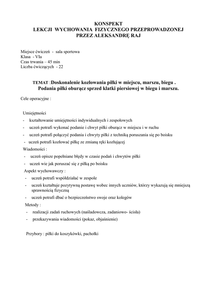 KONSPEKT LEKCJI WYCHOWANIA FIZYCZNEGO PRZEPROWADZONEJ PRZEZ ALEKSANDRĘ RAJ Miejsce ćwiczeń - sala sportowa Klasa - VIa Czas trwania – 45 min Liczba ćwiczących - 22 TEMAT :Doskonalenie kozłowania piłki w miejscu, marszu, biegu . Podania piłki oburącz sprzed klatki piersiowej w biegu i marszu. Cele operacyjne : Umiejętności - kształtowanie umiejętności indywidualnych i zespołowych - uczeń potrafi wykonać podanie i chwyt piłki oburącz w miejscu i w ruchu - uczeń potrafi połączyć podania i chwyty piłki z techniką poruszania się po boisku - uczeń potrafi kozłować piłkę ze zmianą ręki kozłującej Wiadomości : uczeń opisze popełniane błędy w czasie podań i chwytów piłki - - uczeń wie jak poruszać się z piłką po boisku Aspekt wychowawczy : - uczeń potrafi współdziałać w zespole - uczeń kształtuje pozytywną postawę wobec innych uczniów, którzy wykazują się mniejszą sprawnością fizyczną - uczeń potrafi dbać o bezpieczeństwo swoje oraz kolegów Metody : - realizacji zadań ruchowych (naśladowcza, zadaniowo- ścisła) - przekazywania wiadomości (pokaz, objaśnienie) Przybory : piłki do koszykówki, pachołki Tok lekcji Część wstępna ( 10 min ) Zadania szczegółowe Uwagi Zbiórka w szeregu xxxxxxxxxxxx Powitanie grupy. Podanie tematu i celów lekcji xxxxxxxxxxxx Motywacja do zajęć. Prowadzenie rozgrzewki przez ucznia. Część główna ( 30 min ) uczniowie jeden za drugim, po obwodzie koła 1. Marsz po kole - kozłowania piłki w marszu na sygnał zmiana reki kozłującej (PR,LR) 2. Bieg po kole - kozłowanie piłki na sygnał zmiana ręki kozłującej (PR,LR) 3. Marsz w pozycji niskiej - przenoszenie piłki pod zgiętą nogą 4. Kozłowanie w miejscu ze zmianą ręki kozłującej 5. Kozłowanie piłki w miejscu do siadu skrzyżnego – do wyprostu 6.Ćwiczenia w parach -podania piłki w miejscu sprzed klatki piersiowej - podania piłki w miejscu kozłem do współćwiczącego 7.Ćwiczenie w parach w biegu - podania piłki krok odstawno – dostawny do kolegi podania piłki kozłem 8.Podania piłki krok odstawno – dostawny rzut do kosza sprzed klatki piersiowej - podania kozłem rzut do kosza 9. Kozłowanie slalomem prawą i lewą ręką piłki w marszu, biegu – rzut do kosza. Poprawna technika wykonywania każdego ćwiczenia 1.Ćwiczenia uspokajające : Część końcowa ( 5 min ) - każdy uczeń wykonuje leżenie tyłem, zamyka oczy i wykonuje głęboki wdech i wydech. 2. Omówienie lekcji, zbiórka , pożegnanie Pogadanka