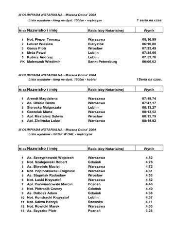 III OLIMPIADA NOTARIALNA - Mszana Dolna' 2004 Lista wyników - bieg na dyst. 1500m - męŜczyzn M-ce Nazwisko i imię Not. Pieper Tomasz Lelusz Wiesław 3 Garus Piotr 4 Mróz Paweł 5 Kubicz Andrzej PK Malerczuk Władimir 1 2 Rada Izby Notarialnej Warszawa Białystok Wrocław Lublin Lublin Sankt Petersburg III OLIMPIADA NOTARIALNA - Mszana Dolna' 2004 Lista wyników - bieg na dyst. 1500m - kobiet M-ce Nazwisko 1 2 3 4 5 6 i imię Arendt Magdalena As. Otkała Beata Sierocka Małgorzata Gorzelak Marta Apl. Mastalerz Sylwia Apl. Zielińska Luiza Rada Izby Notarialnej Warszawa Warszawa Lublin Warszawa Wrocław Warszawa 1 seria na czas Wynik 05:16,99 06:10,80 07:33,49 07:35,66 07:53,78 06:06,02 1Seria na czas, Wynik 07:19,74 07:47,17 08:13,27 08:13,52 08:13,79 08:15,92 III OLIMPIADA NOTARIALNA - Mszana Dolna' 2004 Lista wyników - SKOK W DAL - męŜczyzn M-ce Nazwisko 1 2 3 4 5 6 7 8 9 10 11 12 13 i imię As. Szczypkowski Wojciech Not. Szulejewski Robert As. Biwejnis Maciej Not. Popłonkowski Zbigniew As. Stępniak Radosław Not. Łaski Krzysztof Apl. Poćwiardowski Marcin Not. Pietrasik Cezary As. Dobosz Adam Not. Kondracki Krzysztof Not. Salwa Henryk Not. Rowicki Marek As. Szyszko Piotr Rada Izby Notarialnej Warszawa Gdańsk Warszawa Warszawa Wrocław Warszawa Poznań Gdańsk Gdańsk Lublin Rzeszów Warszawa Poznań Wynik 4,82 4,76 4,72 4,61 4,53 4,52 4,46 4,40 4,38 4,37 4,11 4,00 3,28 III OLIMPIADA NOTARIALNA - Mszana Dolna' 2004 Lista wyników - SKOK W DAL - kobiet M-ce Nazwisko 1 2 3 4 5 6 7 8 9 10 11 12 13 14 14 i imię Apl. Słodkowska-Pęk Anna Not. Panc Ewa Not. Zapart Aleksandra Not. Kultys Anna Not. Sierocka Małgorzata Not. Dziedzic Anna Not. Tomaszewska BoŜena Apl. Obler-Fortuna Anna As. Otkała Beata Not. Woznesenskaja Elena Not. Uliasz Agata Not. Szarek Violetta Not. Szerer Anna Apl. Kołodziej Kamila Not. Bieriukowa Swietłana Rada Izby Notarialnej Kraków Gdańsk Warszawa Lublin Lublin Warszawa Wrocław Rzeszów Warszawa Sankt Petersburg Rzeszów Katowice Wrocław Wrocław Sankt Petersburg Wynik 3,73 3,73 3,65 3,47 3,46 3,44 3,40 3,39 3,36 3,05 3,00 2,86 2,76 2,68 2,68 III OLIMPIADA NOTARIALNA - Mszana Dolna' 2004 Lista wyników - PCHNIĘCIE KULĄ - kobiet M-ce Nazwisko 1 2 3 4 5 6 7 8 9 10 11 12 13 14 15 16 17 i imię Not. Woznesenskaja Elena As. Otkała Beata As. Nałęcz Kinga Not. Panc Ewa Apl. Słodkowska-Pęk Anna As. Dziedzic Anna Not. Michalczyk-Łuczak Bernadetta Not. Goraj ElŜbieta Not. Szewczyk Ewa Not. Sierocka Małgorzata As. Statkiewicz-Wysocka Urszula As. Gardocka Jolanta As. Not. Serafin Ewa Not. Zacharowa Elena Not. Japart Aleksandra Not. Kostka Krystyna Not. Niedziałkowska Ewa Rada Izby Notarialnej Sankt Petersburg Warszawa Warszawa Gdańsk Kraków Warszawa Rzeszów Rzeszów Rzeszów Lublin Warszawa Warszawa Warszawa Sankt Petersburg Warszawa Rzeszów Katowice Wynik 7,00 6,81 6,65 6,44 6,39 6,25 6,12 6,07 5,92 5,88 5,86 5,85 5,77 5,72 5,70 5,54 5,18 18 19 20 20 20 20 20 25 26 26 28 Not. Uliasz Agata Not. Górska-Galewicz Lidia Not . Szara Małgorzata Not. Aszka-Łunina Olga Not. Bender BoŜena Not. Biriukowa Swietłana Not. Tomala Violetta Not. Litwa-Jazgar Justyna Not. Gąsior ElŜbieta Not. Paszkiewicz Maria Not. Szatko Barbara Rzeszów Rzeszów Rzeszów Sankt Petersburg Rzeszów Sankt Petersburg Kraków Kraków Rzeszów Gdańsk Kraków 4,92 4,83 4,76 4,76 4,76 4,76 4,76 4,57 4,47 4,47 4,00 III OLIMPIADA NOTARIALNA - Mszana Dolna' 2004 Lista wyników - PCHNIĘCIE KULĄ - męŜczyzn M-ce Nazwisko 1 2 3 4 5 6 7 8 9 10 11 12 13 14 15 16 17 18 19 20 21 i imię Not. Roztoczyński Łukasz As. Stępniak Radosław Apl. Grobelny Bartosz As. Wiśniowski Radosław Not. Błaszczyk Robert Apl. Poćwiardowski Marcin Not. Ruśkowski Ryszard Not. Lis Piotr As. Szafrański Sebastian Not. Salwa Henryk Not. Uba Andrzej As. Biwejnis Maciej Apl. Truszkiewicz Jan Apl. Daleszyński Jacek Not. Abramczyk Tomasz Apl. Stępniak Olaf As. Frąszczak Igor Not. Błaszczyk Grzegorz Not. DomŜał Ryszard Not. Białachowski Paweł Apl. Celewicz Tadeusz Rada Izby Notarialnej Wynik Katowice Wrocław Poznań Rzeszów Warszawa Poznań Katowice Gdańsk Wrocław Rzeszów Rzeszów Warszawa Kraków Poznań Warszawa Wrocław Wrocław Łódź Warszawa Rzeszów Kraków 12,21 11,41 10,76 10,71 10,31 10,20 10,12 10,10 9,95 9,80 9,71 9,70 9,23 9,00 8,98 8,94 8,92 8,90 8,86 8,35 8,13 III OLIMPIADA NOTARIALNA - Mszana Dolna' 2004 Lista wyników - rzuty do kosza M-ce Nazwisko i imię 1 As. Stępniak Radosław 2 3 Not. Wierzchucki Dariusz Not. Robak Adam 4 4 4 4 4 4 Not. Sierocka Małgorzata As. Gregorczyk Marcin Not. Pietryga Jarosław Apl. Skurowski Marcin Not. Sokołowski Adam Apl. Dąbrowski Piotr 10 As. Biwejnis Maciej 11 11 11 11 11 11 11 11 11 11 11 22 22 22 22 22 22 22 22 22 22 22 33 Apl. Arendt Magdalena Apl. Kondracki Krzysztof Not. Dębski Sławomir Not. Dobosz Adam Not. Langowski Piotr Apl. Poćwiardowski Marcin Not. Grzybczyk Adam Not. Białachowski Paweł Not. Ziółkowska Violetta Not. Przybyłowicz Andrzej Not. Paetz Tadeusz Not. Otkała Beata Not. Ziółkowski Andrzej Not. Fedorowicz Paweł Not. Myga Waldemar Not. Zacharowa Jelena Not. Geracimienko Piotr Wasiliewicz Not. Borkowski Mikołaj Not. Waśkiewicz Renata Not. Strzępek Artur Not. Urbanik Andrzej Not. Gilner Krzysztof Not. Tomaszewska BoŜena 33 33 33 33 33 Not. Dziedzic Anna As. Roztoczyński Łukasz Not. Letkiewicz Andrzej Not. Woznesenskaja Apl. Frąszczak Igor Rada Izby Notarialnej Wrocław Warszawa Katowice Lublin Katowice Katowice Warszawa Wrocław Poznań Warszawa Warszawa Lublin Kraków Gdańsk Gdańsk Poznań Katowice Rzeszów Łódź Poznań Poznań Warszawa Łódź Białystok Wrocław Sankt Petersburg Sankt Petersburg Poznań Łódź Łódź Kraków Katowice Wrocław Warszawa Katowice Katowice Sankt Petersburg Wrocław Wynik 10 9 8 7 7 7 7 7 7 6 3 3 3 3 3 3 3 3 3 3 3 2 2 2 2 2 2 2 2 2 2 2 1 1 1 1 1 1 33 33 33 33 43 43 43 43 43 43 43 43 Not. Śleziak Wiesław Not. Piechocki Piotr Not. Wojcieska Renata Apl. Zielińska Lu