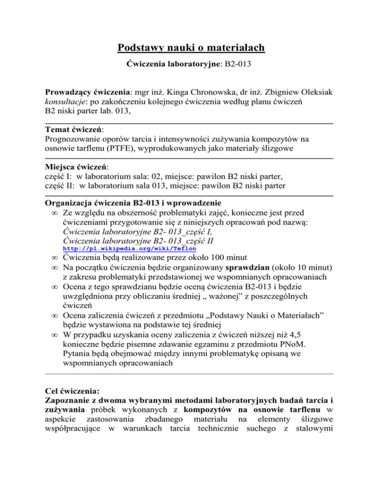 Podstawy nauki o materiałach Ćwiczenia laboratoryjne: B2-013 Prowadzący ćwiczenia: mgr inż. Kinga Chronowska, dr inż. Zbigniew Oleksiak konsultacje: po zakończeniu kolejnego ćwiczenia według planu ćwiczeń B2 niski parter lab. 013, Temat ćwiczeń: Prognozowanie oporów tarcia i intensywności zużywania kompozytów na osnowie tarflenu (PTFE), wyprodukowanych jako materiały ślizgowe Miejsca ćwiczeń: część I: w laboratorium sala: 02, miejsce: pawilon B2 niski parter, część II: w laboratorium sala 013, miejsce: pawilon B2 niski parter Organizacja ćwiczenia B2-013 i wprowadzenie • Ze względu na obszerność problematyki zajęć, konieczne jest przed ćwiczeniami przygotowanie się z niniejszych opracowań pod nazwą: Ćwiczenia laboratoryjne B2- 013_część I, Ćwiczenia laboratoryjne B2- 013_część II http://pl.wikipedia.org/wiki/Teflon • Ćwiczenia będą realizowane przez około 100 minut • Na początku ćwiczenia będzie organizowany sprawdzian (około 10 minut) z zakresu problematyki przedstawionej we wspomnianych opracowaniach • Ocena z tego sprawdzianu będzie oceną ćwiczenia B2-013 i będzie uwzględniona przy obliczaniu średniej „ ważonej” z poszczególnych ćwiczeń • Ocena zaliczenia ćwiczeń z przedmiotu „Podstawy Nauki o Materiałach” będzie wystawiona na podstawie tej średniej • W przypadku uzyskania oceny zaliczenia z ćwiczeń niższej niż 4,5 konieczne będzie pisemne zdawanie egzaminu z przedmiotu PNoM. Pytania będą obejmować między innymi problematykę opisaną we wspomnianych opracowaniach Cel ćwiczenia: Zapoznanie z dwoma wybranymi metodami laboratoryjnych badań tarcia i zużywania próbek wykonanych z kompozytów na osnowie tarflenu w aspekcie zastosowania zbadanego materiału na elementy ślizgowe współpracujące w warunkach tarcia technicznie suchego z stalowymi nierdzewnymi elementami maszyn (np. tłokowe pierścienie uszczelniające współpracujące z tulejami cylindrowymi, łożyska ślizgowe, prowadnice itp.) Szablon do sprawdzianu: Przed ćwiczeniami należy koniecznie zaopatrzyć się w szablon do wpisywania odpowiedzi (jak pokazano niżej) a następnie wypełnić go „drukowanymi” literami: • nazwisko i imię (bardzo czytelnie), • nr grupy ćwiczeniowej (według podziału na harmonogramie ćwiczeń), • zaplanowaną datą i godziną rozpoczęcia ćwiczeń. Szablon można: • wykupić w punkcie ksero (usytuowanym w B2 na niskim parterze w końcowej części korytarza), • kserować na automatycznej kserokopiarce usytuowanej na początku korytarzu na niskim parterze w pawilonie B2 w której może być(?) matryca szablonu • wydrukować sam szablon (na połowie kartki formatu A4- bez zmiany powiększenia! tzn. 100%, tak a żeby wymiary zewnętrznej ramki tabelki wynosiły:115 x164 mm ). Odwrotną stronę szablonu należy pozostawić nie zadrukowaną dla odpowiedzi na pytania teoretyczne. Szablon do wpisywania odpowiedzi na pytania kontrolne podczas sprawdzianu Symbol testu……… Data…......., Godzina………, Nazwisko, Imię, nr grupy ćwiczeniowej………………………… Proszę wpisać „DRUKOWANYMI” literami symbol testu oraz swoje Nazwisko, Imię, nr grupy ćwiczeniowej a następnie ocenić prawdziwość tylko tych zdań (umieszczonych na wręczonym każdemu arkuszu- 20 zdań), które potrafimy ocenić, czy są prawdziwe czy fałszywe a następnie wstawić znaki „x” w odpowiedniej kolumnie tabelki. W przypadku pomyłkowego umieszczenia tego znaku należy go zakreślić okręgiem. Za poprawna ocenę zdania przewidziano 1 punkt. W przypadku błędnej oceny zdania, odejmowane będzie ½ punktu. Nr zdania 1 2 3 4 5 6 7 8 9 10 Prawdziwe Fałszywe Nr zdania 11 12 13 14 15 16 17 18 19 20 Prawdziwe Fałszywe Organizacja testu: • Na początku ćwiczenia będzie wręczony każdemu arkusz a na nim 20 zdań twierdzących, ponumerowanych od 1 do 20. Każdy arkusz jest oznaczony (w lewym górnym rogu) symbolem testu np. ZO-2009-B. • Symbol wręczonego testu należy wpisać na indywidualnym szablonie do wpisywania odpowiedzi (brak tego symbolu na tym szablonie uniemożliwi ocenę sprawdzianu!). • Zabronione jest umieszczanie jakichkolwiek znaków na (wręczonym każdemu) arkuszu zawierającym 20 zdań twierdzących. • Na podstawie opracowań: o „ćwiczenia laboratoryjne B2- 013_cz I”, o „ćwiczenia laboratoryjne B2- 013_cz II” o informacji na stronie Internetowej: http://pl.wikipedia.org/wiki/Teflon można ocenić każde ze zdań (wręczonych na arkuszu) czy jest prawdziwe czy fałszywe. • W wierszu oznaczonym numerem zdania wpisujemy wynik oceny tego zdania twierdzącego jako „X” w jednej z dwu kolumn oznaczonych „Prawdziwe” lub „Fałszywe ”. • W przypadku pomyłkowego umieszczenia znaku „X” w nie odpowiedniej kolumnie należy ten znak zakreślić kołem i wpisać „X” we właściwej kolumnie. Przykładowe zdania twierdzące umieszczane na arkuszu a podlegające ocenie; czy są prawdziwe czy fałszywe: 1. Próbki do badań tarcia i zużywania są wycinane z półfabrykatu kompozytu w sposób przypadkowy względem kierunku prasowania tego kompozytu. 2. Wypełniacze są wprowadzane do płynnego tarflenu w celu ich wzajemnego zmieszania w procesie produkcji danego kompozytu tarflenowego. 3. Tłokowe pierścienie uszczelniające w sprężarce do tlenu nie wolno smarować, itp • W przypadku gdy nie posiadamy informacji do oceny konkretnego zdania to wydaje się korzystniej ażeby nie wpisywać znaku „X” w którąkolwiek kolumnę albowiem za błędną ocenę tego zdania będzie naliczona ujemna wartość½ punkta. Za poprawną ocenę zdania przysługuje jeden punkt. • Pozytywną ocenę z tego sprawdzianu uzyskujemy za co najmniej12 punktów. Po zakończeniu oceny zdań twierdzących, należy zarówno wręczony arkusz z 20 zdaniami jak i indywidualny wypełniony szablon (do wpisywania odpowiedzi) zwrócić prowadzącemu ćwiczenia. • W przyp