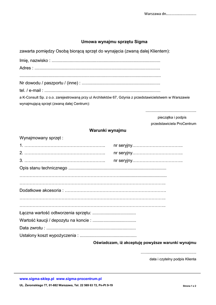 Warszawa dn…………………………… Umowa wynajmu sprzętu Sigma zawarta pomiędzy Osobą biorącą sprzęt do wynajęcia (zwaną dalej Klientem): Imię, nazwisko : .......................................................................................... Adres : ........................................................................................................ ..................................................................................................................... Nr dowodu / paszportu / (inne) : ................................................................. tel. / e-mail : ................................................................................................ a K-Consult Sp. z o.o. zarejestrowaną przy ul Architektów 67, Gdynia z przedstawicielstwem w Warszawie wynajmującą sprzęt (zwaną dalej Centrum): .......................................... pieczątka i podpis przedstawiciela ProCentrum Warunki wynajmu Wynajmowany sprzęt : 1. ……………………………………………….. nr seryjny…………………………….. 2. ……………………………………………….. nr seryjny…………………………….. 3. ……………………………………………….. nr seryjny…………………………….. Opis stanu technicznego ................................................................................. ……………………………………………………………....................................... ……………………………………………………………………………………….. Dodatkowe akcesoria : ……………………………………………………………. ……………………………………………………………………………………….. ……………………………………………………………………………………….. Łączna wartość odtworzenia sprzętu: .................................... Wartość kaucji / depozytu na koncie : .................................... Data zwrotu : .......................................................................... Ustalony koszt wypożyczenia : ............................................... Oświadczam, iż akceptuję powyższe warunki wynajmu .............................................. data i czytelny podpis Klienta www.sigma-sklep.pl www.sigma-procentrum.pl UL. Żeromskiego 77, 01-882 Warszawa, Tel. 22 569 63 72, Pn-Pt 9-19 Strona 1 z 2 Umowa wynajmu sprzętu Sigma Zasady wynajmu 1. Centrum jest jedynym prawomocnym właścicielem i dysponentem wypożyczanego sprzętu, i niniejszym wyraża zgodę na wynajęcie ww. Sprzętu. 2. Klient przejmuje pełną odpowiedzialność za wynajęty sprzęt do czasu sprawdzenia go przez pracownika Salonu. Klient przejmuje sprzęt sprawny, bez uszkodzeń i zobowiązuje się zwrócić go w takim samym stanie w jakim go wynajął. 3. W przypadku transakcji bezgotówkowych Klient przelewa kaucję na konto sklepu. Obiektyw zostanie wydany po zaksięgowaniu środków na koncie sklepu. Przelew zwrotny kaucji nastąpi najpóźniej następnego dnia roboczego. 4. Klient nie będzie obciążony kosztem 3 dniowego najmu w sytuacji decyzji o zakupie wynajmowanego modelu podjętej w trakcie zwrotu sprzętu. Zakup musi nastąpić w ciągu 30 dni od daty wypożyczenia. 5. W przypadku uszkodzenia sprzętu przez Klienta w trakcie trwania najmu, Klient zobowiązuje się do zwrotu kosztów związanych z usunięciem uszkodzeń, zgodnie z wyceną Autoryzowanego Serwisu Sigma z Gdyni. Koszty zostaną uregulowane przez Klienta lub potrącone z kwoty kaucji. W przypadku braku możliwości naprawy lub utraty sprzętu Klient jest zobowiązany pokryć pełną kwotę odtworzenia sprzętu. 6. Klient ma prawo odpłatnego przedłużenia okresu wypożyczenia. Zgłoszenie chęci przedłużenia powinno nastąpić min. 20 godzin przed upływem daty zwrotu wynajmu. 7. Jeżeli zwrot wynajmowanego sprzętu nie nastąpi w deklarowanym przez Klienta okresie, zostaną naliczone odsetki karne w wysokości ………. zł/24h, a sprzęt może zostać zgłoszony na policję jako skradziony. Bądź na bieżąco i korzystaj z promocji, zapisz się do naszego newslettera. Odbierz 5% rabatu na wypożyczenie obiektywu lub zakup akcesoriów. Wyrażam zgodę na przesyłanie informacji handlowych drogą elektroniczną przez K-Consult Sp. z o.o., 81528 Gdynia ul. Architektów 67 zgodnie z ustawą z dn. 18 lipca 2002 roku o świadczeniu usług drogą elektroniczną (Dz. U. z 2002 r. Nr 144, poz. 1204 z późn. zm.) e-mail:…………………………………………………………………………………………………………………… Oświadczam, iż przystaję na powyższe zasady wynajmu .............................................. data i czytelny podpis Klienta www.sigma-sklep.pl www.sigma-procentrum.pl UL. Żeromskiego 77, 01-882 Warszawa, Tel. 22 569 63 72, Pn-Pt 9-19 Strona 2 z 2