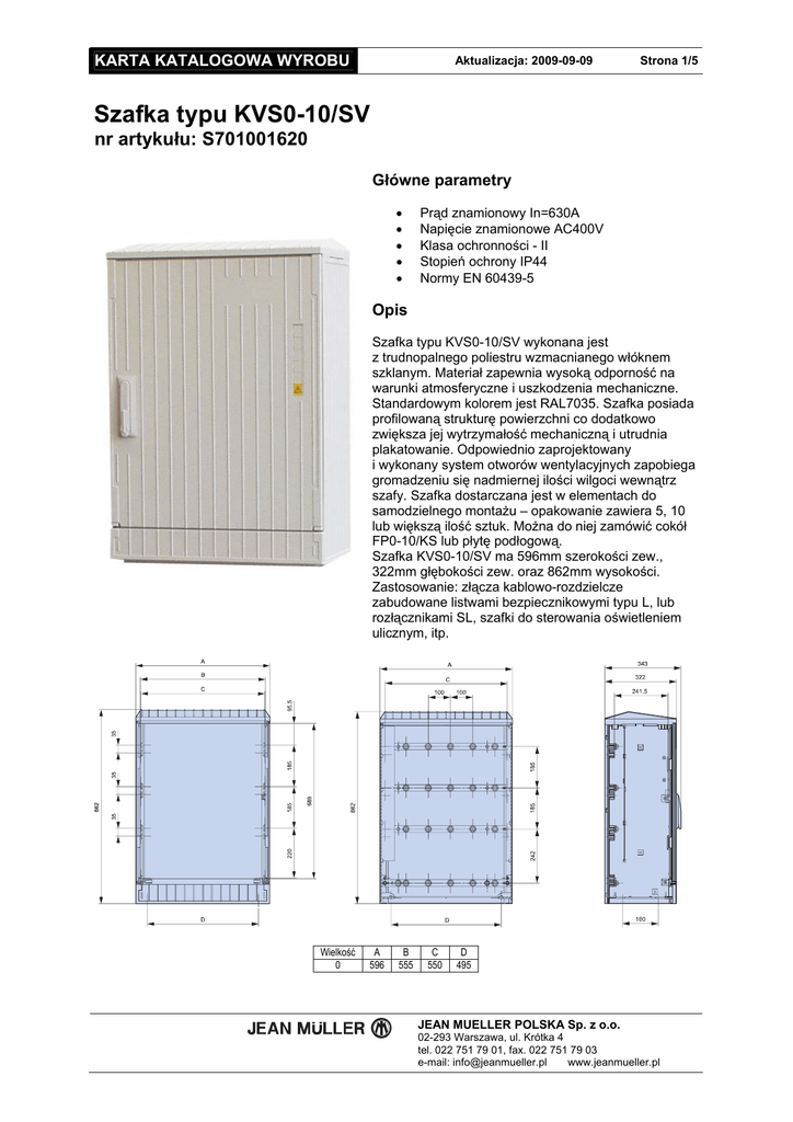 KARTA KATALOGOWA WYROBU Aktualizacja: 2009-09-09 Strona 1/5 Szafka typu KVS0-10/SV nr artykułu: S701001620 Główne parametry • • • • • Prąd znamionowy In=630A Napięcie znamionowe AC400V Klasa ochronności - II Stopień ochrony IP44 Normy EN 60439-5 Opis Szafka typu KVS0-10/SV wykonana jest z trudnopalnego poliestru wzmacnianego włóknem szklanym. Materiał zapewnia wysoką odporność na warunki atmosferyczne i uszkodzenia mechaniczne. Standardowym kolorem jest RAL7035. Szafka posiada profilowaną strukturę powierzchni co dodatkowo zwiększa jej wytrzymałość mechaniczną i utrudnia plakatowanie. Odpowiednio zaprojektowany i wykonany system otworów wentylacyjnych zapobiega gromadzeniu się nadmiernej ilości wilgoci wewnątrz szafy. Szafka dostarczana jest w elementach do samodzielnego montażu – opakowanie zawiera 5, 10 lub większą ilość sztuk. Można do niej zamówić cokół FP0-10/KS lub płytę podłogową. Szafka KVS0-10/SV ma 596mm szerokości zew., 322mm głębokości zew. oraz 862mm wysokości. Zastosowanie: złącza kablowo-rozdzielcze zabudowane listwami bezpiecznikowymi typu L, lub rozłącznikami SL, szafki do sterowania oświetleniem ulicznym, itp. Wielkość 0 A 596 B 555 C 550 D 495 JEAN MUELLER POLSKA Sp. z o.o. 02-293 Warszawa, ul. Krótka 4 tel. 022 751 79 01, fax. 022 751 79 03 e-mail: [email protected] www.jeanmueller.pl KARTA KATALOGOWA WYROBU Aktualizacja: 2009-09-09 Strona 2/5 Szafka typu KVS0-10/SV nr artykułu: S701001620 DANE TECHNICZNE Parametry i warunki pracy Napięcie znamionowe Prąd znamionowy Kolor Stopień ochrony Odporność na uderzenia mechaniczne Klasa ochronności Odporność na żar Temperatura otoczenia Ue Ie V A Tu °C °C AC400 630A (max.1000A) RAL7035 IP44 IK10 II 960 - 25 do + 80 Wymiary i objaśnienia symboli Szerokość Wysokość Głębokość SV mm mm mm 596 862 322 Zamek pojedynczy dla wkładki patentowej JEAN MUELLER POLSKA Sp. z o.o. 02-293 Warszawa, ul. Krótka 4 tel. 022 751 79 01, fax. 022 751 79 03 e-mail: [email protected] www.jeanmueller.pl KARTA KATALOGOWA WYROBU Aktualizacja: 2009-09-09 Strona 3/5 Szafka typu KVS0-10/SV nr artykułu: S701001620 Akcesoria Cokół Cokół do samodzielnego montażu Nadstawka cokołu Nadstawka do cokołu FP0 Płyta kratkowa do cokołu FP0 Płyta kratkowa mocowana do dolnej szyny w cokole w celu stabilizacji posadowienia szafki. W komplecie 2 sztuki. System szyn zbiorczych ze śrubami 400A (4 sztuki) do szafek KVS0-10 Płyta montażowa do szafek KVS0-10 Wymiary: szerokość – 545 mm wysokość – 743 mm grubość – 5 mm Osłona pustego pola 185 mm, szerokość 100 mm Typ Nr artykułu FP0-10/KS S9040000 Typ Nr artykułu FPH0-10/KS S9040012 Typ Nr artykułu GBPL0-1/-10 S8900544 Typ Nr artykułu SA-KVS0-10 S8001004 Typ Nr artykułu MPL0/10 S8000875 Typ Nr artykułu H-RF S8900954 JEAN MUELLER POLSKA Sp. z o.o. 02-293 Warszawa, ul. Krótka 4 tel. 022 751 79 01, fax. 022 751 79 03 e-mail: [email protected] www.jeanmueller.pl KARTA KATALOGOWA WYROBU Aktualizacja: 2009-09-09 Strona 4/5 Szafka typu KVS0-10/SV nr artykułu: S701001620 Akcesoria Zabezpieczenie przed wyciągnięciem kabla do szafek typu KVS...-10 Klamka do kłódki energetycznej Listwa z oświetleniem i gniazdkiem 220V Listwa z oświetleniem do szafki KVS10 Listwa z gniazdkiem 220V Listwa z gniazdkiem do szafki KVS10 Płyta podłogowa Płyta do szafek o wielkości 0 – montaż do ścianek Płyta podłogowa Płyta do szafek o wielkości 0 – montaż do cokołu Typ Nr artykułu ZE-10 S8900829 Typ Nr artykułu SVV S8900126 Typ Nr artykułu LTST-lewa S8900949 Typ Nr artykułu AST-lewa S8900741 Typ Nr artykułu BPL0 S8000056 Typ Nr artykułu BPL0/FP0 S8001114 JEAN MUELLER POLSKA Sp. z o.o. 02-293 Warszawa, ul. Krótka 4 tel. 022 751 79 01, fax. 022 751 79 03 e-mail: [email protected] www.jeanmueller.pl KARTA KATALOGOWA WYROBU Aktualizacja: 2009-09-09 Strona 5/5 Szafka typu KVS0-10/SV nr artykułu: S701001620 Akcesoria Tabliczka oznaczeniowa Typ Tabliczka bez nadruku (szara) Tabliczka oznaczeniowa S8900428 Typ Tabliczka z nadrukiem (żółta) Tabliczka oznaczeniowa Tabliczka z kieszenią dla szafek wszystkich wielkości Tabliczka oznaczeniowa Kieszeń na tabliczki dla szafek wszystkich wielkości Nr artykułu Nr artykułu S8900504 Typ Nr artykułu BZT S8900802 Typ Nr artykułu BZ S8900711 JEAN MUELLER POLSKA Sp. z o.o. 02-293 Warszawa, ul. Krótka 4 tel. 022 751 79 01, fax. 022 751 79 03 e-mail: [email protected] www.jeanmueller.pl