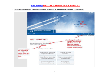www.mtp24.pl INSTRUKCJA OBSŁUGI KROK PO KROKU 1. Utwórz konto firmowe lub zaloguj się do serwisu www.mtp24.pl (jeśli posiadasz już konto w tym serwisie): 1 TWORZENIE KONTA: 2 2. Po zalogowaniu wybierz: 3 3. Następnie wybierz targi BUDMA / KOMINKI / CBS / GLASS 2014– przejdziesz do ankiety rejestracyjnej: 4 4. Wypełnij ankietę rejestracyjną, przepisz kod z obrazka i kliknij dalej: 5 5. W tym miejscu możesz dodać inne osoby z firmy i wybrać bilet: 6 6. Zweryfikuj wprowadzone dane: 7 7. Po przejściu do płatności wybierz operatora i dokonaj przelewu online ( w przypadku wyboru przelewu tradycyjnego – patrz punkt 8 na kolejnej stronie instrukcji, wybierając przelew online przejdź do punktu 9): 8 8. Wybierając tradycyjny przelew bankowy prosimy o wydrukowanie wypełnionego automatycznie formularza i wniesienie opłaty w oddziale Poczty lub banku: 9 9. Po dokonaniu przelewu zakończ proces rejestracji i czekaj na maila z informacją o bilecie: 10 10. Jak wydrukować bilet? Po otrzymaniu maila z informacją o bilecie kliknij na link z maila, zaloguj się do serwisu www.mtp24.pl i na stronie głównej kliknij w okno historii transakcji (tu istnieje również możliwość wygenerowania elektronicznej faktury za bilety): 11. W tym miejscu będzie widoczny bilet do wydruku: 11