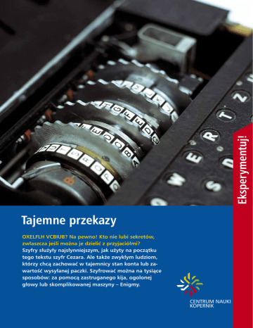 Eksperymentuj! Tajemne przekazy OXELFLH VCBIUB? Na pewno! Kto nie lubi sekretów, zwłaszcza jeśli można je dzielić z przyjaciółmi? Szyfry służyły najsłynniejszym, jak użyty na początku tego tekstu szyfr Cezara. Ale także zwykłym ludziom, którzy chcą zachować w tajemnicy stan konta lub zawartość wysyłanej paczki. Szyfrować można na tysiące sposobów: za pomocą zastruganego kija, ogolonej głowy lub skomplikowanej maszyny – Enigmy. CENTRUM NAUKI KOPERNIK Najczęściej używany obecnie algorytm kryptografii asymetrycznej – RSA – został opracowany w USA w 1978 roku przez zespół trzech informatyków: Ronalda Rivesta, Adiego Shamira i Leonarda Adlemana Eksperymentuj! N auka o sposobach zabezpieczania informacji to kryptologia. Kryptografowie zajmują się układaniem i stosowaniem szyfrów, zaś kryptoanalitycy ich łamaniem. Najstarsze, stosowane przez całe stulecia sposoby szyfrowania można określić jako szyfry symetryczne. W ich przypadku do ukrycia treści przekazu służy klucz, który jest również wykorzystywany do odczytywania wiadomości. Takie rozwiązanie stwarza jednak wiele problemów. Najważniejszym jest znalezienie sposobu na bezpieczne przekazanie klucza, gdyż jeśli zostanie on przechwycony przez osobę niepowołaną, umożliwi jej nie tylko odczytanie szyfrogramu, lecz także pozwoli podszywać się pod właściciela klucza. Ten problem udało się rozwiązać dzięki wymyśleniu szyfrów asymetrycznych. Opracowano je w połowie lat 70. ubiegłego wieku. Ich cechą charakterystyczną jest obecność dwóch kluczy – publicznego i prywatnego. Pierwszy służy do zaszyfrowania informacji, drugi do jej odczytania. Klucz publiczny odbiorca udostępnia wszystkim. Prywatny zachowuje dla siebie. W ten sposób każdy może wysłać do niego zakodowaną wiadomość, ale odczytać może ją tylko posiadacz klucza prywatnego. Na szyfrach asymetrycznych opiera się także stosowany coraz powszechniej podpis cyfrowy. Jego zastosowanie umożliwia uwierzytelnienie nadawcy. Dzięki temu odbiorca ma pewność, że nikt się nie podszywa pod nadawcę, a ten ostatni nie może zaprzeczyć, iż to on jest autorem przesłanej wiadomości. Dzięki swoim zaletom kryptografia asymetryczna jest dziś stosowana wszędzie tam, gdzie do przekazywania informacji wykorzystuje się ogólnodostępne kanały (np. internet) oraz w przypadku gdy korespondenci nie mogą uzgodnić szyfru symetrycznego w bezpieczny sposób. Najpopularniejszym obecnie algorytmem kryptografii asymetrycznej jest RSA stworzony w USA w 1978 roku przez zespół trzech informatyków: Ronalda Rivesta, Adiego Shamira, Leonarda Adlemana. Bezpieczeństwo tego algorytmu opiera się na trudności rozkładu (faktoryzacji) wielkich liczb złożonych na czynniki pierwsze. Co to oznacza? Każdy bez trudu pomnoży na kartce papieru (lub za pomocą kalkulatora) dwie liczby stucyfrowe. Ale już rozłożenie takiej dwustucyfrowej liczby złożonej, która jest iloczynem dwóch dużych liczb pierwszych, przekracza obecnie możliwości naszej cywilizacji. Dlatego wszędzie tam, gdzie ważna jest poufność, używa się dostatecznie długich kluczy (liczb złożonych). Jest to ważne, ponieważ złamanie szyfru RSA okazało się już możliwe dla kluczy o długości do ok. 512 bitów. Wciąż jednak algorytm RSA jest uznawany za bezpieczny i powszechnie stosowany, choć obecnie rozmiar kluczy publicznych najczęściej waha się w granicach 1024–4096 bitów. O zaufaniu do tego algorytmu niech świadczy fakt, że opiera się na nim bezpieczeństwo światowego systemu bankowego oraz sytemu rozpowszechniania broni jądrowej. Potencjalnym zagrożeniem dla bezpieczeństwa RSA jest skonstruowanie komputera kwantowego. Dzięki specyficznym właściwościom komputerów kwantowych problem rozkładu wielkich liczb można byłoby bowiem rozwiązać znacznie szybciej, niż potrafią to zrobić współczesne, klasyczne maszyny. Kryptografia zajmuje nie tylko szyfrowaniem, ale również innymi zagadnieniami związanymi z bezpieczeństwem przekazywania informacji. Coraz większego znaczenia praktycznego nabiera operacja kryptograficzna znana jako dzielenie sekretu. Polega ona na tym, że pewna informacja (sekret) jest dzielona i rozdawana w taki sposób, aby mogła ją odczytać tylko określona grupa osób, z których każda dysponuje częścią sekretu. Tę funkcję w najprostszym przypadku może pełnić przedarty na pół banknot. Na naszej wystawie można obejrzeć eksponat, który jest zaliczany do kryptografii wizualnej – dwie folie, które po dokładnym złożeniu ujawniają ukryty obraz – wizerunek Mikołaja Kopernika lub logo Centrum Nauki Kopernik. Technika ta jest już wykorzystywana w praktyce, np. do oznaczania przesyłek. Spedytor nie chce bowiem, by osoby postronne wiedziały, jaki ładunek jest przewożony, zwłaszcza jeśli jest on cenny. Tylko osoba posiadająca drugą część sekretu może zorientować się, jaka jest zawartość przesyłki. Coraz większe znaczenie ma także zastosowanie kryptografii (cyfrowe znaki wodne) do ochrony praw autorskich do utworów muzycznych, filmów i innych form artystycznych w postaci cyfrowej. Zobaczenie ukrytego obrazu jest możliwe dopiero po dokładnym złożeniu dwóch folii, na których wcześniej widać było tylko zbiór przypadkowych punktów Fot. University of Southern California, Centrum Nauki Kopernik, Universität Potsdam; rys. Małgorzata Świentczak 2x Trochę teorii O historii S zyfrów używali już starożytni Spartanie. Owijali oni wąski i długi pasek pergaminu spiralnie wokół drewnianego walca, po czym pisali list na pergaminie wzdłuż jego osi. Po zdjęciu pergaminu z walca osoby niewtajemniczone mogły przeczytać tylko bezładnie rozrzucone litery. Treść wiadomości mogła poznać jedynie osoba, która wiedziała, że przedtem musi nawinąć pergaminowy pasek na walec o odpowiedniej średnicy. Opis tego sposobu szyfrowania można znaleźć 