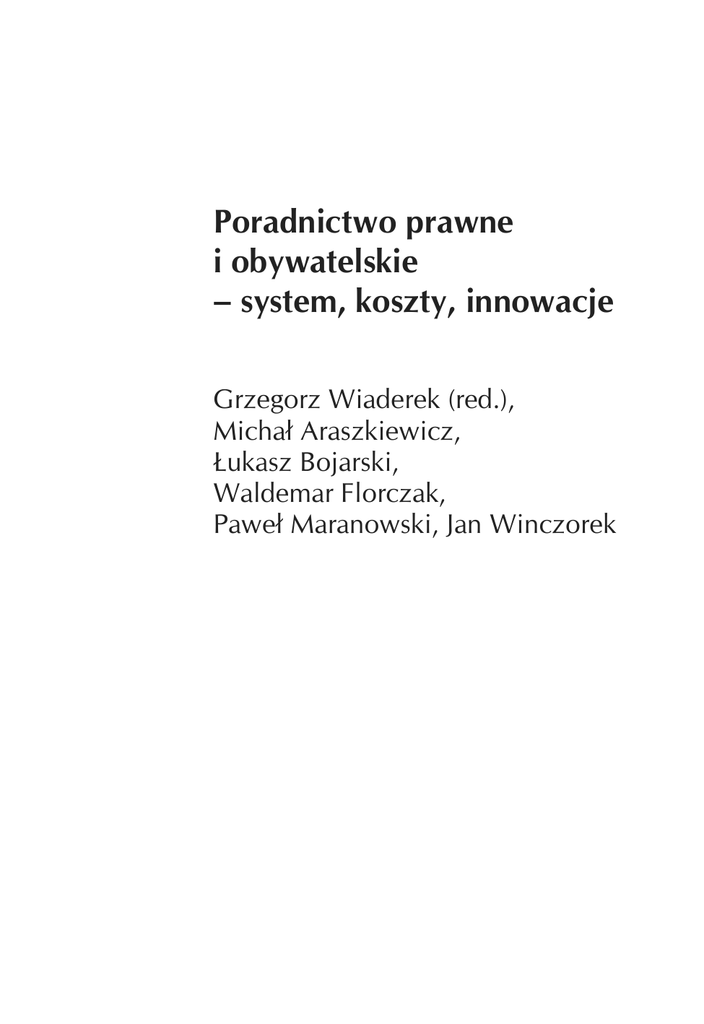 oradnictwo prawne P i obywatelskie – system, koszty, innowacje Grzegorz Wiaderek (red.), Michał Araszkiewicz, Łukasz Bojarski, Waldemar Florczak, Paweł Maranowski, Jan Winczorek Niniejsza publikacja powstała w ramach projektu Opracowanie kompleksowych i trwałych mechanizmów wsparcia dla poradnictwa prawnego i obywatelskiego w Polsce. Projekt współfinansowany przez Unię Europejską w ramach Europejskiego Funduszu Społecznego Publikacja jest rozpowszechniana bezpłatnie. Wersja elektroniczna znajduje się na stronie inpris.pl. Opracowanie redakcyjne i korekta: Monika Szulecka, Paweł Maranowski Projekt okładki: Filip Wejman Copyright by INPRIS – Instytut Prawa i Społeczeństwa 00-031 Warszawa ul. Szpitalna 5/5 inpris.pl [email protected] ISBN 978-83-930427-4-6 Skład i druk: TyRSA sp. z o.o. www.tyrsa.pl Szanowni Państwo, Przekazujemy w Państwa ręce opracowanie będące efektem prac ekspertów i analityków INPRIS prowadzonych w ramach projektu Opracowanie kompleksowych i trwałych mechanizmów wsparcia dla poradnictwa prawnego i obywatelskiego w Polsce realizowanego od grudnia 2011 r. Liderem projektu jest Departament Pożytku Publicznego Ministerstwa Pracy i Polityki Społecznej, a partnerami: Fundacja Uniwersyteckich Poradni Prawnych, INPRIS – Instytut Prawa i Społeczeństwa, Instytut Spraw Publicznych oraz Związek Biur Porad Obywatelskich. INPRIS odpowiadał za przygotowanie rozbudowanych analiz z udziałem ekspertów krajowych i zagranicznych oraz za koordynowanie prac eksperckich nad przygotowaniem modelu poradnictwa oraz założeń polityki państwa. Niniejsza publikacja obejmuje kluczowe wyniki prac ekspertów INPRIS dotyczących założeń organizacyjnych oraz społeczno-ekonomicznych systemu poradnictwa prawnego i obywatelskiego. Działania INPRIS w ramach wspomnianego wyżej projektu są kolejną naszą aktywnością na rzecz wprowadzenia w Polsce rozwiązań systemowych dotyczących pomocy prawnej. Eksperci INPRIS uczestniczą od wielu lat w pracach nad kolejnymi projektami aktów prawnych, publikowaliśmy ekspertyzy i opracowania tego dotyczące, prowadzimy internetową Bibliotekę reformy nieodpłatnej pomocy prawnej. Członkowie Zarządu INPRIS - Grzegorz Wiaderek i Łukasz Bojarski byli członkami zespołu powołanego w Kancelarii Prezydenta RP, który przeprowadził serię debat na temat dostępu do pomocy prawnej oraz przygotował Zieloną księgę – Dostęp do nieodpłatnej pozasądowej pomocy prawnej dla potrzebujących. Założony w 2009 r. Instytut prowadzi interdyscyplinarne badania nad prawem, nowoczesnymi regulacjami oraz innowacyjnymi metodami edukacji prawnej. Misją INPRIS jest wykorzystanie nauki i informacji jako praktycznych narzędzi postępu społecznego i reform. Naszą działalnością chcemy przyczynić się do poprawy jakości badań i debaty publicznej na temat polityki prawa oraz nad wzmocnieniem świadomości prawnej polskiego społeczeństwa. 3 Główne założenia INPRIS to: Nauka jako praktyczne narzędzie postępu społecznego. Interesuje nas wykorzystanie nauki prawa i innych dziedzin nauki dla wywoływania pozytywnych zmian społecznych. Interdyscyplinarność. Uważamy za wskazane łączenie analizy prawniczej z dorobkiem innych nauk, w tym socjologii, ekonomii, psychologii społecznej oraz nauk o informacji. Nowe technologie informatyczne mają ważną rolę do odegrania w prawie. Rozwiązania służące ułatwianiu dostępu do informacji, wymiany idei i poglądów, współpracy naukowej oraz debacie publicznej mogą mieć istotny wpływ na poprawę jakości stanowienia i stosowania prawa, a także edukacji prawniczej i badań naukowych. Badania empiryczne. Uważamy, że dane empiryczne stanowią podstawę dobrych rozwiązań prawnych i reform. Komparatystyka i współpraca międzynarodowa. Chcemy wykorzystywać know-how na temat prawa z innych krajów i dzielić się polskim know-how. Edukacja jest elementem reformy prawa. Kształcenie w zakresie prawa interesuje nas nie tylko jako proces przekazywania informacji, ale jako propagowanie postaw użytkowników systemu prawnego. Mamy nadzieję, że treści zawarte w niniejszej publikacji spotkają się z Państwa zainteresowaniem. Zarząd INPRIS Spis treści 1. WSTĘP 7 2. Dotychczasowe projekty ustaw dotyczące systemowych rozwiązań poradnictwa prawnego 12 3. Dostęp do poradnictwa - stan obecny i możliwości zmiany 21 4. Koncepcja organizacji i funkcjonowania systemu poradnictwa 53 4.1. Założenia organizacyjne systemu poradnictwa 53 4.2. Rada Pomocy Prawnej 58 4.3. Publiczne i niepubliczne instytucje poradnicze w Polsce 64 4.4. Standaryzacja jako element zarządzania jakością usług poradniczych 71 4.5. Monitoring i ewaluacja systemu poradnictwa 78 5. Ekonomiczne uwarunkowania poradnictwa prawnego i obywatelskiego 82 6. Technologie informatyczne w poradnictwie prawnym i obywatelskim 102 7. Uwagi końcowe 125 5 1. WSTĘP Poradnictwo prawne i obywatelskie rozwija się w Polsce w sposób rozproszony od kilkunastu lat w oparciu o aktywność organizacji pozarządowych i niektórych instytucji publicznych. Powstają i rozwijają się różne inicjatywy poradnicze, jednakże nie ma pomiędzy nimi należytej koordynacji i współpracy, a organizacje pozarządowe napotykają bariery rozwoju związane z brakiem stabilnego finansowania oraz brakiem odpowiednich regulacji prawnych. Brakuje rozwiązań systemowych, które zapewniałyby obywatelom dostęp do bezpłatnego poradnictwa prawnego i obywatelskiego. Pomimo wielu lat dyskusji nie udało się do tej pory przyjąć aktu prawnego, który w sposób systemowy regulowałby dostęp obywateli do poradnictwa. Podstawowym celem poradnictwa jest umożliwienie obywatelom rozwiązywania ich problemów życiowych, wzmocnienie ich świadomości prawnej oraz przeciwdziałanie wykluczeniu społecznemu. Doświadczenia niektórych krajów (np. Wielka Brytania, holandia) pokazują, że funkcjonowanie rozwiniętych systemów poradnictwa