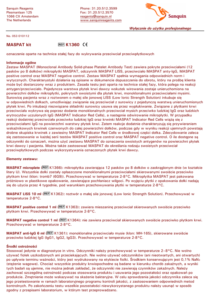 Sanquin Reagents Plesmanlaan 125 1066 CX Amsterdam The Netherlands Phone: 31.20.512.3599 Fax: 31.20.512.3570 [email protected] www.sanquinreagents.com Wyłącznie do użytku profesjonalnego No. 053 010112 MASPAT kit K1360 oznaczenie oparte na technice stałej fazy do wykrywania przeciwciał przeciwpłytkowych Informacje ogólne Zestaw MASPAT (Monoclonal Antibody Solid-phase Platelet Antibody Test) zawiera pokryte przeciwciałami (12 pasków po 8 dołków) mikropłytki MASPAT, odczynnik MASPAT LISS, przeciwciało MASPAT anty-IgG, MASPAT positive control oraz MASPAT negative control. Zestaw MASPAT spełnia wymagania odpowiednich norm i wytycznych. Charakterystyki działania są opisane w dokumencie dopuszczenia do obrotu, który na prośbę klienta może być dostarczony wraz z produktem. Zasada testu jest oparta na technice stałej fazy, która polega na reakcji antygen/przeciwciało. Pojedyncza warstwa płytek krwi dawcy wskutek wirowania zostaje unieruchomiona na powierzchni dołków mikropłytki, pokrytych swoistymi dla płytek krwi, monoklonalnymi przeciwciałami mysimi. Surowicę pacjenta wraz z roztworem o małej sile jonowej LISS (Low Ionic Strength Solution) inkubuje się w odpowiednich dołkach, umożliwiając związanie się przeciwciał z surowicy z pojedynczą warstwą unieruchomionych płytek krwi. Po inkubacji niezwiązane składniki surowicy usuwa się przez wypłukiwanie. Związane z płytkami krwi przeciwciała wykrywa się poprzez dodanie monoklonalnych przeciwciał mysich przeciwko ludzkiej IgG oraz ludzkich erytrocytów uczulonych IgG (MASPAT Indicator Red Cells), a następnie odwirowanie mikropłytki. W przypadku reakcji dodatniej przeciwciała przeciwko ludzkiej IgG oraz krwinki MASPAT Indicator Red Cells wiążą się z przeciwciałami IgG na powierzchni warstwy płytek krwi. Zatem reakcje dodatnie charakteryzują się przywieraniem wskaźnikowych krwinek czerwonych do całej powierzchni dołków, podczas gdy w wyniku reakcji ujemnych powstają drobne skupiska krwinek z zawiesiny MASPAT Indicator Red Cells w środkowej części dołka. Zdecydowanie zaleca się zastosowanie w każdej serii testów MASPAT positive control oraz MASPAT negative control. O ile dostępne są odczynniki do oznaczeń, można użyć zestawu MASPAT do oznaczenia swoistych antygenów na powierzchni płytek krwi dawcy i pacjenta. Można także zastosować MASPAT do określania rodzaju swoistych przeciwciał przeciwpłytkowych podczas wykorzystywania oznaczonych płytek krwi dawcy. Elementy zestawu: K1366): mikropłytka zawierająca 12 pasków po 8 dołków o zaokrąglonym dnie (w kształcie MASPAT microplate ( litery U). Wszystkie dołki zostały opłaszczone monoklonalnymi przeciwciałami skierowanymi swoiście przeciwko płytkom krwi (klon: tromb7 (6G9)). Przechowywać w temperaturze 2-8°C. Mikropłytka MASPAT jest pakowana próżniowo w plastikowe opakowanie, zawierające pochłaniacz wilgoci. Po wyjęciu płytki z opakowania dołki nadają się do użycia przez 4 tygodnie, pod warunkiem przechowywania płytki w temperaturze 2-8°C. MASPAT LISS 10 ml ( temperaturze 2-8°C. K1362): roztwór o małej sile jonowej (Low Ionic Strength Solution). Przechowywać w K1363): zawiera mieszaninę przeciwciał skierowanych swoiście przeciwko MASPAT positive control 1 ml ( płytkom krwi. Przechowywać w temperaturze 2-8°C. K1364): nie zawiera przeciwciał skierowanych swoiście przeciwko płytkom krwi. MASPAT negative control 1 ml ( Przechowywać w temperaturze 2-8°C. K1361): monoklonalne przeciwciało mysie (klon: MH-165), skierowane swoiście MASPAT anti-IgG 6 ml ( przeciwko ludzkiej IgG (IgG1, IgG2, IgG3). Przechowywać w temperaturze 2-8°C. Środki ostrożności Stosować jedynie w diagnostyce in vitro. Odczynniki należy przechowywać w temperaturze 2–8°C. Nie wolno używać fiolek uszkodzonych ani przeciekających. Nie wolno używać odczynników (ani nieotwartych, ani otwartych) po upływie terminu ważności, który jest wydrukowany na etykiecie fiolki. Środkiem konserwującym jest 0,1% NaN3 (stężenie wagowe). Chociaż wszystkie produkty krwiopochodne są badane w kierunku chorób zakaźnych, a wyniki tych badań są ujemne, nie można jednak zakładać, że odczynniki nie zawierają czynników zakaźnych. Należy zachować szczególną ostrożność podczas stosowania produktu i usuwania jego pozostałości oraz opakowań po produkcie. Zmętnienie może wskazywać na skażenie bakteryjne. W celu sprawdzenia jakości odczynnika zaleca się jego przetestowanie w ramach laboratoryjnego programu kontroli jakości, z zastosowaniem odpowiednich metod kontrolnych. Po zakończeniu testu wszelkie pozostałości niewykorzystanego produktu należy usunąć w sposób zgodny z przepisami laboratorium, w którym test przeprowadzano. Pobieranie i przygotowywanie materiału Próbki surowicy uzyskuje się z wykrzepionej krwi po jej odwirowaniu z przyspieszeniem 1500 RCF przez 10 minut. Jeżeli badanie próbek surowicy będzie wykonane z opóźnieniem, próbki należy przechowywać w temperaturze niższej niż <–18°C. Przygotowanie próbek zostało opisane w odpowiednich procedurach testu. W teście można wykorzystać koncentrat płytkowy lub osocze bogatopłytkowe. W celu przygotowania osocza bogatopłytkowego odwirowuje się krew pełną pobraną na EDTA z przyspieszeniem 400 RCF przez 10 minut. Frakcję osocza bogatopłytkowego można stosować bezpośrednio, bez rozcieńczania. Procedura testu Materiały wymagane, lecz niedostarczane: K1139), zawierająca uczulone erytrocyty w podłożu - 0,3% zawiesina MASPAT Indicator Red Cells ( konserwującym. - Pipeta wielokanałowa z możliwością podawania objętości: 50, 100 i 150 l oraz jednorazowe końcówki. - Roztwór soli buforowany buforem fosforanowym (PBS, Phosphate Buffered Saline) oraz Tween 20. - Zbiorniki do pipety wielokanałowej. - Jednorazowe pipety PLASTIKOWE do przenoszenia próbek. - Wirówka odpowiednia do odwirowywania mikropłytek.