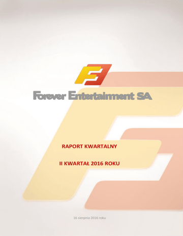 RAPORT KWARTALNY II KWARTAŁ 2016 ROKU 16 sierpnia 2016 roku RAPORT KWARTALNY – II KWARTAŁ 2016 SPIS TREŚCI 1. PODSTAWOWE INFORMACJE O SPÓŁCE ...................................................................................................................... 3 2. KWARTALNE SKRÓCONE SPRAWOZDANIE FINANSOWE ZA II KWARTAŁ 2016 ROKU ................................................. 5 2.1. Bilans ............................................................................................................................................................... 5 2.2. Rachunek zysków i strat .................................................................................................................................. 7 2.3. Zestawienie zmian w kapitale własnym .......................................................................................................... 8 2.4. Rachunek przepływów pieniężnych................................................................................................................. 9 3. INFORMACJE O ZASADACH PRZYJĘTYCH PRZY SPORZĄDZANIU RAPORTU, W TYM INFORMACJE O ZMIANACH STOSOWANYCH ZASAD (POLITYKI) RACHUNKOWOŚCI.............................................................................................. 11 4. ZWIĘZŁA CHARAKTERYSTYKA ISTOTNYCH DOKONAŃ LUB NIEPOWODZEŃ EMITENTA W OKRESIE OBJĘTYM RAPORTEM WRAZ Z OPISEM NAJWAŻNIEJSZYCH CZYNNIKÓW I ZDARZEŃ, W SZCZEGÓLNOŚCI O NIETYPOWYM CHARAKTERZE, MAJĄCYCH WPŁYW NA OSIĄGNIĘTE WYNIKI ................................................................................... 15 5. STANOWISKO ODNOŚNIE MOŻLIWOŚCI ZREALIZOWANIA PUBLIKOWANYCH PROGNOZ WYNIKÓW NA DANY ROK W ŚWIETLE WYNIKÓW ZAPREZENTOWANYCH W DANYM RAPORCIE KWARTALNYM .............................................. 17 6. OPIS STANU REALIZACJI DZIAŁAŃ W ZAKRESIE INWESTYCJI EMITENTA I ICH HARMONOGRAMU............................ 17 7. INFORMACJA ZARZĄDU NA TEMAT AKTYWNOŚCI, JAKĄ W OKRESIE OBJĘTYM RAPORTEM SPÓŁKA PODJĘŁA W OBSZARZE ROZWOJU PROWADZONEJ DZIAŁALNOŚCI W SZCZEGÓLNOŚCI POPRZEZ DZIAŁANIA NASTAWIONE NA WPROWADZENIE ROZWIĄZAŃ INNOWACYJNYCH W PRZEDSIĘBIORSTWIE .............................................................. 17 8. OPIS ORGANIZACJI GRUPY KAPITAŁOWEJ, ZE WSKAZANIEM JEDNOSTEK PODLEGAJĄCYCH KONSOLIDACJI ............ 17 9. PRZYCZYNY ODSTĄPIENIA OD KONSOLIDACJI ............................................................................................................ 18 10. STRUKTURA AKCJONARIATU EMITENTA ZE WSKAZANIEM AKCJONARIUSZY POSIADAJĄCYCH, NA DZIEŃ SPORZĄDZENIA RAPORTU, CO NAJMNIEJ 5% GŁOSÓW NA WALNYM ZGROMADZENIU .......................................... 18 11. INFORMACJE DOTYCZĄCE LICZBY ZATRUDNIONYCH PRZEZ EMITENTA, W PRZELICZENIU NA PEŁNE ETATY............ 18 2|S t r o n a RAPORT KWARTALNY – II KWARTAŁ 2016 1. PODSTAWOWE INFORMACJE O SPÓŁCE Forever Entertainment Spółka Akcyjna („Forever Entertainment S.A.”, „Spółka”) została założona w dniu 04 sierpnia 2010 roku, zgodnie z polskim prawem, aktem notarialnym sporządzonym przez notariusza Jacka Warońskiego w Gdyni (Rep. A Nr 8298/2010). Spółka działa na obszarze Rzeczypospolitej i poza jej granicami. Czas trwania Spółki jest nieoznaczony. Założycielami Spółki są osoby fizyczne, które objęły akcje serii A i B. Numer właściwego rejestru Spółka została wpisana do Rejestru Przedsiębiorców Krajowego Rejestru Sądowego pod Nr KRS 0000365951 w dniu 21 września 2010 roku. Siedziba i Centrala Siedzibą Spółki jest Gdynia. Centrala i Biuro Zarządu Spółki mieści się pod adresem: FOREVER ENTERTAINMENT S.A. Al. Zwycięstwa 96/98 81-451 Gdynia tel.: +48 58 728 2343 fax: +48 58 712 6259 e-mail: [email protected] www.forever-entertainment.com Relacje inwestorskie Joanna Pruś – Asystentka Zarządu Kontakt dla mediów Zbigniew Dębicki – Prezes Zarządu Oddziały, filie, zakłady i przedstawicielstwa W okresie sprawozdawczym Spółka nie posiadała oddziałów, filii, zakładów i przedstawicielstw. Przedmiot działalności Przedmiotem działalności Forever Entertainment S.A., według klasyfikacji przyjętej przez Giełdę Papierów Wartościowych Warszawie S.A., jest „Informatyka”. Podstawowym przedmiotem działalności Spółki, według działów Polskiej Klasyfikacji Działalności (PKD-58.21.Z), jest „działalność wydawnicza w zakresie gier komputerowych”. Klasa ta obejmuje działalność związaną z analizą, projektowaniem i programowaniem systemów gotowych do użycia. Dodatkowo, Spółka prowadzi działalność wspierającą edukację, dystrybucję filmów oraz sprzedaż towarów obejmujących gry, zabawki i gadżety, w kraju i zagranicą. Zarząd Skład Zarządu Spółki w okresie sprawozdawczym i obecnie przedstawia się następująco: Funkcja Prezes Zarządu Członek Zarządu Zbigniew Dębicki Okres pełnienia funkcji od 15.01.2016 28 kwietnia 2016 roku Rada Nadzorcza podjęła Uchwałę o powołaniu Pana Zbigniewa Dębickiego na kolejną 2-letnią kadencję. 3|S t r o n a RAPORT KWARTALNY – II KWARTAŁ 2016 Rada Nadzorcza Skład Rady Nadzorczej Spółki przedstawia się następująco: Członek Rady Nadzorczej Funkcja Zbigniew Szachniewicz Przewodniczący Rady Nadzorczej Kamila Dębicka Członek Rady Nadzorczej Mirosław Grala Członek Rady Nadzorczej Andrzej Kodroń Członek Rady Nadzorczej Łukasz Kokornacki Członek Rady Nadzorczej Zgodnie ze Statutem Spółki Rada Nadzorcza składa się z pięciu członków (par. 18), przy czym przynajmniej dwóch członków powinno być niezależnych (par.19.6). Członkowie pierwszej Rady Nadzorczej powoływani są na okres jednego roku, a członkowie każdej następnej Rady Nadzorczej powoływani są na okres wspólnej dwuletniej kadencji. Kapitał zakładowy na 30 czerwca 2016 roku Kapitał zakładowy: 8.784.398,80 PLN Łączna liczba akcji: 21.960.997 o wartości nominalnej 0,40 PLN każda Ogólna liczba głosów na WZA: 21.960