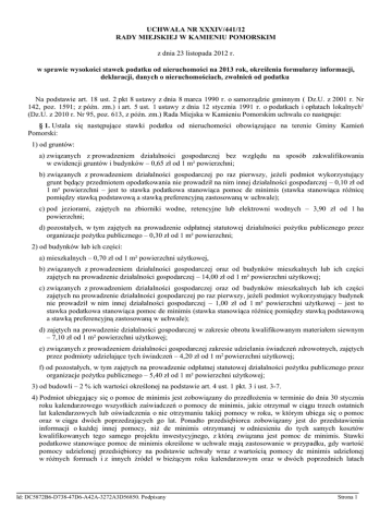 UCHWAŁA NR XXXIV/441/12 RADY MIEJSKIEJ W KAMIENIU POMORSKIM z dnia 23 listopada 2012 r. w sprawie wysokości stawek podatku od nieruchomości na 2013 rok, określenia formularzy informacji, deklaracji, danych o nieruchomościach, zwolnień od podatku Na podstawie art. 18 ust. 2 pkt 8 ustawy z dnia 8 marca 1990 r. o samorządzie gminnym ( Dz.U. z 2001 r. Nr 142, poz. 1591; z późn. zm.) i art. 5 ust. 1 ustawy z dnia 12 stycznia 1991 r. o podatkach i opłatach lokalnych1 (Dz.U. z 2010 r. Nr 95, poz. 613, z późn. zm.) Rada Miejska w Kamieniu Pomorskim uchwala co następuje: § 1. Ustala się następujące stawki podatku od nieruchomości obowiązujące na terenie Gminy Kamień Pomorski: 1) od gruntów: a) związanych z prowadzeniem działalności gospodarczej bez względu na sposób zakwalifikowania w ewidencji gruntów i budynków – 0,65 zł od 1 m² powierzchni; b) związanych z prowadzeniem działalności gospodarczej po raz pierwszy, jeżeli podmiot wykorzystujący grunt będący przedmiotem opodatkowania nie prowadził na nim innej działalności gospodarczej – 0,10 zł od 1 m² powierzchni – jest to stawka podatkowa stanowiąca pomoc de minimis (stawka stanowiąca różnicę pomiędzy stawką podstawową a stawką preferencyjną zastosowaną w uchwale); c) pod jeziorami, zajętych na zbiorniki wodne, retencyjne lub elektrowni wodnych – 3,90 zł od 1 ha powierzchni; d) pozostałych, w tym zajętych na prowadzenie odpłatnej statutowej działalności pożytku publicznego przez organizacje pożytku publicznego – 0,30 zł od 1 m² powierzchni; 2) od budynków lub ich części: a) mieszkalnych – 0,70 zł od 1 m² powierzchni użytkowej, b) związanych z prowadzeniem działalności gospodarczej oraz od budynków mieszkalnych lub ich części zajętych na prowadzenie działalności gospodarczej – 14,00 zł od 1 m² powierzchni użytkowej; c) związanych z prowadzeniem działalności gospodarczej oraz od budynków mieszkalnych lub ich części zajętych na prowadzenie działalności gospodarczej po raz pierwszy, jeżeli podmiot wykorzystujący budynek nie prowadził w nim innej działalności gospodarczej – 1,00 zł od 1 m² powierzchni użytkowej – jest to stawka podatkowa stanowiąca pomoc de minimis (stawka stanowiąca różnicę pomiędzy stawką podstawową a stawką preferencyjną zastosowaną w uchwale); d) zajętych na prowadzenie działalności gospodarczej w zakresie obrotu kwalifikowanym materiałem siewnym – 7,10 zł od 1 m² powierzchni użytkowej; e) związanych z prowadzeniem działalności gospodarczej zakresie udzielania świadczeń zdrowotnych, zajętych przez podmioty udzielające tych świadczeń – 4,20 zł od 1 m2 powierzchni użytkowej; f) od pozostałych, w tym zajętych na prowadzenie odpłatnej statutowej działalności pożytku publicznego przez organizacje pożytku publicznego – 5,40 zł od 1 m² powierzchni użytkowej; 3) od budowli – 2 % ich wartości określonej na podstawie art. 4 ust. 1 pkt. 3 i ust. 3-7. 4) Podmiot ubiegający się o pomoc de minimis jest zobowiązany do przedłożenia w terminie do dnia 30 stycznia roku kalendarzowego wszystkich zaświadczeń o pomocy de minimis, jakie otrzymał w ciągu trzech ostatnich lat kalendarzowych lub oświadczenia o nie otrzymaniu takiej pomocy w roku, w którym ubiega się o pomoc oraz w ciągu dwóch poprzedzających go lat. Ponadto przedsiębiorca zobowiązany jest do przedstawienia informacji o każdej innej pomocy, niż de minimis otrzymanej w odniesieniu do tych samych kosztów kwalifikowanych tego samego projektu inwestycyjnego, z którą związana jest pomoc de minimis. Stawki podatkowe stanowiące pomoc de minimis określone w uchwale mają zastosowanie w przypadku, gdy wartość pomocy udzielonej przedsiębiorcy na podstawie uchwały wraz z wartością pomocy de minimis udzielonej w różnych formach i z innych źródeł w bieżącym roku kalendarzowym oraz w dwóch poprzednich latach Id: DC5872B6-D738-47D6-A42A-3272A3D56850. Podpisany Strona 1 kalendarzowych nie przekroczy równowartości 200.000 euro, a w sektorze transportu 100.000 euro. Podatnik jest zobowiązany powiadomić organ podatkowy o przekroczeniu limitu w terminie 14 dni od daty okoliczności powodujących utratę prawa do stosowania stawek stanowiących pomoc de minimis. Jeżeli podatnik błędnie poinformuje organ podatkowy co do warunków spełnienia uprawnienia do stosowania preferencyjnych stawek – traci prawo do pomocy za cały okres. Podatnik ubiegający się o pomoc de minimis zobowiązany jest do wypełnienia formularza informacji przedstawianych przy ubieganiu się o pomoc de minimis zgodnie z Rozporządzeniem Rady Ministrów z 29 marca 2010 roku Dz. U. Nr 53. poz. 311.- między innymi sytuacji ekonomicznej przedsiębiorcy w tym sprawozdań finansowych za okres ostatnich 3 lat obrotowych sporządzonych zgodnie z przepisami o rachunkowości (§ 2 ust.2 rozporządzenia); § 2. 1. Ustala się wzór formularza IN-1- informacji o nieruchomościach i obiektach budowlanych, którą osoby fizyczne będące płatnikami podatku od nieruchomości są obowiązane złożyć Burmistrzowi stanowiący załącznik Nr 1 do niniejszej uchwały. 2. Ustala się wzór deklaracji DN-1 na podatek od nieruchomości, którą osoby prawne, jednostki organizacyjne oraz spółki nie mające osobowości prawnej, jednostki organizacyjne Agencji Nieruchomości Rolnych, a także jednostki organizacyjne Państwowego Gospodarstwa Leśnego Lasy Państwowe są obowiązane złożyć Burmistrzowi, stanowiący załącznik Nr 2 do niniejszej uchwały. 3. Ustala się wzór formularza ZN-1/A – dane o nieruchomościach, którą osoby fizyczne, osoby prawne, jednostki organizacyjne oraz spółki nie mające osobowości prawnej, jednostki organizacyjne Agencji Nieruchomości Rolnych, a także jednostki organizacyjne Państwowego Gospodarstwa Leśnego Lasy Państwowe są obowiązane złożyć Burmistrzowi, stanowiący załącznik Nr 3 do niniejs