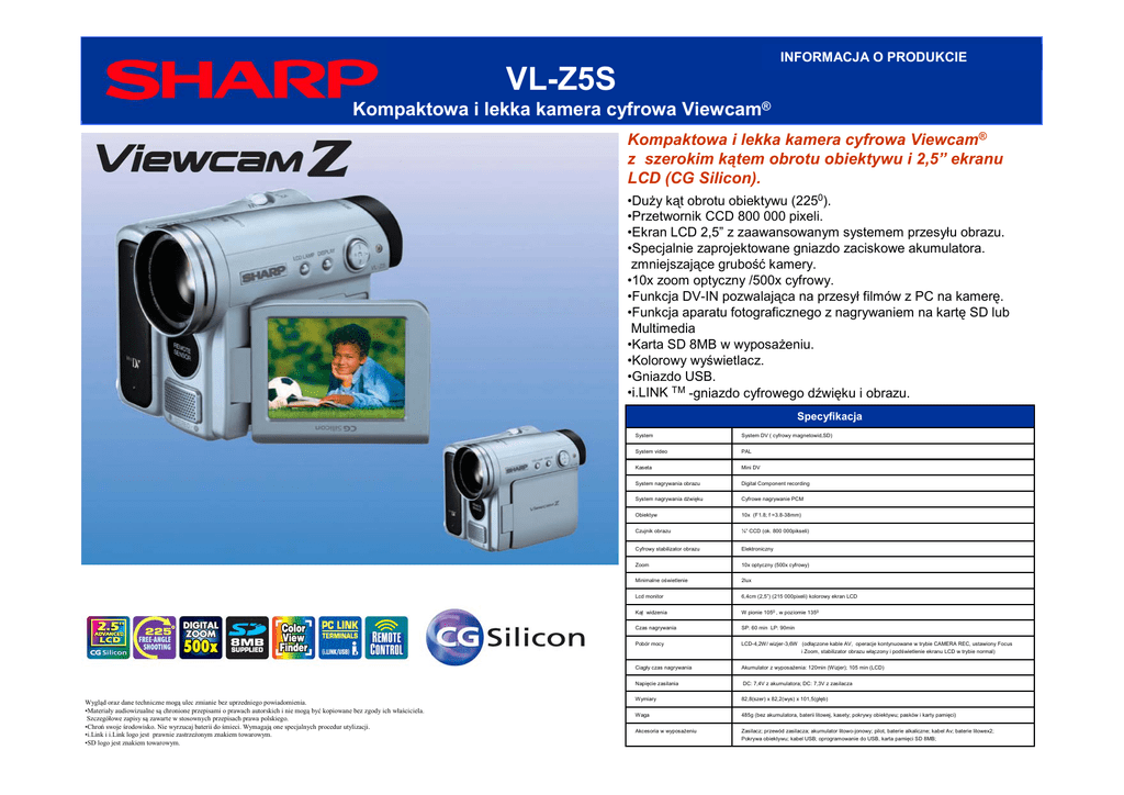 INFORMACJA O PRODUKCIE VL-Z5S Kompaktowa i lekka kamera cyfrowa Viewcam® Kompaktowa i lekka kamera cyfrowa Viewcam® z szerokim kątem obrotu obiektywu i 2,5” ekranu LCD (CG Silicon). •Duży kąt obrotu obiektywu (2250). •Przetwornik CCD 800 000 pixeli. •Ekran LCD 2,5” z zaawansowanym systemem przesyłu obrazu. •Specjalnie zaprojektowane gniazdo zaciskowe akumulatora. zmniejszające grubość kamery. •10x zoom optyczny /500x cyfrowy. •Funkcja DV-IN pozwalająca na przesył filmów z PC na kamerę. •Funkcja aparatu fotograficznego z nagrywaniem na kartę SD lub Multimedia •Karta SD 8MB w wyposażeniu. •Kolorowy wyświetlacz. •Gniazdo USB. •i.LINK TM -gniazdo cyfrowego dźwięku i obrazu. Specyfikacja Wygląd oraz dane techniczne mogą ulec zmianie bez uprzedniego powiadomienia. •Materiały audiowizualne są chronione przepisami o prawach autorskich i nie mogą być kopiowane bez zgody ich właściciela. Szczegółowe zapisy są zawarte w stosownych przepisach prawa polskiego. •Chroń swoje środowisko. Nie wyrzucaj baterii do śmieci. Wymagają one specjalnych procedur utylizacji. •i.Link i i.Link logo jest prawnie zastrzeżonym znakiem towarowym. •SD logo jest znakiem towarowym. System System DV ( cyfrowy magnetowid,SD) System video PAL Kaseta Mini DV System nagrywania obrazu Digital Component recording System nagrywania dźwięku Cyfrowe nagrywanie PCM Obiektyw 10x (F1.8; f =3.8-38mm) Czujnik obrazu ¼” CCD (ok. 800 000pikseli) Cyfrowy stabilizator obrazu Elektroniczny Zoom 10x optyczny (500x cyfrowy) Minimalne oświetlenie 2lux Lcd monitor 6,4cm (2,5”) (215 000pixeli) kolorowy ekran LCD Kąt widzenia W pionie 1050 , w poziomie 1350 Czas nagrywania SP: 60 min LP: 90min Pobór mocy LCD-4,2W/ wizjer-3,6W (odłączone kable AV, operacje kontynuowane w trybie CAMERA REC, ustawiony Focus i Zoom, stabilizator obrazu włączony i podświetlenie ekranu LCD w trybie normal) Ciągły czas nagrywania Akumulator z wyposażenia: 120min (Wizjer); 105 min (LCD) Napięcie zasilania DC: 7,4V z akumulatora; DC: 7,3V z zasilacza Wymiary 82,8(szer) x 82,2(wys) x 101,5(głęb) Waga 485g (bez akumulatora, baterii litowej, kasety; pokrywy obiektywu; pasków i karty pamięci) Akcesoria w wyposażeniu Zasilacz; przewód zasilacza; akumulator litowo-jonowy; pilot, baterie alkaliczne; kabel Av; baterie litowex2; Pokrywa obiektywu; kabel USB; oprogramowanie do USB, karta pamięci SD 8MB;