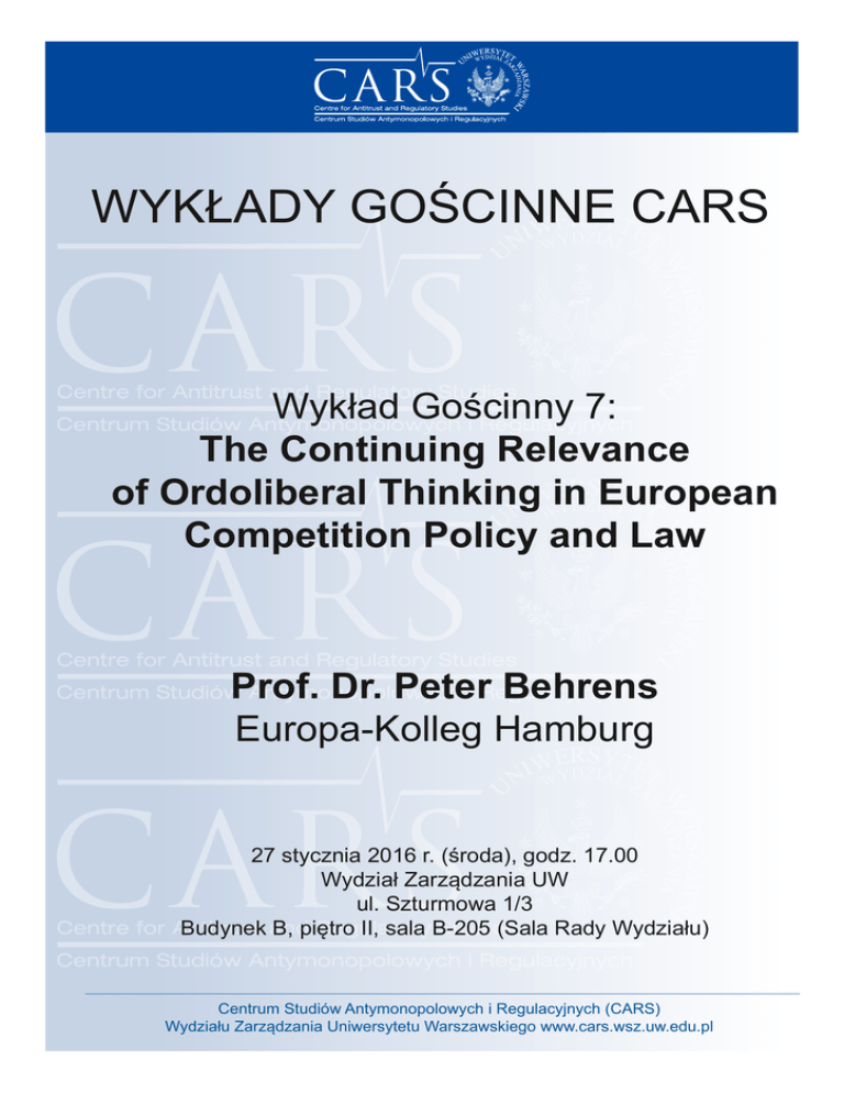 WYKŁADY GOŚCINNE CARS Wykład Gościnny 7: The Continuing Relevance of Ordoliberal Thinking in European Competition Policy and Law Prof. Dr. Peter Behrens Europa-Kolleg Hamburg 27 stycznia 2016 r. (środa), godz. 17.00 Wydział Zarządzania UW ul. Szturmowa 1/3 Budynek B, piętro II, sala B-205 (Sala Rady Wydziału) Centrum Studiów Antymonopolowych i Regulacyjnych (CARS) Wydziału Zarządzania Uniwersytetu Warszawskiego www.cars.wsz.uw.edu.pl