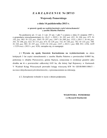 Z A R Z Ą D Z E N I E Nr 287/13 Wojewody Pomorskiego z dnia 14 października 2013 r. w sprawie zgody na wydzierżawienie części nieruchomości z zasobu Skarbu Państwa Na podstawie art. 11 ust. 2 i art. 23 ust. 1 pkt 7 a ustawy z dnia 21 sierpnia 1997 r. o gospodarce nieruchomościami (t.j. Dz.U. z 2010 r. Nr 102, poz. 651, Nr 106, poz. 675, Nr 143, poz. 963, Nr 155, poz. 1043, Nr 197, poz. 1307 i Nr 200, poz. 1323, z 2011 r. Nr 64, poz. 341, Nr 106, poz. 622, Nr 115, poz. 673, Nr 129, poz. 732, Nr 130, poz. 762, Nr 135, poz. 789, Nr 163, poz. 981, Nr 187, poz. 1110 i Nr 224, poz. 1337, z 2012 r. poz. 908, 951, 1256, 1429 i 1529 oraz z 2013 r. poz. 829), zarządza się, co następuje: § 1. Wyraża się zgodę Staroście Kartuskiemu na wydzierżawienie na okres kolejnych 3 lat części nieruchomości z zasobu Skarbu Państwa o powierzchni 0.0085 ha, położonej w obrębie Pierszczewo, gmina Stężyca, oznaczonej w ewidencji gruntów jako działka nr 6 o powierzchni całkowitej 0.05 ha, dla której Sąd Rejonowy w Kartuzach V Wydział Ksiąg Wieczystych prowadzi księgę wieczystą KW Nr GD1R/00011806/3 na rzecz dotychczasowych dzierżawców, z przeznaczeniem na rekreację. § 2. Zarządzenie wchodzi w życie z dniem podpisania. WOJEWODA POMORSKI (-) Ryszard Stachurski