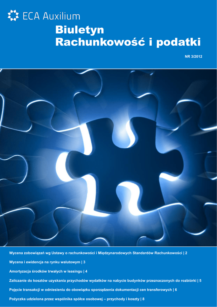 Biuletyn Rachunkowość i podatki NR 3/2012 Wycena zobowiązań wg Ustawy o rachunkowości i Międzynarodowych Standardów Rachunkowości | 2 Wycena i ewidencja na rynku walutowym | 3 Amortyzacja środków trwałych w leasingu | 4 Zaliczanie do kosztów uzyskania przychodów wydatków na nabycie budynków przeznaczonych do rozbiórki | 5 Pojęcie transakcji w odniesieniu do obowiązku sporządzenia dokumentacji cen transferowych | 6 Pożyczka udzielona przez wspólnika spółce osobowej – przychody i koszty | 8 RACHUNKOWOŚĆ BIULETYN 3/2012 Nadzór merytoryczny Michał Kołosowski Biegły Rewident, Partner e-mail: [email protected] Karierę zawodową rozpoczął w międzynarodowej firmie audytorskiej, a następnie zdobywał doświadczenie w jednej z czołowych firm z tzw. „Wielkiej Czwórki”. Posiadacz certyfikatu Diploma in International Financial Reporting wydawanego przez ACCA. Dysponuje bogatym doświadczeniem w badaniu sprawozdań finansowych, sporządzaniu pakietów konsolidacyjnych, sporządzaniu analiz finansowych typu Due Diligence, przekształcaniu sprawozdań finansowych na zgodne z MSR/MSSF oraz US GAAP. Specjalista w zakresie obsługi spółek z branży nieruchomości i Real Estate oraz Funduszy Inwestycyjnych Zamkniętych. W Grupie ECA Auxilium kieruje departamentem audytu w północnowschodniej Polsce. Autor licznych artykułów oraz ceniony wykładowca zagadnień z zakresu rachunkowości. Wycena zobowiązań wg Ustawy o rachunkowości i Międzynarodowych Standardów Rachunkowości Izabela Alamoda Asystent biegłego rewidenta e-mail: [email protected] Ustawa o rachunkowości (Dz. U. z 2009 r. nr 152, poz. 1223 z późn. zm.), jak również Międzynarodowe Standardy Rachunkowości (MSR) w podobny sposób definiują zobowiązania – jako obowiązek jednostki wykonania określonego świadczenia, mającego swe źródło w zdarzeniu przeszłym, które spowoduje wykorzystanie przez jednostkę środków stanowiących korzyści ekonomiczne. Jednakże pomimo zbieżnego określania tego pojęcia, wycena zobowiązań według Ustawy o rachunkowości różni się od wytycznych zawartych w MSR. Zgodnie z Ustawą o rachunkowości na dzień powstania zobowiązania ujmuje się według wartości nominalnej, a więc zgodnej z kwotą brutto faktury. Natomiast według art. 28 ust. 1 pkt. 8-8a, nie rzadziej niż na dzień bilansowy zobowiązania wycenia się w kwocie wymagającej zapłaty, a więc z ewentualnymi odsetkami za zwłokę w zapłacie (zaliczonymi do kosztów finansowych). W przypadku zobowiązań finansowych wyceny dokonuje się według skorygowanej ceny nabycia, a w przypadku zamiaru przeznaczenia ich do sprzedaży w ciągu 3 miesięcy – według wartości rynkowej lub inaczej określonej wartości godziwej. W przypadku zobowiązań wyrażonych w walutach obcych, w dniu powstania zobowiązania ujmuje się w wartości zgodnej z wyceną według średniego kursu NBP z dnia poprzedzającego ten dzień. Również w momencie zapłaty zobowiązania konieczne jest dokonanie wyceny według kursu faktycznie zastosowanego lub, jeżeli zastosowanie tego kursu nie jest uzasadnione, według średniego kursu NBP z dnia poprzedzającego dzień zapłaty zobowiązania. Różnice kursowe powstałe w wyniku wyceny na dzień powstania oraz na dzień zapłaty zalicza się, zależnie od ich charakteru (dodatnie czy ujemne różnice kursowe) do przychodów lub kosztów finansowych. Oprócz tego, zgodnie z art. 30 ust. 1 pkt. 1 Ustawy o rachunkowości, na dzień bilansowy dokonuje się wyceny po obowiązującym na ten dzień średnim kursie ogłoszonym dla danej waluty przez Narodowy Bank Polski. Ujemne lub dodatnie różnice kursowe z tego tytułu ujmuje się w ciężar kosztów lub też na dobro przychodów finansowych, nie stanowiących k o s zt u / p r z yc h o d u podatkowego dla Spółek, które rozliczają różnice kursowe na zasadach ogólnych. Międzynarodowe Standardy Rachunkowości nie konkretyzują zasad wyceny rozrachunków, jednakże przyjmuje się zasadę ujmowania zobowiązań po koszcie historycznym, który jest zazwyczaj zbliżony do wartości godziwej. Na dzień bilansowy natomiast MSR zalecają wycenę zobowiązań według zamortyzowanego kosztu, w przypadku którego uwzględnia się dotychczasowe spłaty zobowiązania. Odrębnie traktowane są natomiast zobowiązania finansowe – MSR 39 wskazuje na prawidłowe ujęcie zobowiązań finansowych (początkowa wycena) według wartości godziwej, powiększonej, w przypadku zobowiązania finansowego niekwalifikowanego jako wyceniane według wartości godziwej przez wynik finansowy, o koszty transakcji, które mogą być bezpośrednio przypisane do nabycia lub emisji zobowiązania finansowego. W terminie późniejszym natomiast zobowiązania finansowe wyceniane są według zamortyzowanego kosztu z wykorzystaniem metody efektywnej stopy procentowej. Odnośnie wyceny zobowiązań w walutach obcych stosuje się wytyczne zawarte w MSR 21. I tak § 21 standardu wskazuje na początkowe ujęcie zobowiązania, jak również jego zapłatę, w walucie funkcjonalnej, definiowanej jako waluta podstawowego środowiska 2 RACHUNKOWOŚĆ gospodarczego, w którym działa jednostka, przeliczanej po natychmiastowym kursie wymiany waluty funkcjonalnej na walutę obcą obowiązującym na dzień wystąpienia tych zdarzeń. Powstałe BIULETYN 3/2012 w wyniku zastosowanej wyceny zobowiązań różnice kursowe prezentuje się w wyniku finansowym okresu, w którym powstały. Na dzień bilansowy z kolei zobowiązania w walucie obcej przelicza się stosując kurs zamknięcia, a więc natychmiastowy kurs wymiany na koniec okresu sprawozdawczego. Izabela Alamoda Wycena i ewidencja na rynku walutowym Małgorzata Jarzębska Asystent biegłego rewidenta e-mail: [email protected] Zgodnie z ustawą z dnia 27 lipca 2002 roku (Dz. U. Nr 141 poz. 1178 z późn. zm.) – Prawo dewizowe, do gromadzenia środków pieniężnych wyrażonych w walutach obcych jednostki gospod