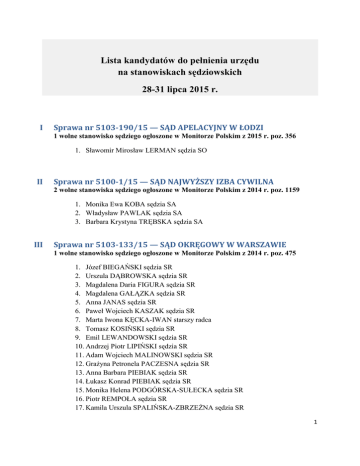 Lista kandydatów do pełnienia urzędu na stanowiskach sędziowskich 28-31 lipca 2015 r. I Sprawa nr 5103-190/15 — SĄD APELACYJNY W ŁODZI 1 wolne stanowisko sędziego ogłoszone w Monitorze Polskim z 2015 r. poz. 356 1. Sławomir Mirosław LERMAN sędzia SO II Sprawa nr 5100-1/15 — SĄD NAJWYŻSZY IZBA CYWILNA 2 wolne stanowiska sędziego ogłoszone w Monitorze Polskim z 2014 r. poz. 1159 1. Monika Ewa KOBA sędzia SA 2. Władysław PAWLAK sędzia SA 3. Barbara Krystyna TRĘBSKA sędzia SA III Sprawa nr 5103-133/15 — SĄD OKRĘGOWY W WARSZAWIE 1 wolne stanowisko sędziego ogłoszone w Monitorze Polskim z 2014 r. poz. 475 1. Józef BIEGAŃSKI sędzia SR 2. Urszula DĄBROWSKA sędzia SR 3. Magdalena Daria FIGURA sędzia SR 4. Magdalena GAŁĄZKA sędzia SR 5. Anna JANAS sędzia SR 6. Paweł Wojciech KASZAK sędzia SR 7. Marta Iwona KĘCKA-IWAN starszy radca 8. Tomasz KOSIŃSKI sędzia SR 9. Emil LEWANDOWSKI sędzia SR 10. Andrzej Piotr LIPIŃSKI sędzia SR 11. Adam Wojciech MALINOWSKI sędzia SR 12. Grażyna Petronela PACZESNA sędzia SR 13. Anna Barbara PIEBIAK sędzia SR 14. Łukasz Konrad PIEBIAK sędzia SR 15. Monika Helena PODGÓRSKA-SUŁECKA sędzia SR 16. Piotr REMPOŁA sędzia SR 17. Kamila Urszula SPALIŃSKA-ZBRZEŻNA sędzia SR 1 18. Monika Honorata TKACZYK-TUREK sędzia SR 19. Iwona FALKOWSKA sędzia SO – cofnięcie zgłoszenia 20. Jerzy Andrzej KIPER sędzia SO – cofnięcie zgłoszenia IV Sprawa nr 5102-9/15 — WOJEWÓDZKI SĄD ADMINISTRACYJNY W WARSZAWIE 1 wolne stanowisko sędziego ogłoszone w Monitorze Polskim z 2014 r. poz. 839 1. Józef BIEGAŃSKI sędzia SR 2. Piotr Witold CICHY Naczelnik Urzędu Skarbowego 3. Bogusława DOBKOWSKA etatowy członek SKO 4. Justyna DYKIER radca prawny 5. Dominik Jan GAJEWSKI były adwokat były radca prawny adiunkt 6. Ewa Stanisława GAŁUSZYŃSKA radca prawny etatowy członek SKO 7. Barbara Anna GŁUSZCZAK-PŁÓCIENNIK etatowy członek SKO 8. Tomasz Edward JANECZKO adwokat były sędzia SR 9. Michał Włodzimierz JASIŃSKI etatowy członek SKO 10. Tomasz KOŹMIŃSKI sędzia SR 11. Hanna KRÓLAK radca prawny doradca prawny NIK 12. Małgorzata Ewa KRYŃSKA -MOZOLEWSKA sędzia SR 13. Beata MACHCIŃSKA radca prawny 14. Aleksandra MAJAK kierownik samodzielnego referatu Izba Skarbowa 15. Piotr MASALSKI radca prawny 16. Adam Witold NITA radca prawny profesor nadzwyczajny 17. Magdalena Dorota NOWAK etatowy członek SKO 18. Łukasz Konrad PIEBIAK sędzia SR 19. Dorota Maria PODSIEDZIK-MALEC radca prawny dyrektor departamentu 20. Grzegorz RZĄSA radca prawny 21. Władysław SŁOWIŃSKI radca prawny 22. Iwona ŚCIESZKA starszy asystent sędz. NSA 23. Radosław Piotr TERESIAK doradca podatkowy 24. Kamila Elżbieta WIŚNIEWSKA-HAŁKA radca prawny etatowy członek SKO 25. Paweł ZIEŃ radca prawny 26. Aneta Magdalena ŻAK referendarz WSA 27. Karina Renata JANKOWSKA radca prawny – cofnięcie zgłoszenia 28. Bożena Barbara ZWOLENIK radca prawny dyrektor Biura Prawnego – cofnięcie zgłoszenia V Sprawa nr 5103-184/15 — SĄD OKRĘGOWY W LEGNICY 1 wolne stanowisko sędziego ogłoszone w Monitorze Polskim z 2014 r. poz. 714 2 1. 2. 3. 4. 5. VI Agnieszka CZYCZERSKA sędzia SR Jolanta KRUTIN sędzia SR Adrianna Lidia MONGIAŁŁO sędzia SR Agata Anna MULARSKA-KARAMON sędzia SR Aneta MURAWSKA sędzia SR Sprawa nr 5103-136/15 — SĄD OKRĘGOWY W RZESZOWIE 1 wolne stanowisko sędziego ogłoszone w Monitorze Polskim z 2015 r. poz. 102 1. 2. 3. 4. 5. 6. VII Witold Jan BENICKI sędzia SR Brygida GRADKOWSKA-FERENC sędzia SR Krystyna Izabella MAGNUSZEWSKA sędzia SR Piotr PELC sędzia SR Grzegorz PLIŚ sędzia SR Joanna Maria WALAT-SMELA sędzia SR Sprawa nr 5103-137/15 — SĄD OKRĘGOWY W TARNOBRZEGU 2 wolne stanowiska sędziego ogłoszone w Monitorze Polskim z 2015 r. poz. 143 1. Krzysztof DEMBOWSKI sędzia SR 2. Arkadiusz HRYNISZYN sędzia SR 3. Mariusz Tadeusz KOBYLARZ sędzia SR 4. Maciej Piotr OLECHOWSKI sędzia SR 5. Anna Maria POLAŃSKA-ZIOBRO sędzia SR 6. Marcin Stanisław ROGOWSKI sędzia SR 7. Szymon Oskar ROŻEK sędzia SR 8. Marian Kazimierz RŻANY sędzia SR 9. Katarzyna Renata SITEK sędzia SR 10. Władysław STALA sędzia SR 11. Grzegorz Jerzy WOLAK sędzia SR 12. Lidia Teresa ZIARKO sędzia SR VIII Sprawa nr 5103-138/15 — SĄD REJONOWY W TYCHACH 1 wolne stanowisko sędziego ogłoszone w Monitorze Polskim z 2014 r. poz. 1115 1. Agata Katarzyna GOC-GRZYWNOWICZ referendarz SR 2. Aleksandra Ewa WILCZYŃSKA asystent sędz. SR 3 IX Sprawa nr 5103-139/15 — SĄD REJONOWY W SIEMIANOWICACH ŚLĄSKICH 1 wolne stanowisko sędziego ogłoszone w Monitorze Polskim z 2014 r. poz. 1115 1. 2. 3. 4. 5. 6. X Ewelina Małgorzata CHROBOT-BRONISZEWSKA asystent sędz. SA Joanna Antonina KAMIONKA-KOWALIK asystent sędz. SO Anna Barbara KOZŁOWSKA-HOLEWIK adwokat Katarzyna NOSEK-ZEMCZAK asystent sędz. SR Agata Anna PALUCH asystent sędz. SO Katarzyna Ewelina POŁOWNIAK-BARAN asystent sędz. SO Sprawa nr 5103-140/15 — SĄD REJONOWY KATOWICE-ZACHÓD W KATOWICACH 1 wolne stanowisko sędziego ogłoszone w Monitorze Polskim z 2014 r. poz. 1115 1. Izabela Maria BIEŃKO-MAJ notariusz były sędzia 2. Tomasz Andrzej KACZMARSKI referendarz SR 3. Izabela Anna MARCZEWSKA referendarz SR XI Sprawa nr 5103-141/15 — SĄD REJONOWY KATOWICE-WSCHÓD W KATOWICACH 1 wolne stanowisko sędziego ogłoszone w Monitorze Polskim z 2014 r. poz. 1115 1. 2. 3. 4. XII Eliza CHRUSTEK asystent sędz. SO Tomasz Leszek DŁUGOSZ prokurator Prokuratury Rejonowej Bartłomiej Dominik JOCHEMCZYK referendarz SR Ewa SZEWCZYK-PIOTROWSKA adwokat Sprawa nr 5103-142/15 — SĄD REJONOWY W BYTOMIU 1 wolne stanowisko sędziego ogłoszone w Monitorze Polskim z 2014 r. poz. 1115 1. 2. 3. 4. Justyna Agnieszka KANIUT-BOGOWICZ adwokat Aleksandra Apolonia KASZA-GRABOWSKA asystent sędz. SR Katarzyna LIS asystent sędz. SO Małgorzata TAM adwokat 4 XIII Sprawa nr 5103-143/15 — SĄD REJONOWY W KALISZU 1 wolne stanowisko sędziego ogłoszone w Monitorze Polskim z 2015 r. poz. 26 1. 2. 3. 4. 5. 6.