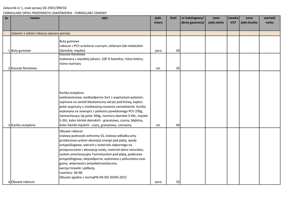 Załacznik nr 1, znak sprawy DZ-2501/399/16 FORMULARZ OPISU PRZEDMIOTU ZAMÓWIENIA - FORMULARZ CENOWY lp. nazwa opis jedn. miary ilość Zadanie 1 odzież robocza opisana ponizej 1 Buty gumowe Buty gumowe robocze z PCV w kolorze czarnym, zielonym lub niebieskim (damskie, męskie) Koszula flanelowa wykonana z wysokiej jakości, 100 % bawełny, różne kolory, różne rozmiary 2 Koszula flanelowa 3 Kurtka ocieplona Kurtka ocieplona wielosezonowa, wodoodporna 3w1 z wypinanym polarem, zapinana na zamek błyskawiczny ukryty pod listwą, kaptur, polar wypinany z możliwością noszenia samodzielnie. Kurtka wykonana na zewnątrz z poliestru powlekanego PCV 230g, niemechacący się polar 260g, rozmiary damskie S-XXL, męskie S-3XL, kolor kórtek damskich - granatowy, czarny, błękitny, kolor kórtek męskich - szary, granatowy, czerwony para 30 szt. 35 szt. 40 para 35 Obuwie robocze stalowy podnosek ochronny S3, stalowa wkładka anty przebiciowa system absorpcji energii pod piętą, spody antypoślizgowe, wierzch z materiału odpornego na przepuszczanie i absorpcję wody, materiał skóra naturalna, system amortyzacyjny Tunnelsystem pod piętą, podeszwa antypoślizgowa, olejoodporna, wykonana z poliuretanu oraz gumy, właściwości antyelektrostatyczne, wersja trzewiki i półbuty, rozmiary: 36-48. Obuwie zgodne z normąPN-EN ISO 20345:2012 4 Obuwie robocze nr katalogowy/ okres gwarancji cena jedn.netto stawka cena VAT jedn.brutto wartość netto Ocieplacz - kamizelka z poliestru mikrofibra, ocieplenie z polaru, zapięcie na zamek błyskawiczny,4 kieszenie, dwustronny, różne kolory, model damski lub męski 5 Ocieplacz - kamizelka szt. 40 kpl. 30 szt. 4 Ubranie robocze Kombinezon roboczy składający się z bluzy oraz spodni do pasa lub w drugim wariancie spodnie ogrodniczki. Tkanina poliester reinforcement 600D-65 % ,bawełna 35 %, gramatura: 280 g/m2. Kolor: czarno-pomarańczowy Części kombinezonu tj. bluzę i spodnie opisano poniżej. Bluza: trwała bluza robocza z wieloma kieszeniami, bluza zapinana na zamek przykryty patką, rękawy zakończone elastycznym ściągaczem. Spodnie robocze: z gumą ściągającą wszytą w tunel po obwodzie pasa, zamek błyskawiczny w rozporku, posiadają kieszenie boczne oraz na telefon i nakolanniki. Spodnie ogrodniczki: z kieszeniami na klatce piersiowej i udach oraz kieszeniami na nakolanniki, kieszeniami na telefon i na portfel, szelki z gumą regulująca, zapinane z przodu na wysokiej jakości klamry Nexus, potrójne szwy na nogawkach, 11 kieszeni. Ubranie zgodne z normą PN-EN 340:2006 6 Ubranie robocze typ 1 Ubranie robocze Kombinezon roboczy składający się z bluzy oraz spodni do pasa lub w drugim wariancie spodnie ogrodniczki. Tkanina - 100 % bawełna, gramatura: 260 g/m2. Kolor: czerwony. Części kombinezonu tj. bluzę i spodnie opisano poniżej.Bluza: trwała bluza robocza z wieloma kieszeniami, posiada ściągacz na końcach rękawów, bluza zapinana na zamek przykryty patką. Spodnie robocze: z gumą ściągającą wszytą w tunel po obwodzie pasa, zamek błyskawiczny w rozporku, posiadają kieszenie boczne oraz na telefon i nakolanniki. Spodnie ogrodniczki: z kieszeniami na klatce piersiowej i udach oraz kieszeniami na nakolanniki. Szelki o szerokości 5 cm z gumą regulującą, zapinane z przodu na klamry. Ubranie zgodne z normą PN-EN 340:2006 7 Ubranie robocze typ 2 Ubranie robocze Kombinezon roboczy składający się z bluzy oraz spodni ogrodniczek. Tkanina – poliester 65%, bawełna 35%, gramatura 230 g/m. Kolor: zielony. Ubranie zgodne z normą PN-EN 340:2006 8 Ubranie robocze typ 3 szt. 1 RAZEM: Zadanie 2 obuwie profilaktyczne 1 Obuwie profilaktyczne typ 1 Obuwie profilaktyczne pantolety zdrowotne(drewniaki) damskie lub męskie na spodach drewnianych z pełnym profilem ortopedycznym, podeszwą z bieżnikiem antypoślizgowym, cholewką ze skóry naturalnej (skóra śliska lub welur), cholewka gładka lub z perforacją, cholewka pełna lub z przyszwą dwupaskową do regulacji tęgości, różne kolory. Rozmiary od 35 do 46. Obuwie zgodnie z normą PN-EN ISO 20347:2007 para 150 2 Obuwie profilaktyczne typ 2 Obuwie profilaktyczne damskie i męskie na spodach przeciwpoślizgowych i wkładach korkowo-gumowych z pełnym profilem ortopedycznym, wyściółka i cholewka wykonana ze skóry naturalnej (skóra śliska lub welur) , cholewka gładka lub z perforacją, możliwość regulacji tęgości, z paskiem za piętę lub drugi wariant bez paska, różne kolory. Rozmiary od 35 do 46 Obuwie zgodne z normą PN-EN ISO 20347:2007 para 100 3 Obuwie profilaktyczne typ 3 Obuwie profilaktyczne damskie lub męskie na spodach przeciwpoślizgowych, z cholewką i wyściółką ze skóry naturalnej, regulacja tęgości, z paskiem za piętę lub drugi wariant bez paska, perforacja, z pełnym profilem ortopedycznym, kolor biały, czarny lub brązowy. Rozmiary od 35 do 46. Obuwie zgodne z normą PN-EN ISO 20347:2007 para 150 RAZEM: Zadanie 3 ręczniki opisane ponizej lub równoważne Ręcznik kąpielowy pierwszy gatunek, wymiary:70x140, gramatura 500g/m2, materiał: bawełna 100 %, różne kolory szt. 1 Ręcznik kąpielowy 30 RAZEM: Zadanie 4 fartuchy Fartuch ochronny Kolor biały,Fartuch ochronny z długim rękawem, rękaw bez mankietu z podwójną regulacją z zatrzaskiem. Posiada dwie boczne dolne kieszenie oraz dodatkową kieszeń na wysokości piersi po lewej stronie oraz rozporki po bokach. Fartuch jest zapinany na zatrzaski. W przypadku fasonu męskiego, fartuch powinien posiadać podwójną regulację paska. Wykonany z dobrej jakości materiału, skład: 65 % poliestru, 35 % bawełna, waga 180 g/m2. Tkanina przeznaczona na odzież zawodowomedyczną, która powinna posiadać następujące parametry: wytrzymałość na tarcie, niska kurczliwość 2% w praniu wodnym o temperaturze 95°C, trwałość barw, możliwość łączenia kolorów bez obawy zmiany barw, komfort w użytkowaniu. Fartuch zgodny z normą PN-P84525:1998 1 Fartuch ochronny szt. 300 sz