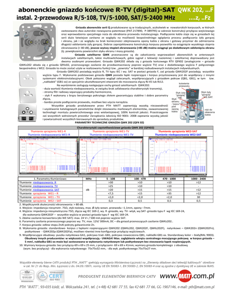 abonenckie gniazdo końcowe R-TV (digital)-SAT QWK 202, ...F instal. 2-przewodowa R/5-108, TV/5-1000, SAT/5-2400 MHz ….z, ..Fz Gniazda abonenckie serii Q produkowane są w tradycyjnych, aczkolwiek w nowatorskich korpusach, w których zastosowano dwa autorskie rozwiązania patentowe (PAT.217890, P-389795) w zakresie konstrukcji przyłącza wejściowego oraz wprowadzenia specjalnego noża do obrabiania przewodu instalacyjnego. Podłączenie kabla staje się w gniazdach tej serii dużo łatwiejsze zarówno ze względu na możliwość bezpośredniego oglądania procesu podłączania żyły gorącej i ekranu, jak i ze względu na brak konieczności zdejmowania opony kabla z ekranu i gotowy przymiar do odmierzania długości odsłaniania żyły gorącej. Dobrze zaprojektowana konstrukcja korpusu pozwoliła na osiągnięcie wysokiego stopnia ekranowania (> 80 dB), jeszcze wyższy stopień ekranowania (>85 dB) można osiągnąć po dodatkowym odsłonięciu ekranu (tj. powiększeniu powierzchni styku ekranu i masy gniazda). Gniazda satelitarne QWK przeznaczone są do zakończenia wyprowadzeń abonenckich w antenowych instalacjach satelitarnych, także multiswitchowych, gdzie sygnał z telewizji naziemnej i satelitarnej doprowadzany jest dwoma osobnymi przewodami. Gniazdo QWK202 składa się z gniazda końcowego RTV QFK02 (analogicznie – gniazdo QWKz202 składa się z gniazda QFKz02, przenoszącego zasilanie do przedwzmacniaczy poprzez wyjście TV) oraz z dodatkowego wyjścia F połączonego bezpośrednio z WE2. Gniazdo to może zostać użyte w realizowaniu funkcji tzw. „powrotu” w bardziej rozbudowanych instalacjach indywidualnych. Gniazda QWK202 posiadają wyjścia R, TV typu IEC i wy. SAT w postaci gniazda F, zaś gniazda QWK202F posiadają wszystkie wyjścia typu F. Wykonanie podstawowe gniazda QWK posiada łapki rozpierające i korpus przystosowany jest do współpracy z innymi systemami elektroinstalacyjnymi. Obok pokazano wygląd zalecanych, współpracujących z gniazdem pokryw (QB1, GB1), w tym tzw. „nakładek” (GB1-xx) ze specjalnie ukształtowanymi otworami do mocowania złączy RJ 45 lub RJ12. Na wyróżnienie zasługują następujące cechy gniazd satelitarnych QWK202: - duża wartość tłumienia niedopasowania, w związku brak zafalowania charakterystyki transmisji, - stromy filtr radiowy separujący produkty harmoniczne, - styk F wykonany z brązu berylowego pokrytego złotem gwarantujący stabilne i dobre parametry złącza, - bardzo proste podłączenie przewodu, możliwe bez użycia narzędzia. Wszystkie gniazda produkowane przez PTH MATT zapewniają wysoką niezawodność i uzyskiwanie katalogowych parametrów dzięki stosowaniu markowych elementów, zaawansowanej technologii montażu powierzchniowego oraz wieloetapowej, 100% kontroli jakości. Przestrzeganie zaś wszystkich wdrożonych procedur Zarządzania Jakością ISO 9001: 2008 zapewnia wysoką jakość i powtarzalność wszystkich kierowanych do sprzedaży produktów. PARAMETRY TECHNICZNE GNIAZDA QWK 202 (QFK 02) Tłumienie sprzężenia WE1-R Tłumienie niedopasowania WE1-R Charakterystyki częstotliwościowe gniazda QWK 202 (QFK02) Tłumienie sprzężenia WE1-TV Tłumienie sprzężenia WE2-SAT Tłumienie niedopasowania WE1-TV Tłumienie niedopasowania WE2-SAT 1. Parametry tłumieniowe: MHz 5 - 108 108 - 470 470 - 1000 1000 - 2400 Tłumienie niedopasowania R >30 >10 >10 >12 Tłumienie niedopasowania TV >25 >10 >10 Tłumienie niedopasowania SAT dB >20 >15 >15 >12 Tłumienie sprzężenia WE1 – R <7,5 >15 >35 >12 Tłumienie sprzężenia WE1 – TV <2,0 <2,0 <2,0 30 Tłumienie sprzężenia WE2 – SAT 0,3 0,5 0,5 0,5 2. Współczynnik skuteczności ekranowania: > 80 dB. 3. Wejście: impedancja niesymetr. 75Ω, styk nożowy, max. Ø żyły wewn. przewodu –1.1mm, opony –7mm. 4. Wyjścia: impedancja niesymetryczna 75Ω, złącza wg IEC 169-2, wy. R -gniazdo, wy. TV- wtyk, wy.SAT- gniazdo typu F wg IEC 169-24, dla wykonania QWK202F – wszystkie wyjścia w postaci gniazda typu F wg IEC 169-24. 5. Zdalne zasilanie konwertera (do WE SAT): max. 24 V= / 500 mA poprzez wyjście SAT. 6. Parametry zasilania przenoszonego poprzez wy. TV, max. 12V/ 300mA, DC – dla gniazd przenoszących zasilanie QWKz202.. 7. Korpus gniazda: odlew stopu ZnAl pokryty galwanicznie Zn. 8. Wykonania gniazda: standardowe- korpus z łapkami rozpierającymi QWK202 (QWKz202, QWK202F, QWKz202F), natynkowe – QWK202n (QWK202Fn), podtynkowe - QWK202p (QWK202Fp), możliwe również inne konfiguracje przyłączy wyjściowych. 9. Współpracujące obudowy: puszka natynkowa-GA1, pokrywa trad.-GB1, pokrywa nowoczesna-QB1, nakładki-GB1-xx. Standardowy kolor – biały(RAL 9003). Obudowy innych producentów: w większości współpracują - UWAGA! Max. zagłębienie wkrętu centralnego mocującego pokrywę w korpus gniazda – 5 mm!, nakładka GB1-xx może być zastosowana w wykonaniu natynkowym lub podtynkowym bez stosowania łapek rozpierających. 10. Wymiary korpusu gniazda: bez przyłączy-69 x 69 x 25 mm, z przyłączami- 69 x 69 x 41mm; wymiary gniazda kompletnego z obudową (wym. bez przyłączy) - dla wykonania natynkowego 75x75x32 mm, - dla wyk. podtynkowego 75x75x27 mm.