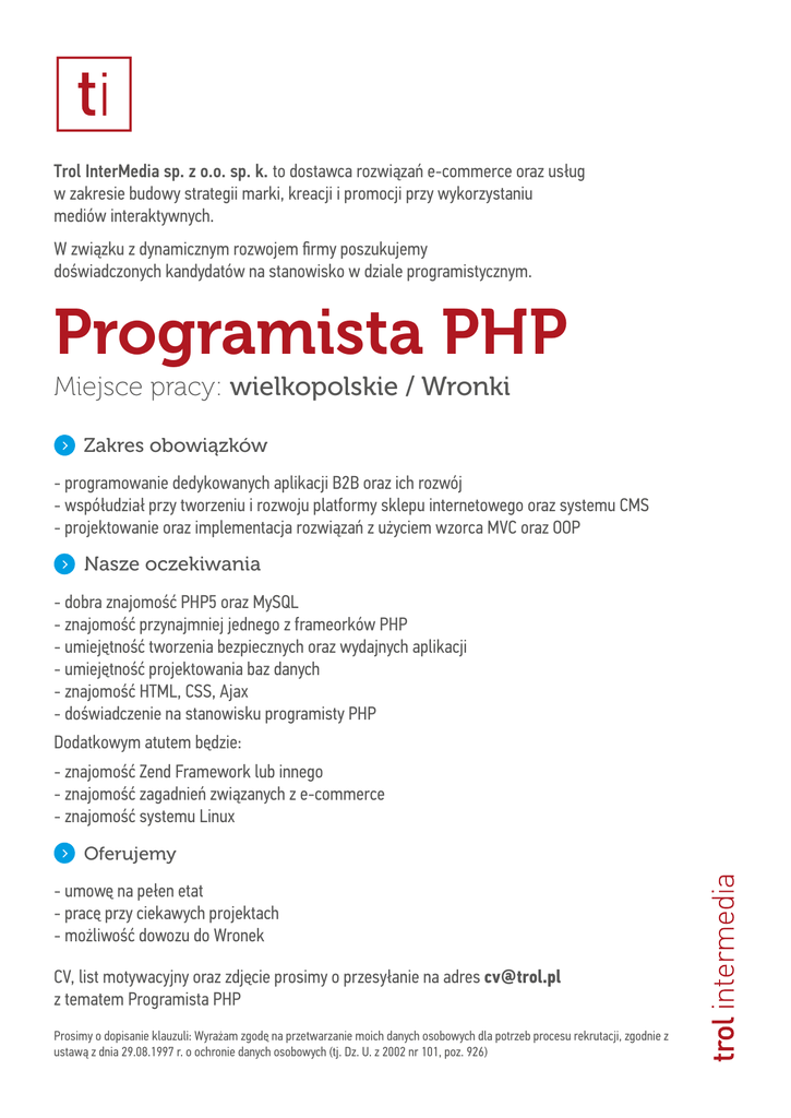 Trol InterMedia sp. z o.o. sp. k. to dostawca rozwiązań e-commerce oraz usług w zakresie budowy strategii marki, kreacji i promocji przy wykorzystaniu mediów interaktywnych. W związku z dynamicznym rozwojem firmy poszukujemy doświadczonych kandydatów na stanowisko w dziale programistycznym. Programista PHP Miejsce pracy: wielkopolskie / Wronki Zakres obowiązków - programowanie dedykowanych aplikacji B2B oraz ich rozwój - współudział przy tworzeniu i rozwoju platformy sklepu internetowego oraz systemu CMS - projektowanie oraz implementacja rozwiązań z użyciem wzorca MVC oraz OOP Nasze oczekiwania - dobra znajomość PHP5 oraz MySQL - znajomość przynajmniej jednego z frameorków PHP - umiejętność tworzenia bezpiecznych oraz wydajnych aplikacji - umiejętność projektowania baz danych - znajomość HTML, CSS, Ajax - doświadczenie na stanowisku programisty PHP Dodatkowym atutem będzie: - znajomość Zend Framework lub innego - znajomość zagadnień związanych z e-commerce - znajomość systemu Linux Oferujemy - umowę na pełen etat - pracę przy ciekawych projektach - możliwość dowozu do Wronek CV, list motywacyjny oraz zdjęcie prosimy o przesyłanie na adres [email protected] z tematem Programista PHP Prosimy o dopisanie klauzuli: Wyrażam zgodę na przetwarzanie moich danych osobowych dla potrzeb procesu rekrutacji, zgodnie z ustawą z dnia 29.08.1997 r. o ochronie danych osobowych (tj. Dz. U. z 2002 nr 101, poz. 926)