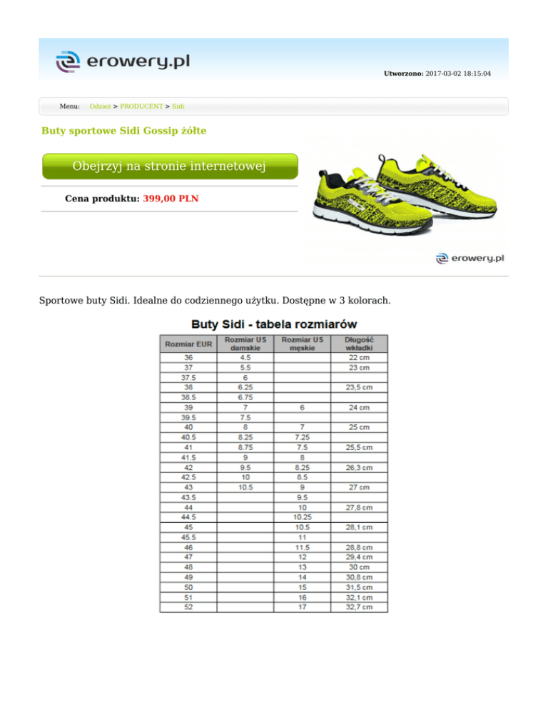 Utworzono: 2017-03-02 18:15:04 Menu: Odzież > PRODUCENT > Sidi Buty sportowe Sidi Gossip żółte Obejrzyj na stronie internetowej Cena produktu: 399,00 PLN Sportowe buty Sidi. Idealne do codziennego użytku. Dostępne w 3 kolorach. W 1960 firma Sidi rozpoczęła działalność jako warsztat produkcji obuwia sportowo-górskiego. Od 1970 roku Sidi specjalizuje się w obuwiu kolarskim, motocyklowym i butach do jazdy terenowej. Dino Signori, założyciel Sidi, łączy w sobie pasję do jazdy z ponad 50-cio letnim doświadczeniem w produkcji innowacyjnego obuwia sportowego. Dzięki tej pasji i głębokiej,intuicyjnej wiedzy, Sidi stała się liderem na rynku rowerowych i motocyklowych butów. Tradycyjne wartości i zaangażowanie w połączeniu z wydajną, międzynarodową siecią dystrybucji sprawiają że Sidi to firma, która jest obecna na całym świecie. Ze względu na wysoką jakość, obuwie Sidi zostało wybrane przez miliony sportowców. Przez lata Sidi wypracowała sobie własną, niezawodną technikę, która pozwala na osiągnięcie maksymalnej niezawodności i komfortu. Łącząc innowacje z półwieczem doświadczeń, Sidi to czysta pasja, która sprawia że nie jest tylko zwyczajną firmą. Przeznaczenie Marka Podeszwa Kolor Sportowe Sidi Guma Żółty_#FFFF00 Mimo dołożenia wszelkich starań nie gwarantujemy, że publikowane opisy i specyfikacje techniczne niezawierają uchybień lub błędów, które nie mogą jednak być podstawą do roszczeń. W przypadku jakichkolwiek wątpliwości, przed podjęciem decyzji prosimy o kontakt. Adres: www.erowery.pl Telefon: 605 515 185, 34 361 16 71 Email: [email protected]