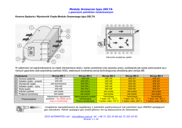 Moduły Grzewcze typu DELTA z gazowym palnikiem modulowanym Komora Spalania i Wymiennik Ciepła Modułu Grzewczego typu DELTA Kierunek przepływu spalin W zależności od zapotrzebowania na ciepło (temperatura wlotu i wylotu powietrza) oraz sposobu pracy, podzespoły jak wyżej wykonywane są z różnych gatunków stali szlachetnej (wartość AISI), właściwych konkretnej wersji technologicznej określanej jako wersja ME: Podzespoły 1 Komora spalania 2 Kolektor spalin - przedni 3 Wymiennik ciepła 4 Kolektor spalin – tylny 5 Wylot spalin 6 Kołnierz palnika 7 Podpora konstrukcji Przeznaczenie Wersja ME-1 Wersja ME-2 Wersja ME-3 Wersja ME-4 Wersja ME-5 AISI 430 AISI 430 stal aluminiowana AISI 430 AISI 430 stal zwykła stal zwykła Standardowe nagrzewnice powietrza – nie nadaje się do pracy w kondensacji AISI 430 AISI 304 L AISI 304 L AISI 304 L AISI 304 L stal zwykła stal zwykła Moduł grzewczy centrali wentylacyjnej Praca w kondensacji AISI 430 AISI 430 AISI 430 AISI 430 AISI 430 stal zwykła stal zwykła Technologia T wlotu: min. -10° C T wylotu: maks. 170° C AISI 321 AISI 430 AISI 430 AISI 430 AISI 430 stal zwykła stal zwykła Technologia T wlotu: min. -10° C T wylotu: maks. 280° C AISI 321 AISI 321 AISI 321 AISI 321 AISI 321 stal zwykła stal zwykła Technologia T wlotu: min. -50° C T wylotu: maks. 350° C Urządzenia zaprojektowane do współpracy z palnikiem podmuchowym lub palnikiem typu PREMIX spalającym gaz odczołowo. Palniki spalające gaz wokół głowicy nie są dopuszczone do stosowania. ISYS AUTOMATIOn Ltd – [email protected] tel. +48 71 322 24 86 lub 72 322 24 93 Strona 1 z 10 Moduły Grzewcze typu DELTA z gazowym palnikiem modulowanym Wykonanie modułu grzewczego. W zależności od przeznaczenia oraz wersji wykonania (ME), moduł grzewczy instalowany jest wewnątrz pustych sekcji standardowej centrali wentylacyjnej (wersja ME-2), w pustych sekcjach central gdzie izolacja termiczna ma grubość 50 ÷ 60 mm (wersja ME-3) lub grubość 80 mm (wersja ME-4 i ME-5). Moduł grzewczy może być również wykonany we własnej obudowie. Z chwilą instalacji w pustych sekcjach centrali jak wyżej, moduł grzewczy wyposażany jest w ramę konstrukcyjną, której zadaniem jest ułatwienie montażu urządzenia w sekcjach, zapewnienie prawidłowego przepływu powietrza i wymiany ciepła poprzez zapewnienia prawidłowych odległości między gorącymi powierzchniami komory spalania, wymiennika ciepła i elementów uszczelniających. Rama konstrukcyjna modułu grzewczego instalowanego w pustych sekcjach centrali wentylacyjnej Widok od strony palnika Widok od strony wylotu spalin ISYS AUTOMATIOn Ltd – [email protected] tel. +48 71 322 24 86 lub 72 322 24 93 Strona 2 z 10 Moduły Grzewcze typu DELTA z gazowym palnikiem modulowanym Moduł grzewczy we własnej obudowie. W niektórych przypadkach, moduły grzewcze dostarczane są we własnych obudowach. Stanowiąc źródło ciepła central wentylacyjnych, instalowane są zawsze na wylocie powietrza z centrali (podłączenie do centrali krótkim tunelem łączącym). Współpracując z centralą lub z zewnętrznym wentylatorem, instalowane są w wyznaczonym miejscu głównego kanału nawiewnego (połączenie za pomocą kołnierzy znajdujących się na wlocie i wylocie powietrza do i z modułu). Przykład podłączenia modułu we własnej obudowie do centrali wentylacyjnej CENTRALA WENTYLACYJNA Moduł grzewczy we własnej obudowie Tunel łączący moduł grzewczy z centralą Jego długość zależy od wielości modułu oraz wydatku wentylatora centrali Podobnie jak w przypadku pustych sekcji central wentylacyjnych, grubość izolacji termicznej własnych obudów modułów grzewczych odpowiada określonej wartości temperatury powietrza na wylocie z urządzenia: Temp. powietrza < 90° C Temp. powietrza 90° ÷ 150° C Temp. powietrza >150° C grubość izolacji 20 mm grubość izolacji 40 mm grubość izolacji 80 mm ISYS AUTOMATIOn Ltd – [email protected] tel. +48 71 322 24 86 lub 72 322 24 93 Strona 3 z 10 Moduły Grzewcze typu DELTA z gazowym palnikiem modulowanym Strona wykonania modułu grzewczego. Strona wykonania urządzenia zależy od wielu czynników i ostatecznie definiuje ją projektant w dokumentacji projektowej. W przypadku współpracy modułu grzewczego z centralą wentylacyjną, moduł występuje zawsze z tą samą stroną wykonania z jaką wykonana została centrala. Wylot powietrza Wlot powietrza Wlot powietrza Wylot powietrza Prawa strona wykonania Lewa strona wykonania ISYS AUTOMATIOn Ltd – [email protected] tel. +48 71 322 24 86 lub 72 322 24 93 Strona 4 z 10 Moduły Grzewcze typu DELTA z gazowym palnikiem modulowanym Króciec spalinowy (7) i rurka zespołu odprowadzenia kondensatu (8). Z chwilą instalacji modułu grzewczego w pustych sekcjach centrali wentylacyjnej, producent centrali może sam określić długość elementów 7 i 8. ISYS AUTOMATIOn Ltd – [email protected] tel. +48 71 322 24 86 lub 72 322 24 93 Strona 5 z 10 Moduły Grzewcze typu DELTA z gazowym palnikiem modulowanym Oznaczenia i wymiary modułów grzewczych w wersji ME-2 DELTA z wymiennikami GG stanowiących źródła ciepła central wentylacyjnych. Moduł grzewczy oznaczenia i wymiary Oznaczenia podstawowe H w mm L1 w mm L2 w mm Króciec spalinowy ØC w mm C1 w mm C2 w mm C3 w mm Odprowadzenie kondensatu ØD w mm D1 w mm D2 w mm D3 w mm Masa urządzenia bez palnika w kg Masa urządzenia z palnikiem i ramą montażową w kg GG30 GG40 GG60 GG80 GG110 GG130 500 1050 710 jw. 120 250 110 306 jw. 20 45 110 306 38 44 47 55 650 1200 860 jw. 160 330 140 360 jw. 20 40 140 360 64 71 72 84 850 1450 960 jw. 180 430 140 370 jw. 20 40 140 370 98 110 109 124 Typy wymienników ciepła GG160 GG250 GG350 GG450 GG200 GG300 GG400 GG520 1000 1550 1360 jw. 200 510 160 395 jw. 20 40 160 395 148 160 165 176 1150 1750 1860 jw. 250 575 165 370 jw. 20 80 165 370 243 266 267 298 1250 1700 2060 jw. 300 625 160 370 jw. 20 55 160 370 303 338 335 370 1300 1950 2