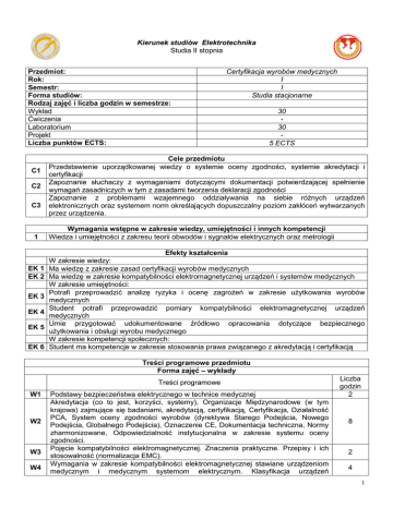 Kierunek studiów Elektrotechnika Studia II stopnia Przedmiot: Rok: Semestr: Forma studiów: Rodzaj zajęć i liczba godzin w semestrze: Wykład Ćwiczenia Laboratorium Projekt Liczba punktów ECTS: C1 C2 C3 1 Certyfikacja wyrobów medycznych I I Studia stacjonarne 30 30 5 ECTS Cele przedmiotu Przedstawienie uporządkowanej wiedzy o systemie oceny zgodności, systemie akredytacji i certyfikacji Zapoznanie słuchaczy z wymaganiami dotyczącymi dokumentacji potwierdzającej spełnienie wymagań zasadniczych w tym z zasadami tworzenia deklaracji zgodności Zapoznanie z problemami wzajemnego oddziaływania na siebie różnych urządzeń elektronicznych oraz systemem norm określających dopuszczalny poziom zakłóceń wytwarzanych przez urządzenia. Wymagania wstępne w zakresie wiedzy, umiejętności i innych kompetencji Wiedza i umiejętności z zakresu teorii obwodów i sygnałów elektrycznych oraz metrologii Efekty kształcenia W zakresie wiedzy: EK 1 Ma wiedzę z zakresie zasad certyfikacji wyrobów medycznych EK 2 Ma wiedzę w zakresie kompatybilności elektromagnetycznej urządzeń i systemów medycznych W zakresie umiejętności: Potrafi przeprowadzić analizę ryzyka i ocenę zagrożeń w zakresie użytkowania wyrobów EK 3 medycznych Student potrafi przeprowadzić pomiary kompatybilności elektromagnetycznej urządzeń EK 4 medycznych Umie przygotować udokumentowane źródłowo opracowania dotyczące bezpiecznego EK 5 użytkowania i obsługi wyrobu medycznego W zakresie kompetencji społecznych: EK 6 Student ma kompetencje w zakresie stosowania prawa związanego z akredytacją i certyfikacją Treści programowe przedmiotu Forma zajęć – wykłady Treści programowe W1 W2 W3 W4 Podstawy bezpieczeństwa elektrycznego w technice medycznej Akredytacja (co to jest, korzyści, systemy), Organizacje Międzynarodowe (w tym krajowa) zajmujące się badaniami, akredytacją, certyfikacją, Certyfikacja, Działalność PCA, System oceny zgodności wyrobów (dyrektywa Starego Podejścia, Nowego Podejścia, Globalnego Podejścia), Oznaczenie CE, Dokumentacja techniczna, Normy zharmonizowane, Odpowiedzialność instytucjonalna w zakresie systemu oceny zgodności. Pojęcie kompatybilności elektromagnetycznej. Znaczenia praktyczne. Przepisy i ich stosowalność (normalizacja EMC). Wymagania w zakresie kompatybilności elektromagnetycznej stawiane urządzeniom medycznym i medycznym systemom elektrycznym. Klasyfikacja urządzeń Liczba godzin 2 8 2 4 1 medycznych Źródła promieniowania elektromagnetycznego. Analiza wymagań dotyczących emisji elektromagnetycznej istotnych dla ochrony służb bezpieczeństwa, innych medycznych W5 urządzeń elektrycznych, medycznych systemów elektrycznych, niemedycznych urządzeń elektrycznych i urządzeń telekomunikacyjnych. Metody pomiaru emisyjności i odporności urządzeń medycznych. Dopuszczalne W6 poziomy. Suma godzin: Forma zajęć – laboratoria L2 L3 L4 L5 L6 L7 L8 L9 L10 1 2 3 4 F1 F2 F3 P1 P2 8 30 Liczba godzin Treści programowe L1 6 Zajęcia wprowadzające. Zapoznanie z regulaminem laboratorium. Opracowanie harmonogramu certyfikacji wyrobu medycznego. Badanie nieaktywnego wyrobu medycznego Identyfikacja poziomu dźwięku wyrobu medycznego Badanie zaburzeń promieniowanych wysokich częstotliwości Badanie zaburzeń przewodzonych w torze zasilania urządzenia medycznego Analiza odporności urządzenia na znormalizowane zaburzenie ESD. Analiza odporności urządzenia medycznego na zaburzenie SURGE Analiza odporności urządzenia medycznego na zaburzenie BURST Analiza odporności urządzenia na zaniki i zapady napięcia zasilającego Analiza odporności urządzenia na pole magnetyczne o częstotliwości przemysłowej Suma godzin: 3 3 3 3 3 3 3 3 3 3 30 Metody/Narzędzia dydaktyczne Wykład z prezentacjami multimedialnymi. Pokazy sprzętowe, prezentacja przykładowych certyfikatów wyrobów medycznych Zadania projektowe do realizacji podczas laboratoriów. Ćwiczenia laboratoryjne polegające na wykonaniu określonych testów jakości urządzenia. Sposoby oceny Ocena formująca Krótkie pytania sprawdzające zrozumienie materiału podczas prowadzenia wykładu. Rozmowa/kartkówka/test dotyczący zagadnień teoretycznych związanych z przeprowadzanym ćwiczeniem. Ocena ze sprawozdań z przeprowadzonych badań laboratoryjnych. Ocena podsumowująca Egzamin z zagadnień poruszanych na wykładzie. Ocena podsumowująca laboratorium będąca sumą średniej ocen za wykonanie projektów wziętej z wagą 60% i średniej ocen za wykonanie sprawozdań z badań laboratoryjnych - z wagą 40%. Obciążenie pracą studenta Forma aktywności Godziny kontaktowe z wykładowcą, realizowane w formie zajęć dydaktycznych – łączna liczba godzin w semestrze Godziny kontaktowe z wykładowcą, realizowane w formie np. konsultacji w odniesieniu – łączna liczba godzin w semestrze Przygotowanie się do laboratorium – łączna liczba godzin w semestrze Przygotowanie się do zaliczenia wykładu Przygotowanie sprawozdań z wykonywanych ćwiczeń Suma Sumaryczna liczba punktów ECTS dla przedmiotu 1 Średnia liczba godzin na zrealizowanie aktywności 60 15 15 30 15 135 5 Literatura podstawowa i uzupełniająca Akty normalizacyjne: Dyrektywa 90/385/EEC, 93/42/EEC, 98/79/EEC, Norma PN-EN 61000-4, PN-EN50091-2:2002, PN-EN 55103-2:2001, PN-EN 60601-1:2006, PN-EN 60601-1-1:2002 2 Mazurek P.A. Laboratorium podstaw kompatybilności elektromagnetycznej, Politechnika Lubelska 2010. Więckowski Tadeusz W. “Badania kompatybilności elektromagnetycznej urządzeń elektrycznych i elektronicznych”, Oficyna Wydaw. Politechniki Wrocławskiej, Wrocław 2001 Clayton R. Paul “Introduction to electromagnetic compatibility”, Wiley-Interscience, 2006 Ministerstwo Gospodarki, Pracy i Polityki Społecznej: Podstawowe informacje dotyczące wdrażania dyrektyw Nowego i Globalnego Podejścia, Informator dla podmiotów gospodarczych. Warszawa 2003 Nowoczesne zarządzanie jakością : p