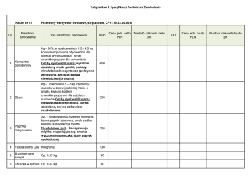 Załącznik nr 1 Specyfikacja Techniczna Zamówienia Pakiet nr 11 Lp. Przedmiot zamówienia Przetwory warzywno- owocowe, strączkowe, CPV: 15.33.00.00-0 Opis przedmiotu zamówienia Ilość Koncentrat pomidorowy Kg - 30%, w opakowaniach 1,5 - 4,5 kg konsystencja zwarta odpowiednia dla danego wyrobu zapach i smak charakterystyczny dla koncentratu Cechy dyskwalifikujace: wyraźnie osłabiony smak, gorzki, piekący, niewłaściwa konsystencja (półpłynna zżelowana, szklista ) barwa niewłaściwa (brunatna) 600 Dżem Kg - Opakowania 5 - 7 kg,fragmenty owoców w żelowej szklistej masie o smaku kwaśno słodkim charakterystycznym dla zużytych surowców Cechy dyskwalifikujace: niewłaściwa konsystencja, barwa osłabiona, owoce całkowicie rozdrobnione 350 3 Papryka marynowana Szt. - Opakowania 0,9 zalewa klarowna, barwa papryki czerwona, smak słodko kwaśny, konsystencja zwarta. Niewłaściwa jest - konsystencja miękka, rozpadająca się, smak z wyczuwalna goryczką, dużo papryki uszkodzonej 150 4 Fasola sucha „Jaś” Kilogramy 130 5 Brzoskwinia w syropie Op. 0,82 kg 90 6 Gruszka w syropie Op. 0,82 kg 80 1 2 Cena jedn. netto Wartość całkowita netto PLN pln VAT Cena jedn. brutto PLN Wartość całkowita brutto pln Załącznik nr 1 Specyfikacja Techniczna Zamówienia 7 Chrzan Op.0,2 kg 400 8 Fasola czerwona konserwowa Op. 0,42 kg 20 9 Szparagi w zalewie Op. 0,33 kg konserw. 60 10 Groszek konserwowy Op. 0,4kg 10 11 Kukurydza konserwowa Op. 0,4 kg 110 12 Miód naturalny porcyjny Op. 0,025 kg 400 13 Dżem porcyjny Op. 0,025 kg 150 14 Groch suchy Kilogramy 100 15 Oliwa z oliwek Op. 1 litr 6 16 Podgrzybek suszony Kilogramy 1 17 Pomidory bez skóry konserw. Op. 0,4 kg 60 18 Sok jabłkowy Op. 1 litr 30 19 Sok marchwiowy Op.1 litr 50 20 Sok pomidorowy Op. 1 litr 500 21 Sok wielowarzywny Op.1 litr 500 22 Sok pomarańczowy Op. 1 litr 90 23 Sok z czarnej porzeczki szt Op. 1 litr 50 Załącznik nr 1 Specyfikacja Techniczna Zamówienia 24 Syrop owocowy Op. 0,46 litra 25 Śliwka suszona Kilogramy 100 4 26 Ogórki konserwowe Op. 0,8 litra 140 27 Ananas w zalewie Op. 0,4 litra konserwowy 100 28 Fasola biała konserwowa 20 Op. 0,42 kg RAZEM: