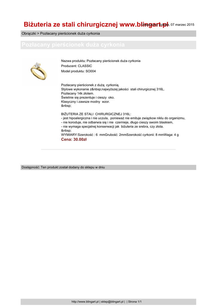 Utworzono: sobota, 07 marzec 2015 Biżuteria ze stali chirurgicznej www.blingart.pl Obrączki > Pozłacany pierścionek duża cyrkonia Pozłacany pierścionek duża cyrkonia Nazwa produktu: Pozłacany pierścionek duża cyrkonia Producent: CLASSIC Model produktu: SO004 Pozłacany pierścionek z dużą cyrkonią. Stylowe wykonanie z najwyższej jakości stali chirurgicznej 316L. Pozłacany 14k złotem. Świetnie się prezentuje i cieszy oko. Klasyczny i zawsze modny wzor. BIŻUTERIA ZE STALI CHIRURGICZNEJ 316L: - jest hipoalergiczna i nie uczula, ponieważ nie emituje związkow niklu do organizmu, - nie koroduje, nie odbarwia się i nie czernieje, długo cieszy swoim blaskiem, - nie wymaga specjalnej konserwacji jak biżuteria ze srebra, czy złota. WYMIARY:Szerokość : 6 mmGrubość: 2mmSzerokość cyrkonii: 8 mmWaga: 4 g Cena: 30.00zł Dostępność: Ten produkt został dodany do sklepu w dniu http://www.blingart.pl | [email protected] | | Strona 1/1