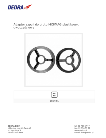 Adaptor szpuli do drutu MIG/MAG plastikowy, dwuczęściowy DESMI01 DEDRA EXIM Millenium Logistic Park A2 ul. 3-go Maja 8 05-800 Pruszków tel. 22 738 37 77 fax. 22 738 37 79 www.dedra.pl e-mail: [email protected]