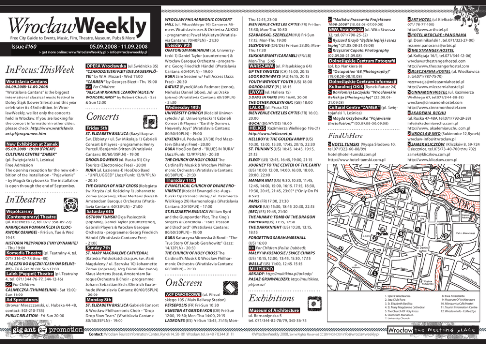WrocławWeekly Free City Guide to Events, Music, Film, Theatre, Museum, Pubs & More Issue #160 05.09.2008 - 11.09.2008 > get more online: www.WroclawWeekly.pl > [email protected] InFocus:ThisWeek Wratislavia Cantans 04.09.2008-14.09.2008 “Wratislavia Cantans” is the biggest international classical music festival in Dolny Śląsk (Lower Silesia) and this year celebrates its 43rd edition. In WroclawWeekly, we list only the concerts held in Wrocław. If you are looking for the concert information in other cities, please check: http://www.wratislavia. art.pl/programen.htm New Exhibition at Zamek 05.09.2008 - 19:00 (Friday) Cultural Centre “ZAMEK” (pl. Świętojański 1, Leśnica) Free Admission The opening reception for the new exhibition of the installation - “Pojawienie” - by Magda Grzybowska. The installation is open through the end of September. InTheatres Współczesny (Contemporary) Theatre (ul. Rzeźnicza 12, tel. 071/ 358-89-22) Nakręcana pomarańcza (A Clockwork Orange) - Fri-Sun, Tue & Wed 19:15 Historia przypadku (Tiny Dynamite) - Thu 19:00 Komedia Theatre (pl. Teatralny 4, tel. 071/ 316-07-78 thru -80) Z rączki do rączki (Cash On Delivery) - Fri & Sat 20:00; Sun 17:00 Lalek (Puppet) Theatre (pl. Teatralny 4, tel. 071/ 344-76-77, 344-12-16) >> For Children: Calineczka (Thumbelina) - Sat 15:00; Sun 11:00 Ad Spectatores (Browar Mieszczanski, ul. Hubska 44-48, contact: 502-210-735) Public Relation - Fri-Sun 20:00 OPERA Wrocławska (ul.Świdnicka 35) “Czarodziejski flet (Die Zauberflöte)” by W.A. Mozart - Wed 11:00 “Carmen” by Georges Bizet - Thu 19:00 >> For Children: “Alicja w Krainie Czarów (Alice in Wonderland)” by Robert Chauls - Sat & Sun 12:00 Concerts Friday 5th ST. ELIZABETH BASILICA (Bazylika p.w. Św. Elżbiety / ul. Św. Mikołaja 1) Gabrieli Consort & Players - programme: Henry Purcell /Benjamin Britten (Wratislavia Cantans: 80/60/35PLN) - 19:00 DROGA DO MEKKI (ul. Ruska 51) City Tourists (Electronica: Free) - 20:00 RURA (ul. Łazienna 4) HooDoo Band - “UNPLUGGED” (Jazz/Funk: 12/9/7PLN) - 20:30 THE CHURCH OF HOLY CROSS (Kolegiata św. Krzyża / pl. Kościelny 1) Johannette Zomer (soprano), Klaus Mertens (bass) & Amsterdam Baroque Orchestra (Wratislavia Cantans: 60/35PLN) - 21:00 Saturday 6th OSTRÓW TUMSKI Olga Pasiecznik (soprano), Daniel Taylor (countertenor), Gabrieli Players & Wrocław Baroque Orchestra - programme: Georg Friedrich Händel (Wratislavia Cantans: Free) - 21:00 Sunday 7th ST. MARY MAGDALENE CATHEDRAL (Katedra Polskokatolicka p.w. św. Marii Magdaleny / ul. Szewska 10) Johannette Zomer (soprano), Jörg Dürmüller (tenor), Klaus Mertens (bass), Amsterdam Baroque Orchestra & Choir - programme: Johann Sebastian Bach /Dietrich Buxtehude (Wratislavia Cantans: 80/60/35PLN) - 20:00 Monday 8th ST. ELIZABETH BASILICA Gabrieli Consort & Wrocław Philharmonic Choir - “Drop Drop Slow Tears” (Wratislavia Cantans: 80/60/35PLN) - 19:00 WROCŁAW PHILHARMONIC CONCERT HALL (ul. Piłsudskiego 19) Cantores Minores Wratislavienses & Orkiestra AUKSO - programme: Paweł Mykietyn (Wratislavia Cantans: 70/40PLN) - 21:30 Thu 12:15, 23:00 Bienvenue chez les Ch’tis (FR) Fri-Sun 15:30; Mon-Thu 10:30 Szabadság, szerelem (HU) Fri-Sun 17:15; Mon-Thu 19:00 Tuesday 9th Suzhou He (CN/DE) Fri-Sun 23:00; MonORATORIUM MARIANUM (pl. UniwersyThu 17:30 tecki 1) Daniel Taylor (countertenor) & Sukkar banat (Caramel) (FR/LB) Wrocław Baroque Orchestra - programMon-Thu 15:45 me: Georg Friedrich Händel (Wratislavia WARSZAWA (ul. Piłsudskiego 64) Cantans: 60/40PLN) - 19:00 Up the Yangtze (CA) 16:00, 20:15 RURA Jam Session w/ Full Access (Jazz: Look Both Ways (AU)16:15, 20:15 Free) - 20:30 Youth Without Youth (US) 18:00 RATUSZ (Rynek) Mark Padmore (tenor), Ogród Luizy (PL) 18:15 Nicholas Daniel (oboe), Julius Drake LWOW (ul. Hallera 15) (piano) (Wratislavia Cantans: 60/30PLN) 2 Days in Paris (FR) 16:00, 20:00 - 21:30 The Other Boleyn Girl (GB) 18:00 Wednesday 10th LALKA (ul. Prusa 32) UNIVERSITY CHURCH (Kościół UniwerBienvenue chez les Ch’tis (FR) 16:00, sytecki / pl. Uniwersytecki 1) Gabrieli 20:00 Consort & Players - “Earthly Sorrows, Guca! (BG/AT/DE) 18:00 Heavenly Joys” (Wratislavia Cantans: HELIOS (Kazimierza Wielkiego 19a-21) 80/60/40PLN) - 19:00 http://www.heliosnet.pl ŁYKEND (ul. Podwale 37/38) Pod MaszHellboy II: The Golden Army (US) tem (Shanty: Free) - 20:00 10:30, 13:00, 15:30, 17:45, 20:15, 22:30 RURA HooDoo Band - “BLUES IN RURA” St. Trinian’s (US) 10:45, 14:45, 19:15, (Jazz/Funk: 12/9/7PLN) - 20:30 21:15 THE CHURCH OF HOLY CROSS The Elegy (US) 12:45, 16:45, 19:00, 21:15 Cardinall’s Musick & Wrocław PhilharJourney to the Center of the Earth monic Orchestra (Wratislavia Cantans: (US) 10:00, 12:00, 14:00, 16:00, 18:00, 60/30PLN) - 21:30 20:00, 22:00 Thursday 11th Mamma Mia! (US) 9:30, 10:30, 11:45, EVANGELICAL CHURCH OF DIVINE PRO12:45, 14:00, 15:00, 16:15, 17:15, 18:30, VIDENCE (Kościół Ewangelicko-Augs19:30, 20:45, 21:45, 23:00* (*Only On Fri burski Opatrzności Bożej / ul. Kazimierza & Sat) Wielkiego 29) Harmonologia (Wratislavia Paris (FR) 17:00, 21:30 Cantans: 20/10PLN) - 17:00 Awake (US) 15:30, 18:45, 20:30, 22:15 pl. Jana ST. ELIZABETH BASILICA William Byrd [REC] (ES) 19:45, 21:30 Pawła II and the Gunpowder Plot, The King’s The Mummy: Tomb of the Dragon Singers & Concordia - “1605 Treason Emperor (US) 11:15, 17:30 1. Opera Wrocławska 2. JazzThe ClubDark Rura Knight (US) 10:30, 13:15, and Dischord” (Wratislavia Cantans: 3. University 80/60/30PLN) - 19:00 18:15 Church RURA Katarzyna Mirowska & Band - “The 4. Arsenał Forgetting Sarah Marshall 5. Helios Cinema True Story Of Jacob Gershowitz” (Jazz: (US) 16:00 6. Mleczarnia Café/Hostel & 14/12PLN) - 20:30 >> For"Under Children (Polish Dubbed): Synagogue A White Stork" THE CHURCH OF HOLY CROSS The Małpy w kosmosie / Space Chimps 7. Museum of Architecture 8. BWA(US) Awandarda Cardinall’s Musick & Wrocław Philhar10:15, 12:00, 13:45, 15:30, 17:15 9. Galeria E