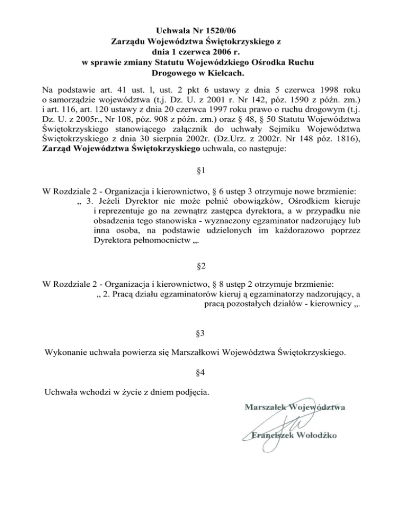 Uchwala Nr 1520/06 Zarządu Województwa Świętokrzyskiego z dnia 1 czerwca 2006 r. w sprawie zmiany Statutu Wojewódzkiego Ośrodka Ruchu Drogowego w Kielcach. Na podstawie art. 41 ust. l, ust. 2 pkt 6 ustawy z dnia 5 czerwca 1998 roku o samorządzie województwa (t.j. Dz. U. z 2001 r. Nr 142, póz. 1590 z późn. zm.) i art. 116, art. 120 ustawy z dnia 20 czerwca 1997 roku prawo o ruchu drogowym (t.j. Dz. U. z 2005r., Nr 108, póz. 908 z późn. zm.) oraz § 48, § 50 Statutu Województwa Świętokrzyskiego stanowiącego załącznik do uchwały Sejmiku Województwa Świętokrzyskiego z dnia 30 sierpnia 2002r. (Dz.Urz. z 2002r. Nr 148 póz. 1816), Zarząd Województwa Świętokrzyskiego uchwala, co następuje: §1 W Rozdziale 2 - Organizacja i kierownictwo, § 6 ustęp 3 otrzymuje nowe brzmienie: „ 3. Jeżeli Dyrektor nie może pełnić obowiązków, Ośrodkiem kieruje i reprezentuje go na zewnątrz zastępca dyrektora, a w przypadku nie obsadzenia tego stanowiska - wyznaczony egzaminator nadzorujący lub inna osoba, na podstawie udzielonych im każdorazowo poprzez Dyrektora pełnomocnictw „. §2 W Rozdziale 2 - Organizacja i kierownictwo, § 8 ustęp 2 otrzymuje brzmienie: „ 2. Pracą działu egzaminatorów kieruj ą egzaminatorzy nadzorujący, a pracą pozostałych działów - kierownicy „. §3 Wykonanie uchwała powierza się Marszałkowi Województwa Świętokrzyskiego. §4 Uchwała wchodzi w życie z dniem podjęcia.
